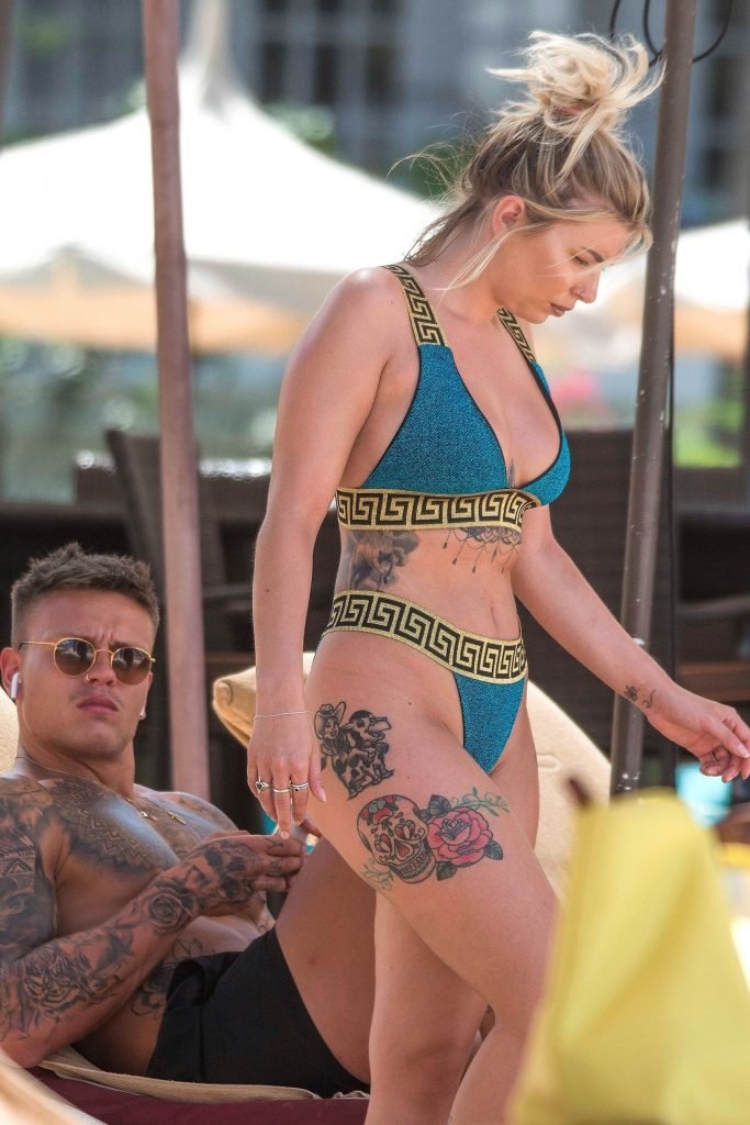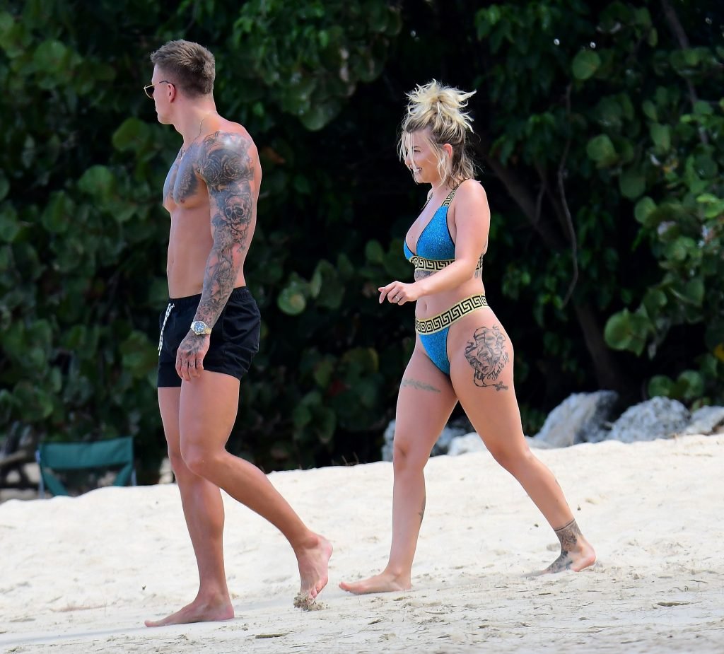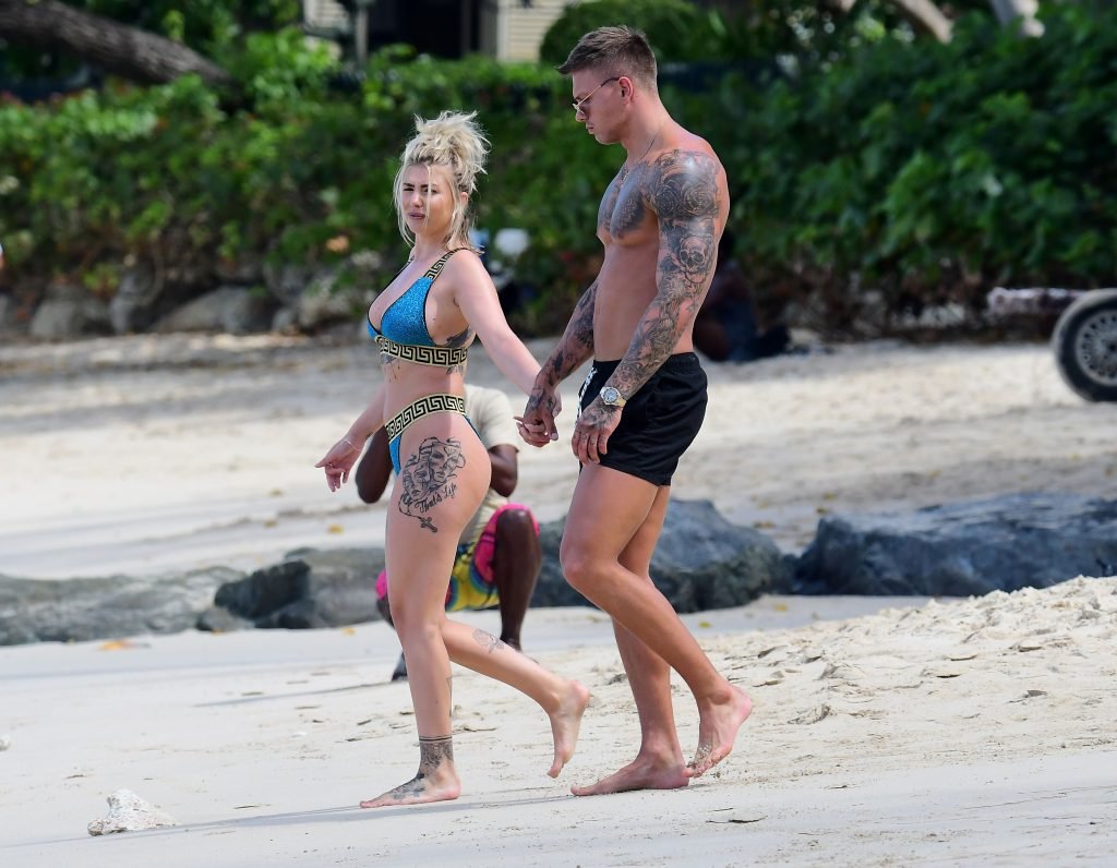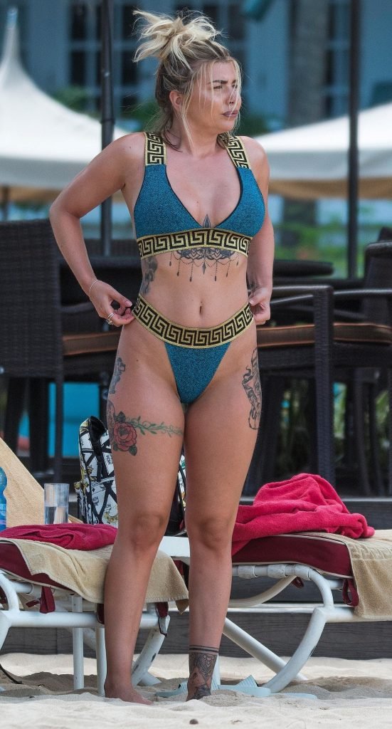 A estrela de Love Island e modelo Olivia Buckland passou um tempo com seu namorado Alex Bowen na praia em Barbados, 19/03/2018. Olivia Buckland exibiu seu grande bumbum em um biquíni azul com ornamento. Ela está trabalhando para os paparazzi.