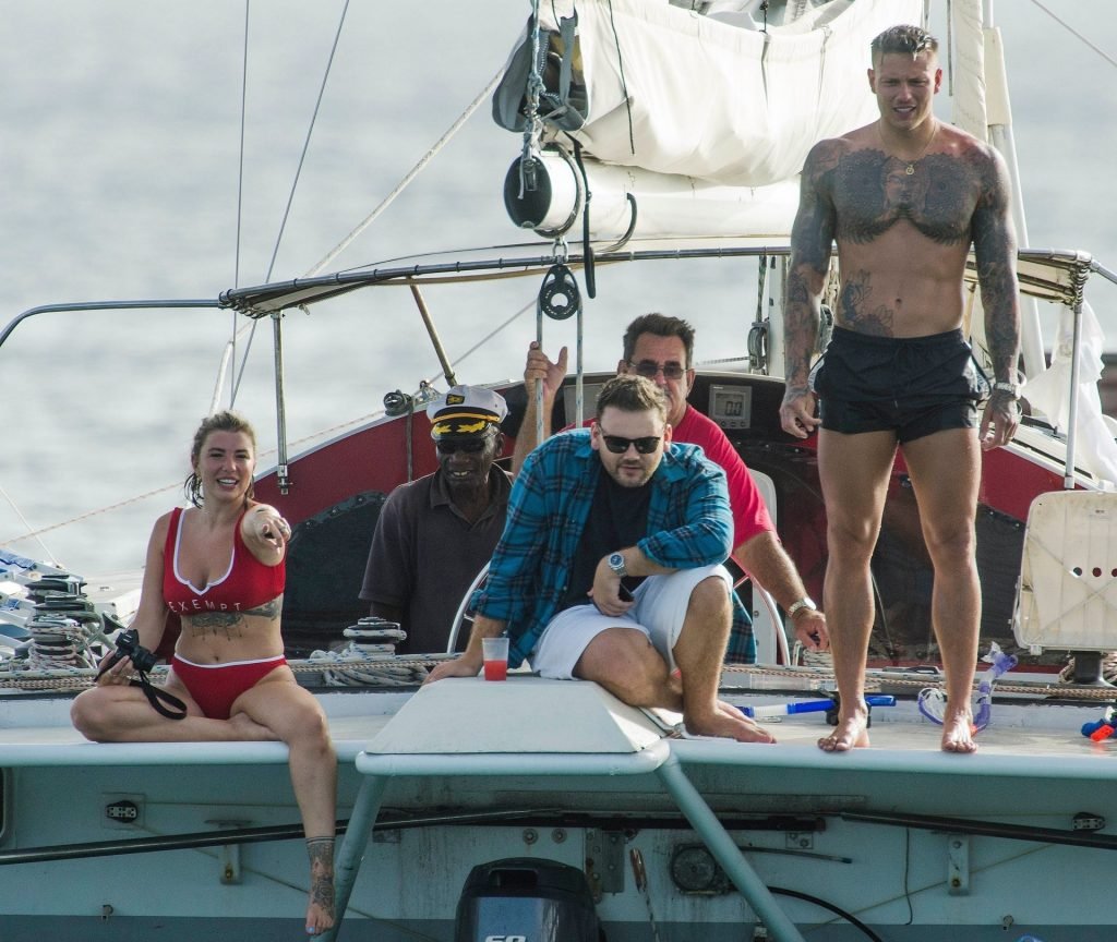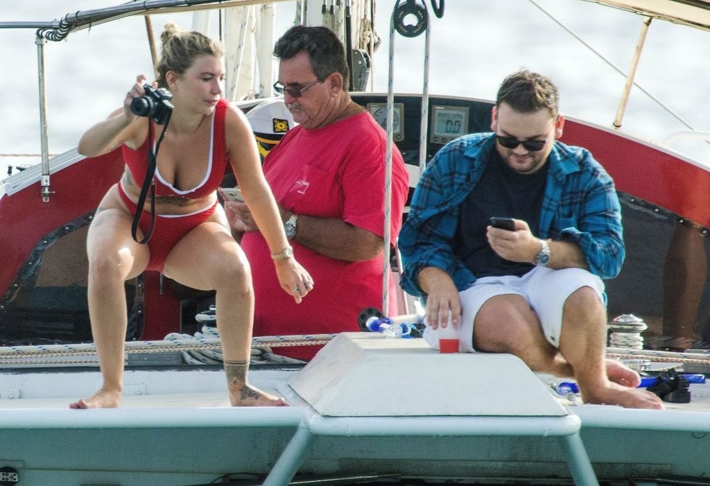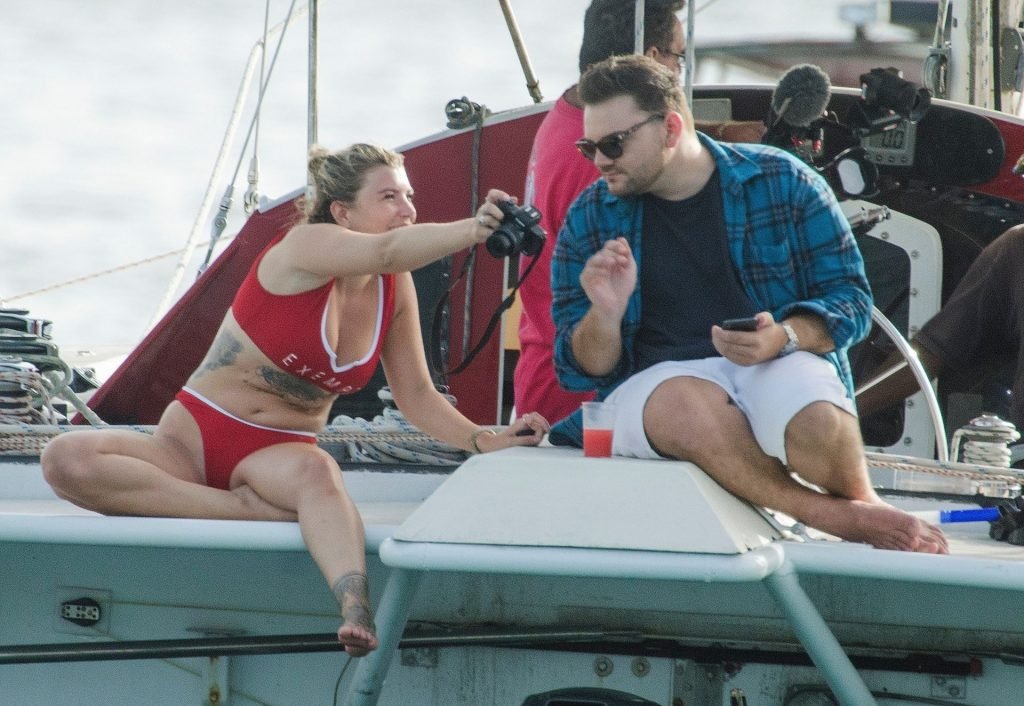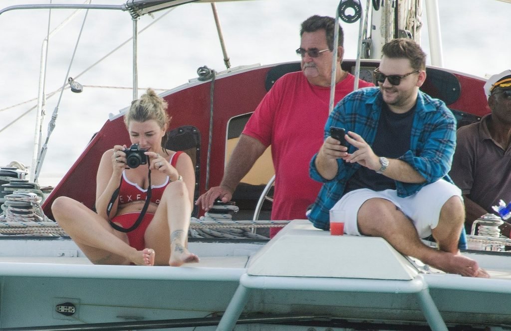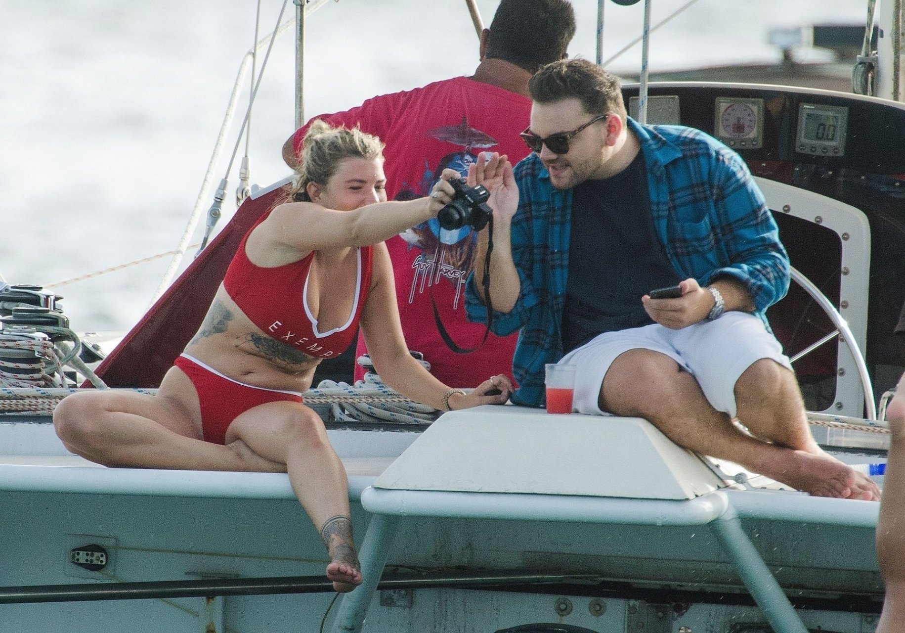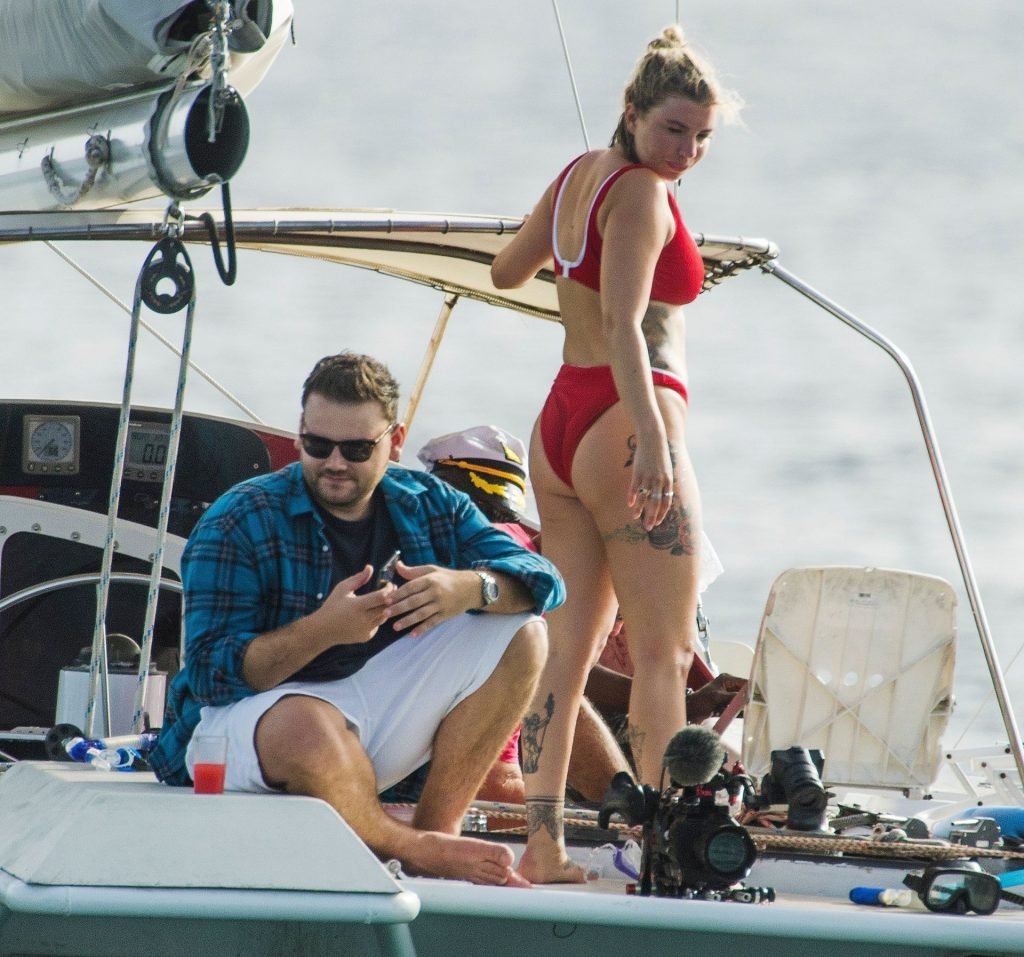 Estrelas de reality show Olivia Buckland e Alex Bowen foram vistos durante uma sessão de filmagem a bordo de um barco no final da tarde de quinta-feira em Barbados, 25/07/2019.