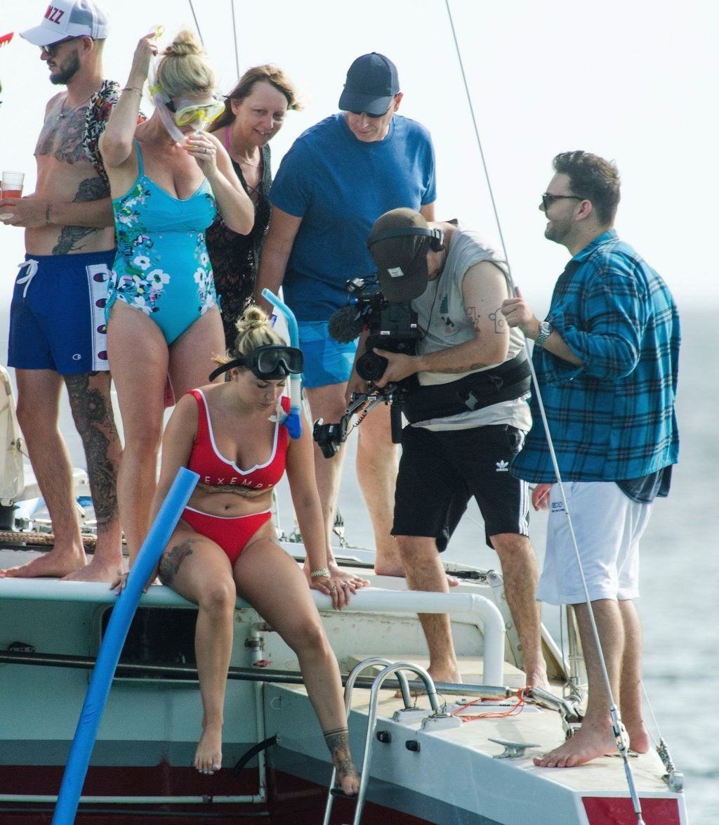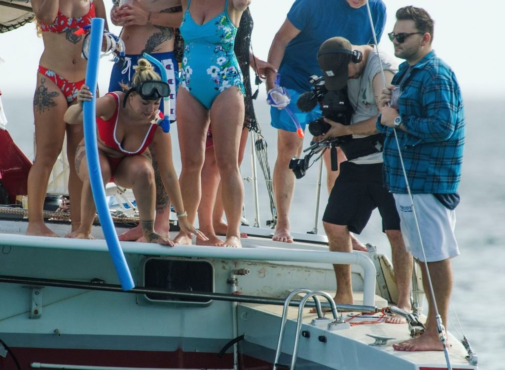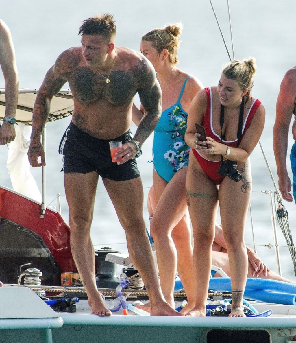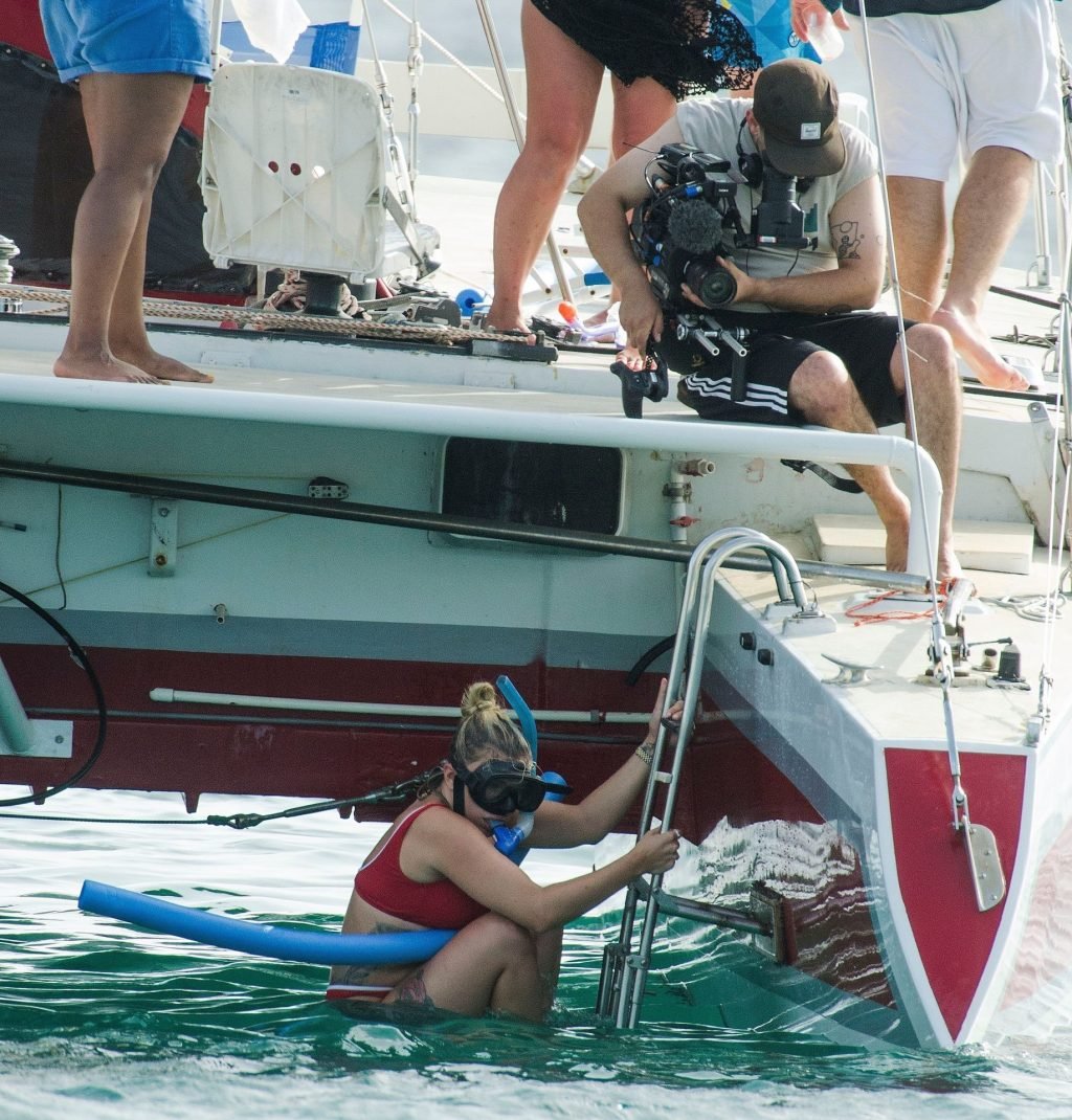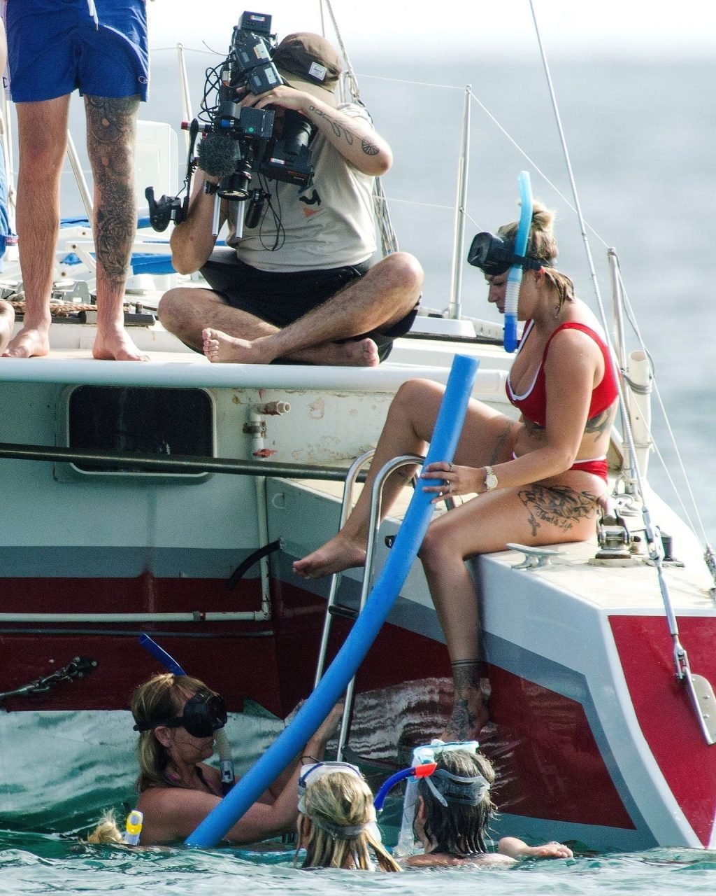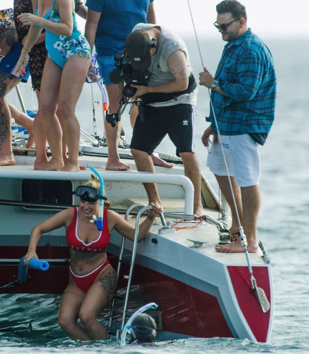 Estrelas de reality show Olivia Buckland e Alex Bowen foram vistos durante uma sessão de filmagem a bordo de um barco no final da tarde de quinta-feira em Barbados, 25/07/2019.