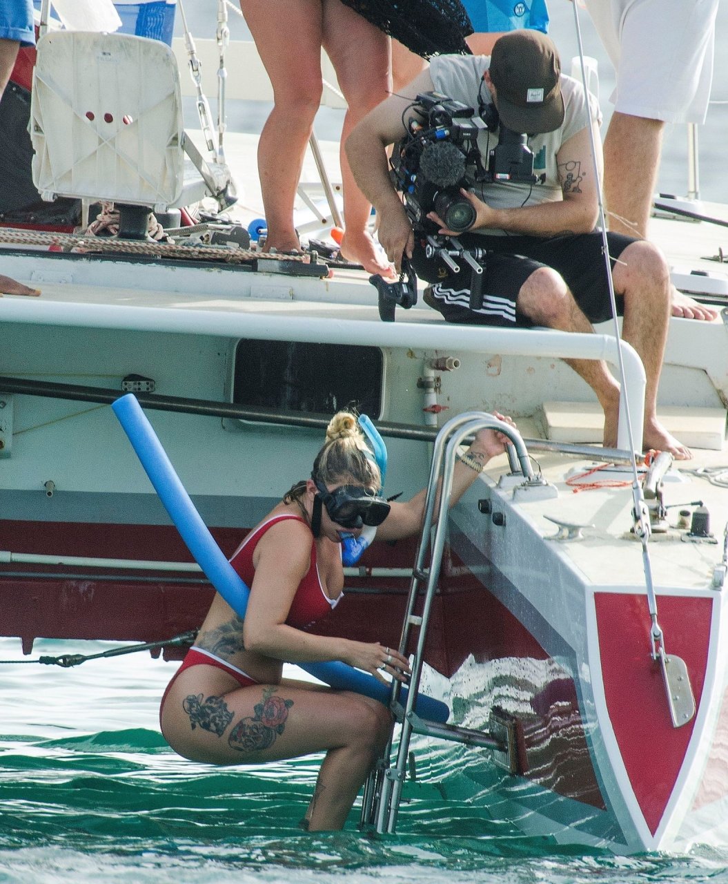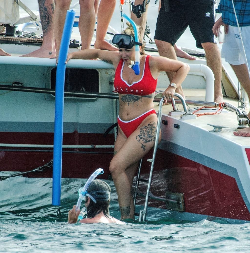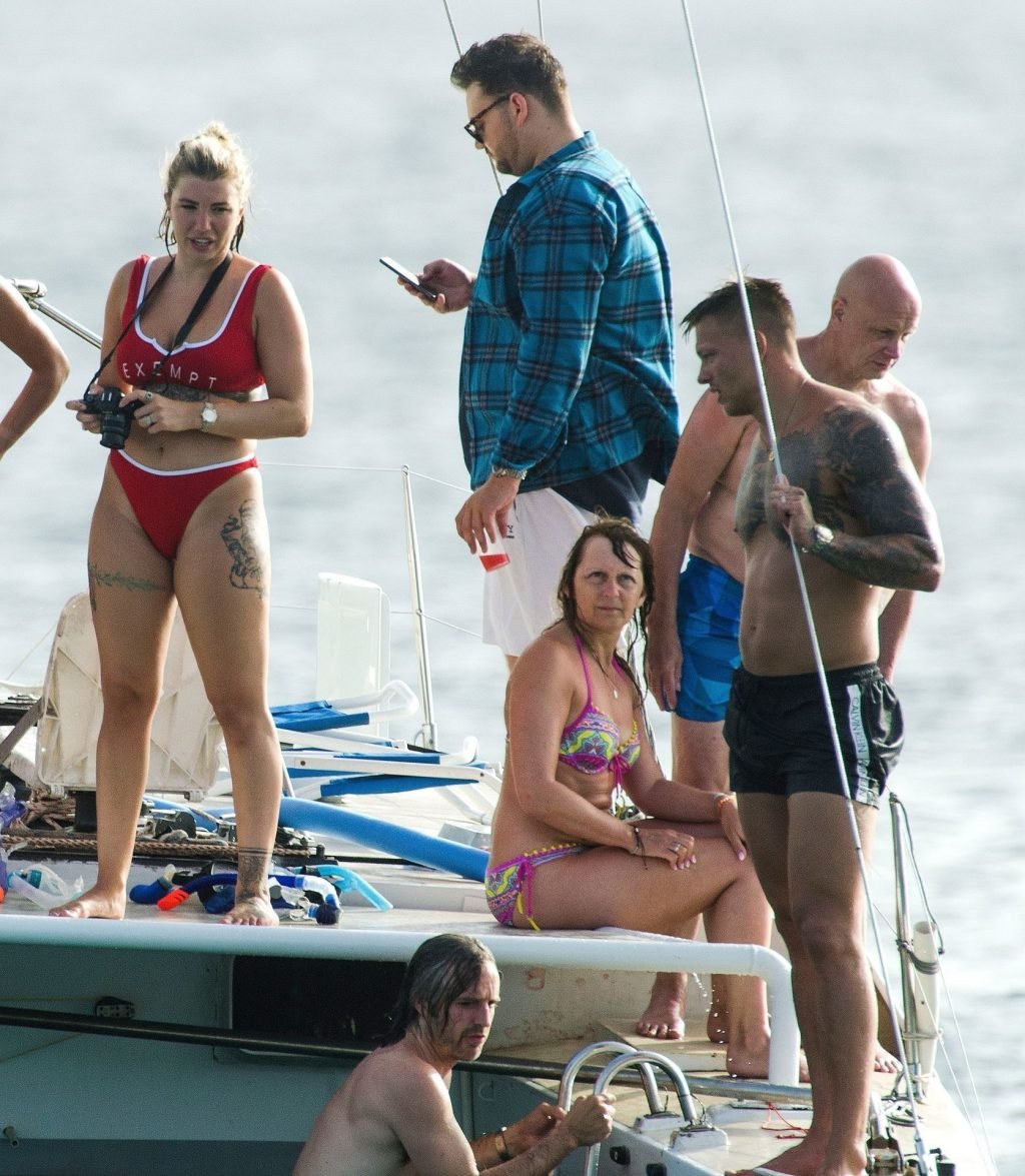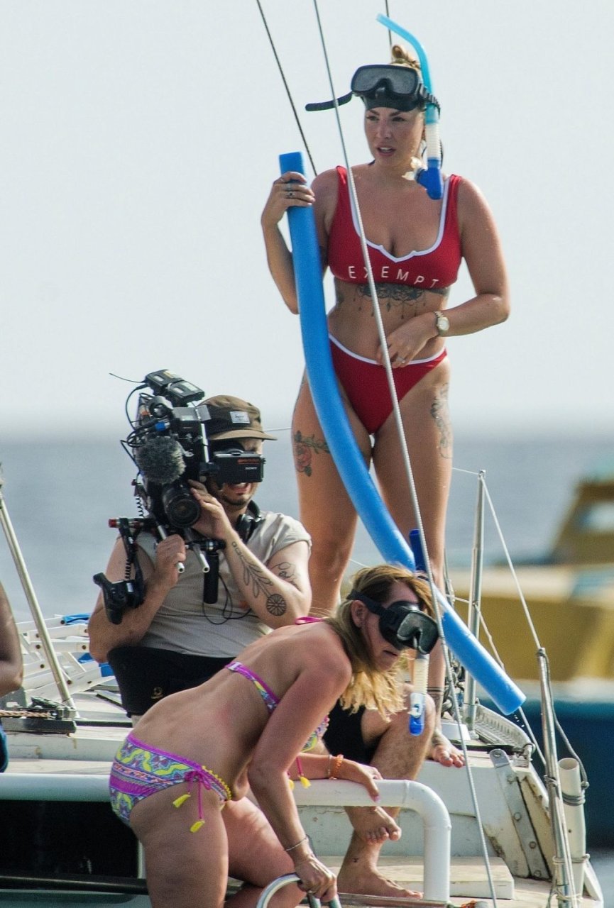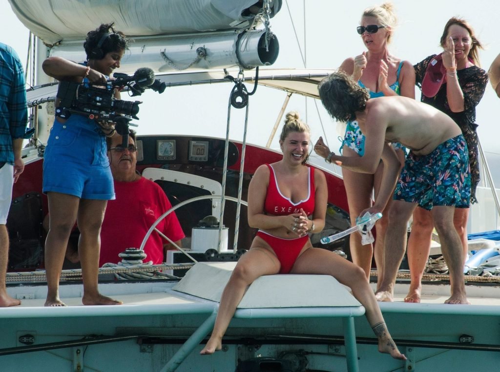 Estrelas de reality show Olivia Buckland e Alex Bowen foram vistos durante uma sessão de filmagem a bordo de um barco no final da tarde de quinta-feira em Barbados, 25/07/2019.