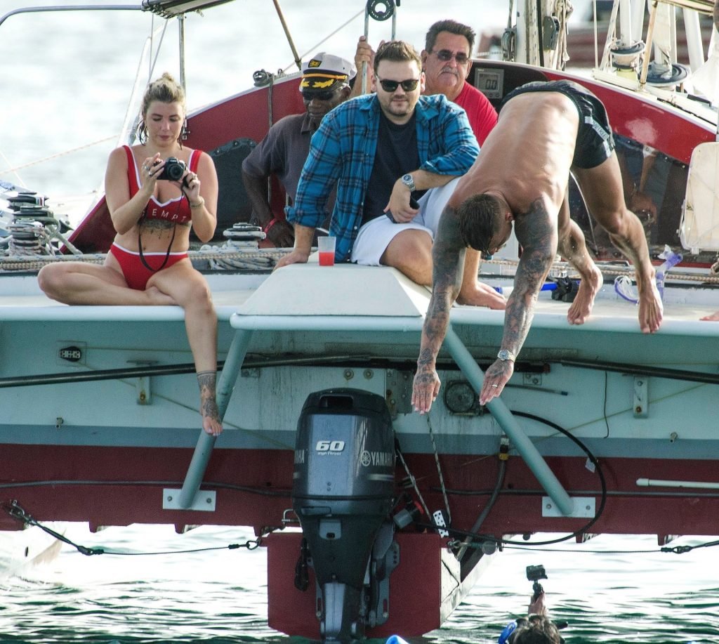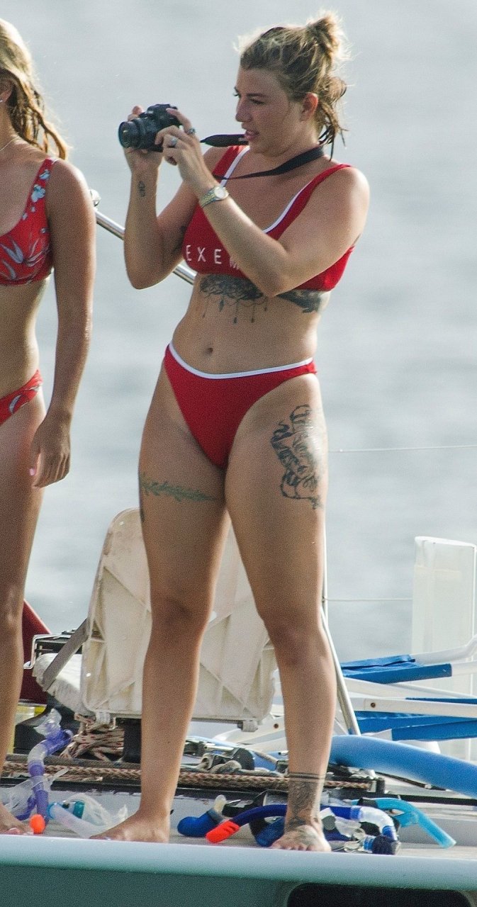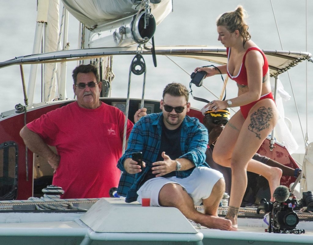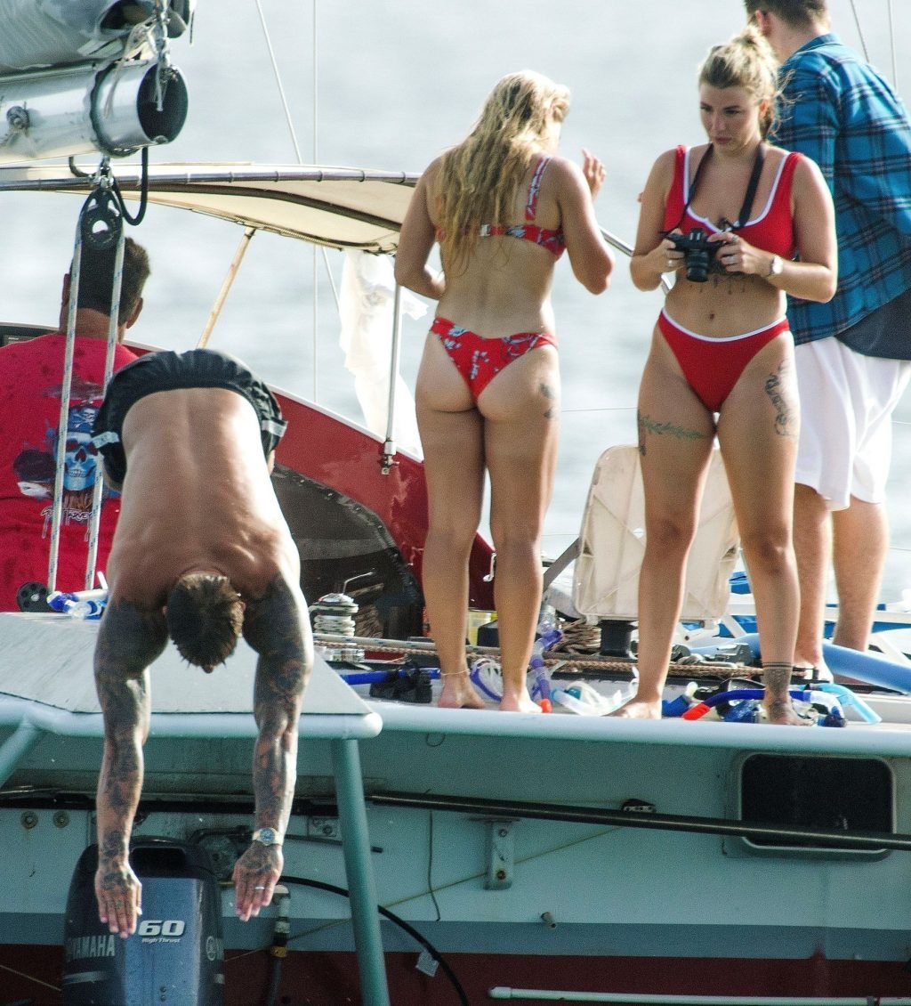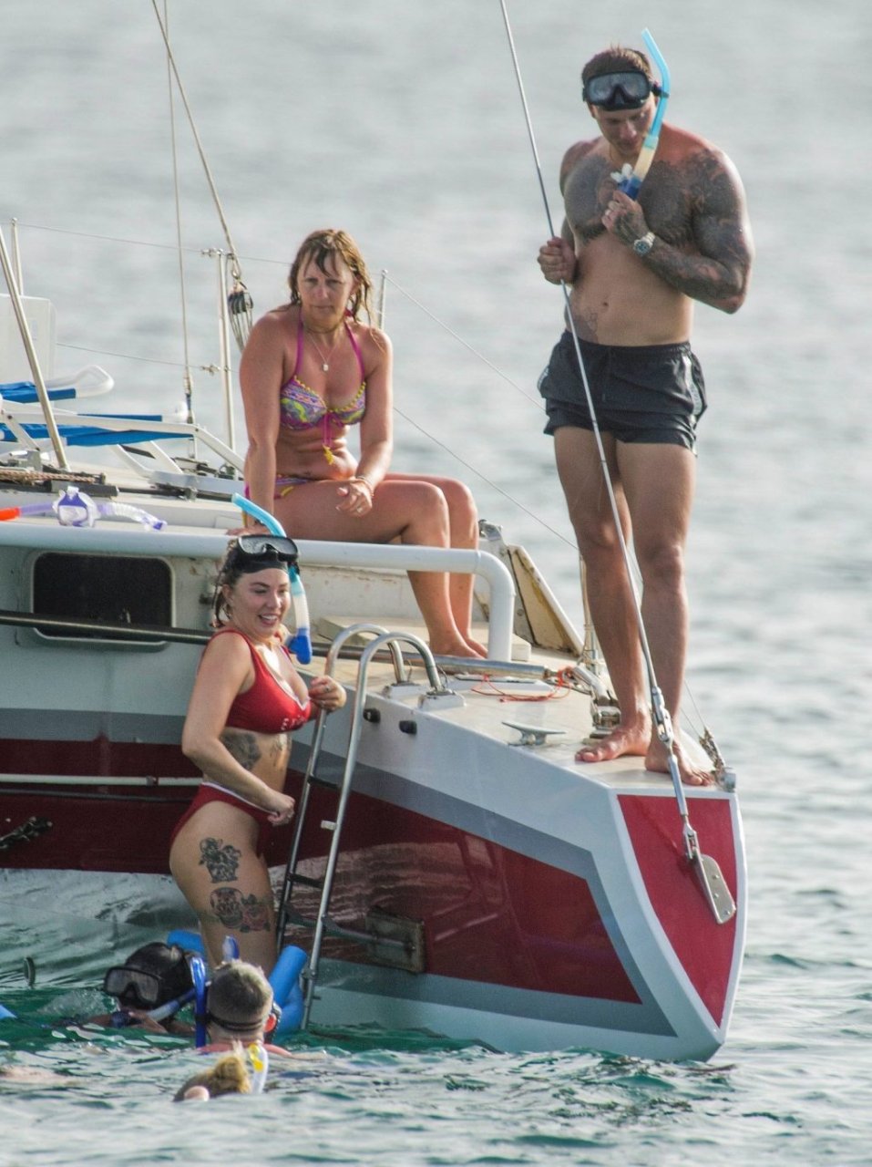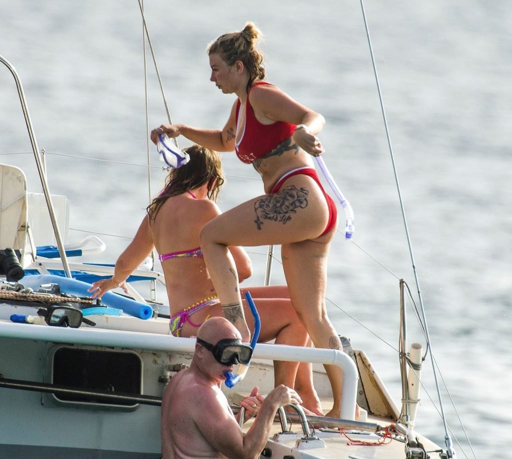 Estrelas de reality show Olivia Buckland e Alex Bowen foram vistos durante uma sessão de filmagem a bordo de um barco no final da tarde de quinta-feira em Barbados, 25/07/2019.