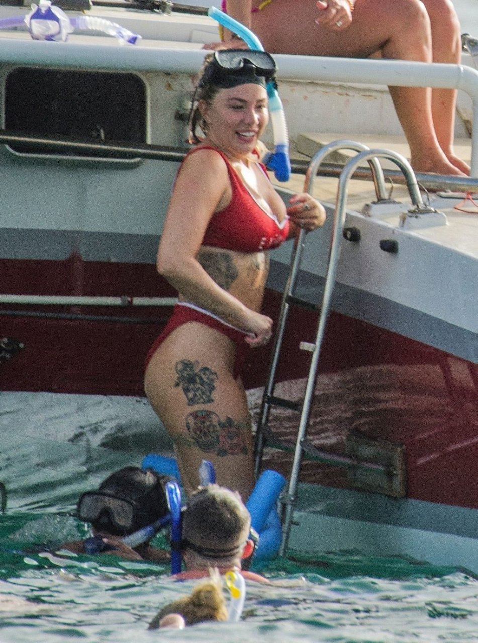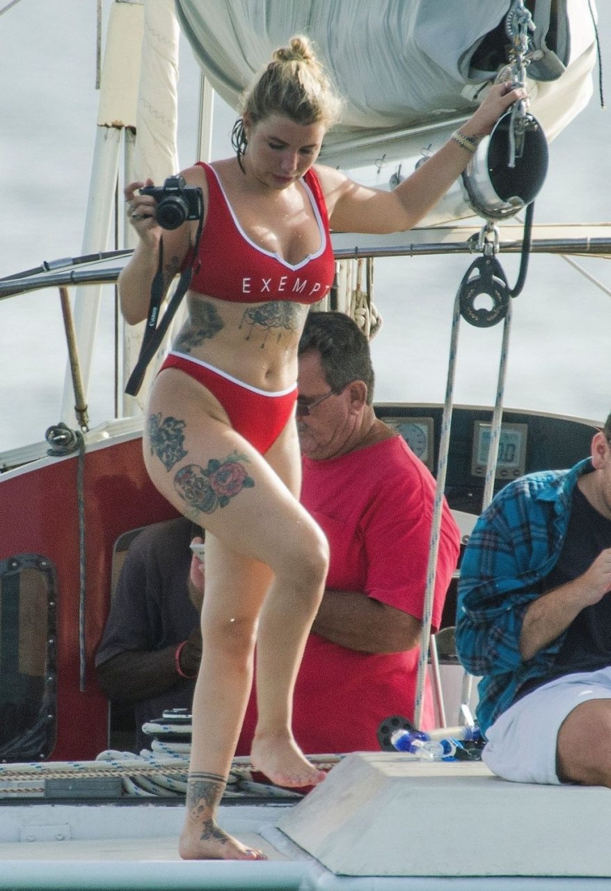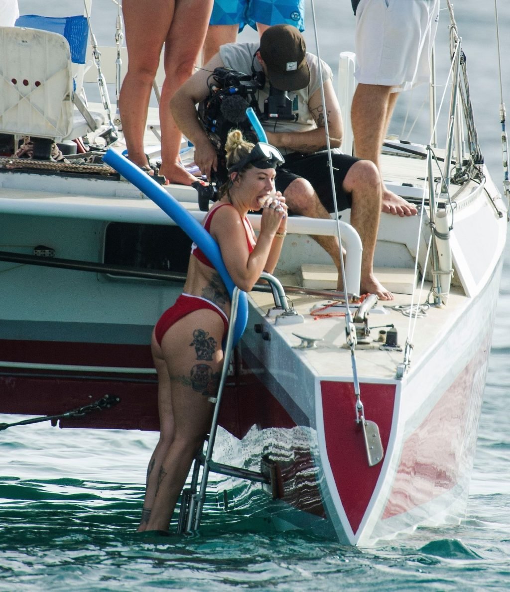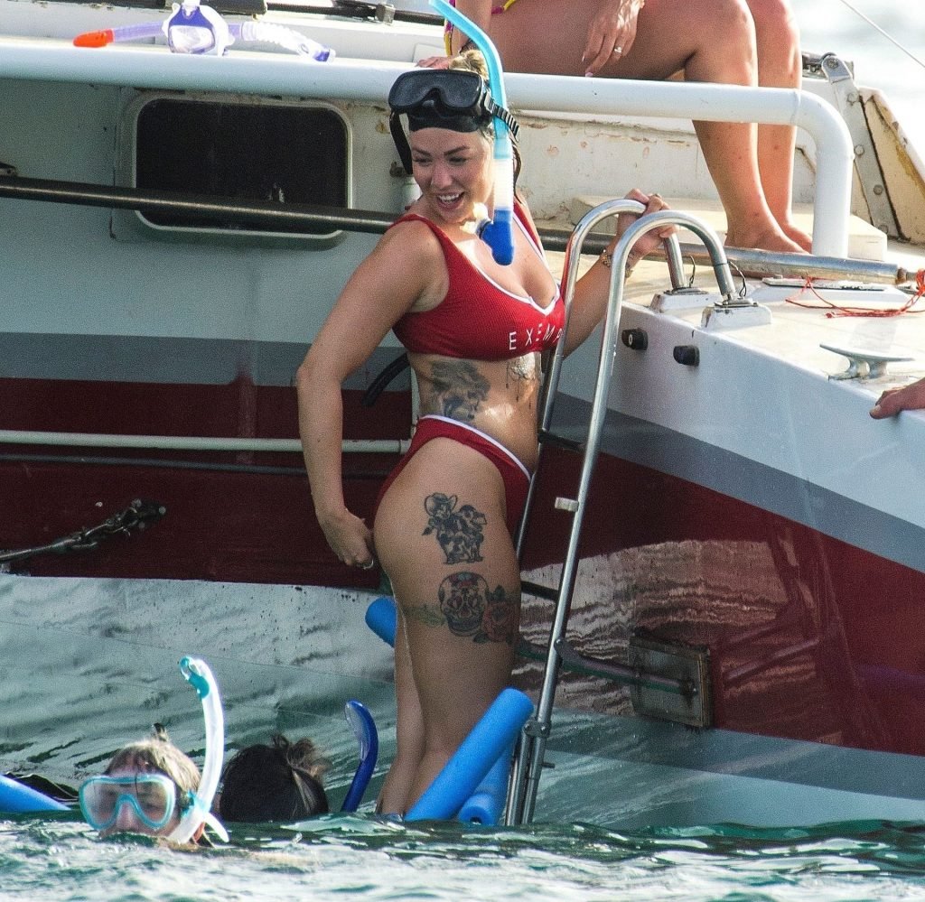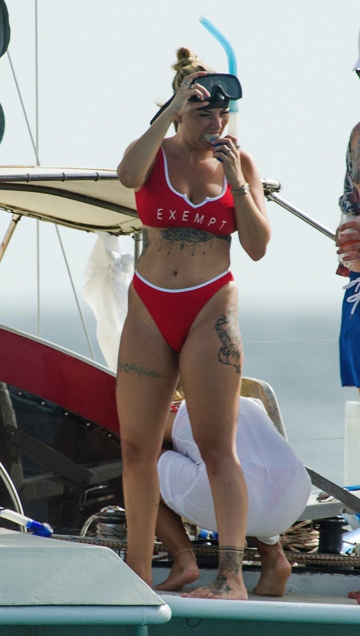 Estrelas de reality show Olivia Buckland e Alex Bowen foram vistos durante uma sessão de filmagem a bordo de um barco no final da tarde de quinta-feira em Barbados, 25/07/2019.