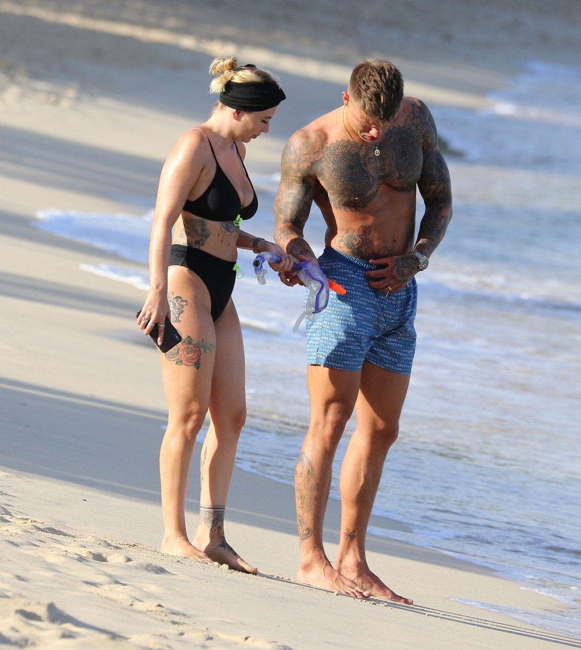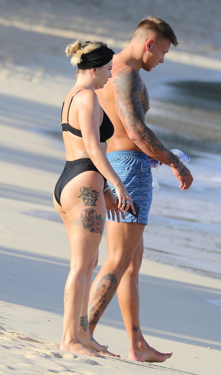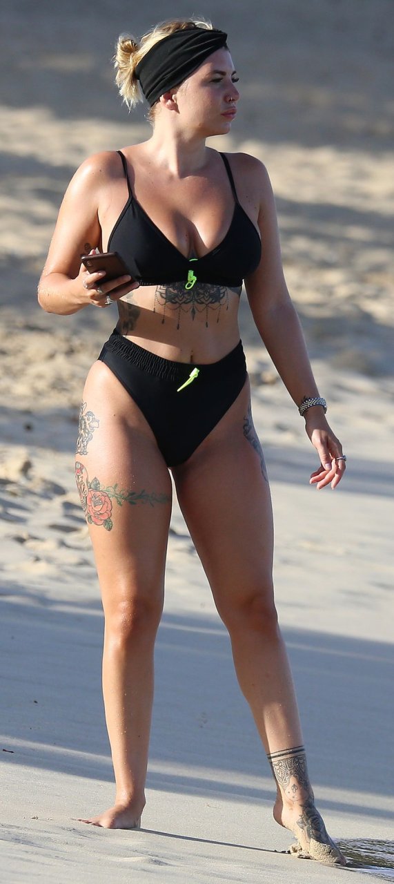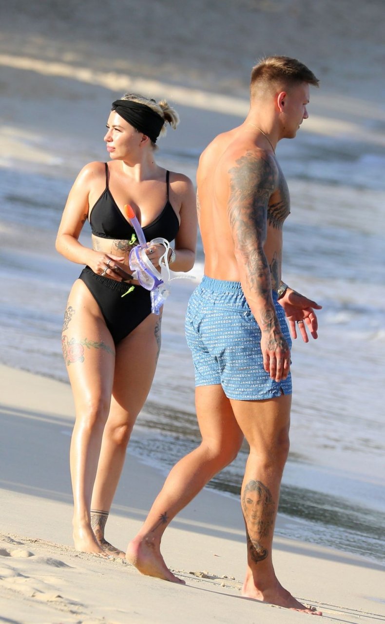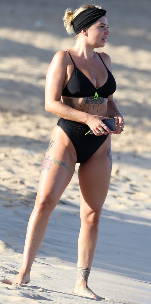 “Love Island” Olivia Buckland parece fenomenal em um biquíni preto enquanto aproveita a praia com o marido Alex para assisti-lo fazer snorkeling em Barbados, 24/07/2019.