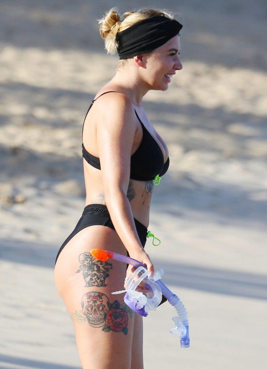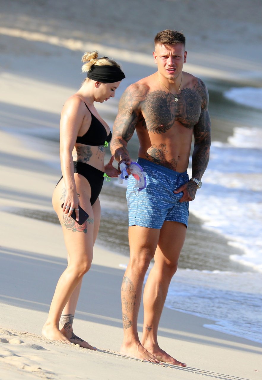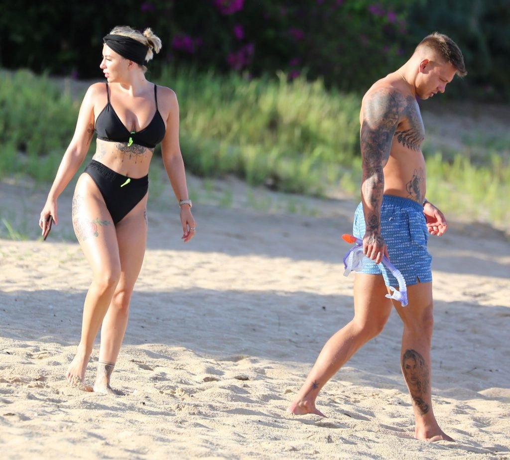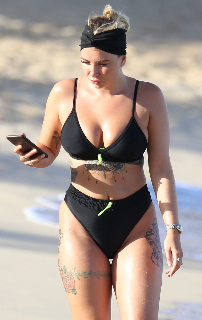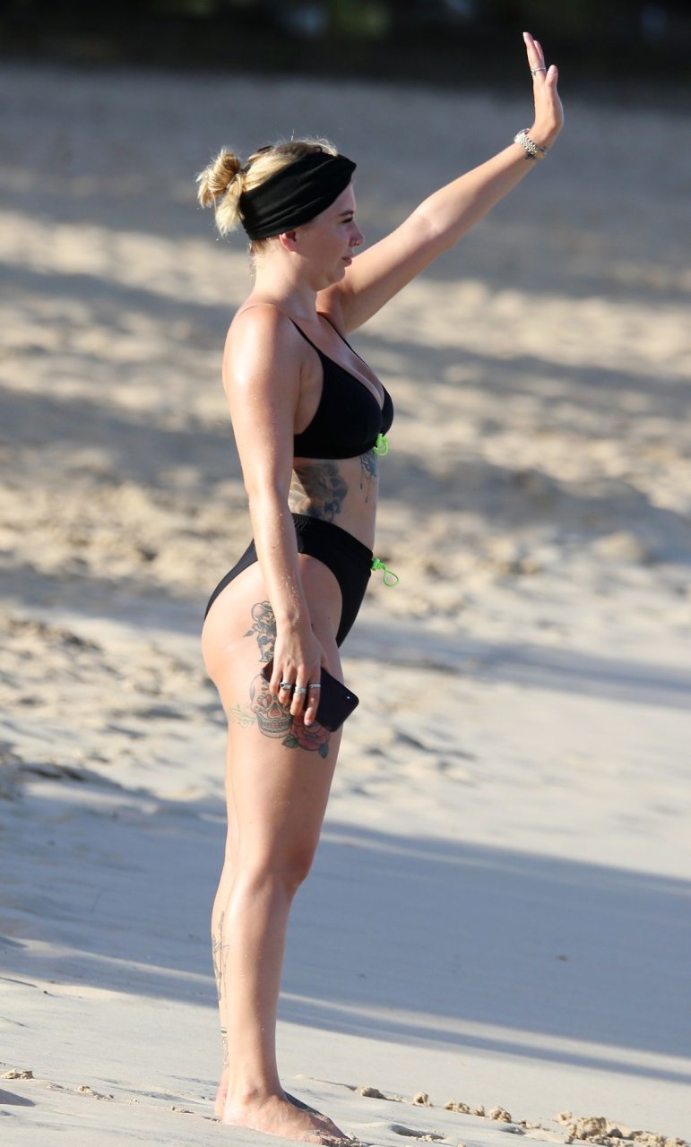 “Love Island” Olivia Buckland parece fenomenal em um biquíni preto enquanto aproveita a praia com o marido Alex para assisti-lo fazer snorkeling em Barbados, 24/07/2019.