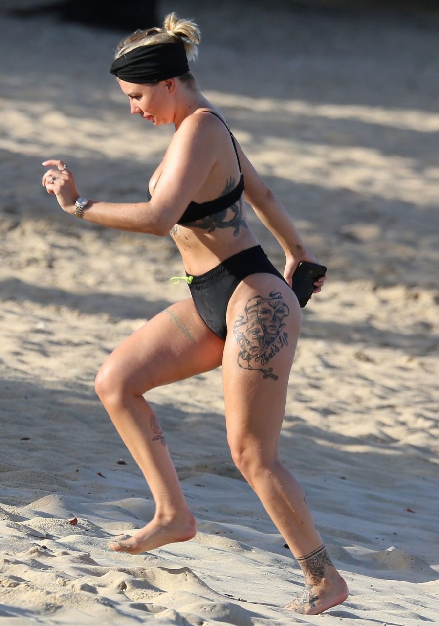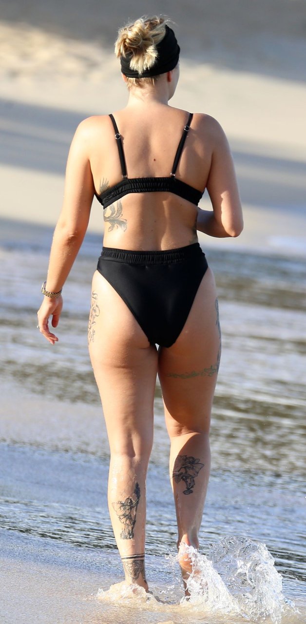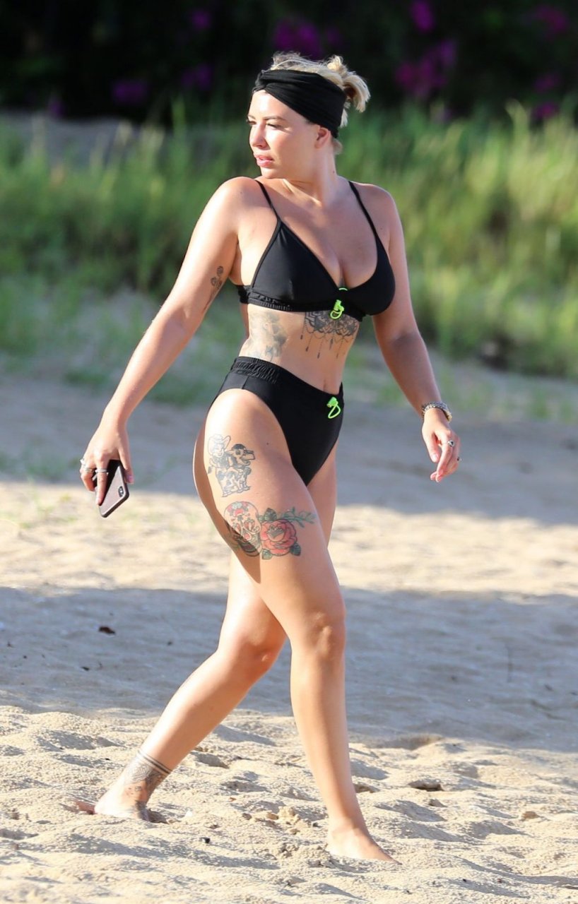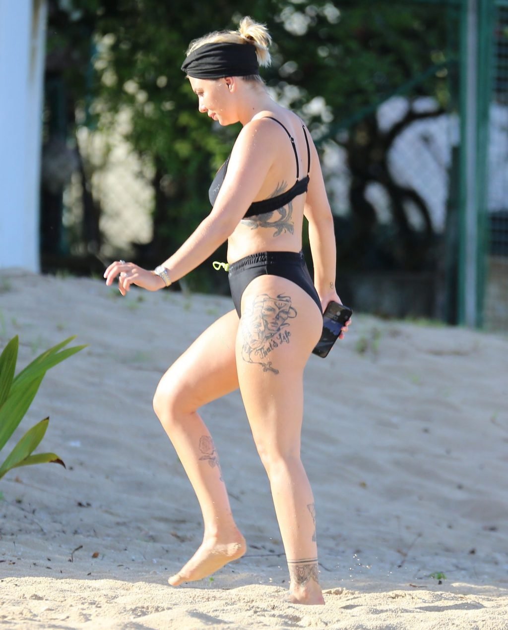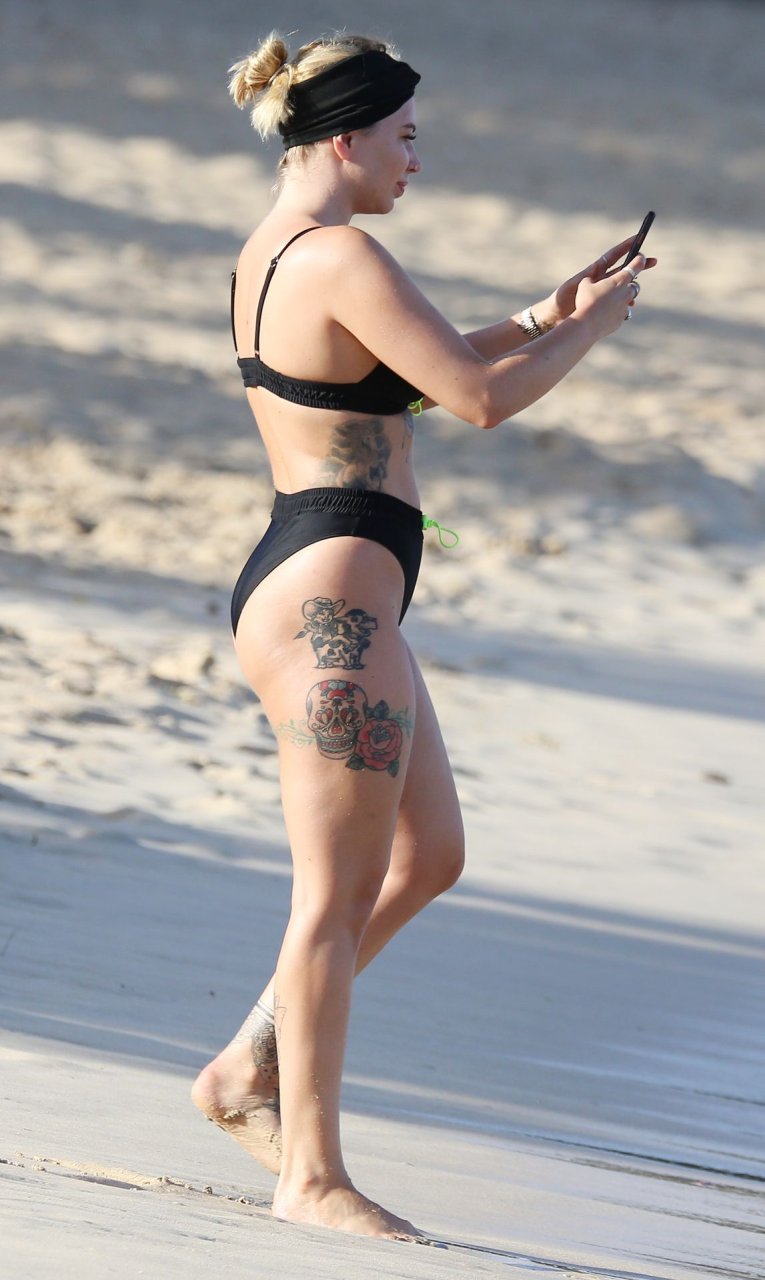 “Love Island” Olivia Buckland parece fenomenal em um biquíni preto enquanto aproveita a praia com o marido Alex para assisti-lo fazer snorkeling em Barbados, 24/07/2019.