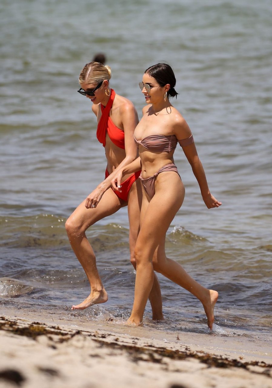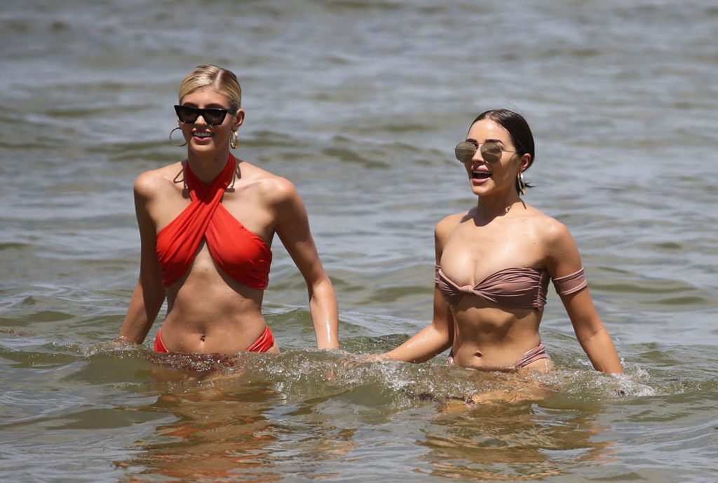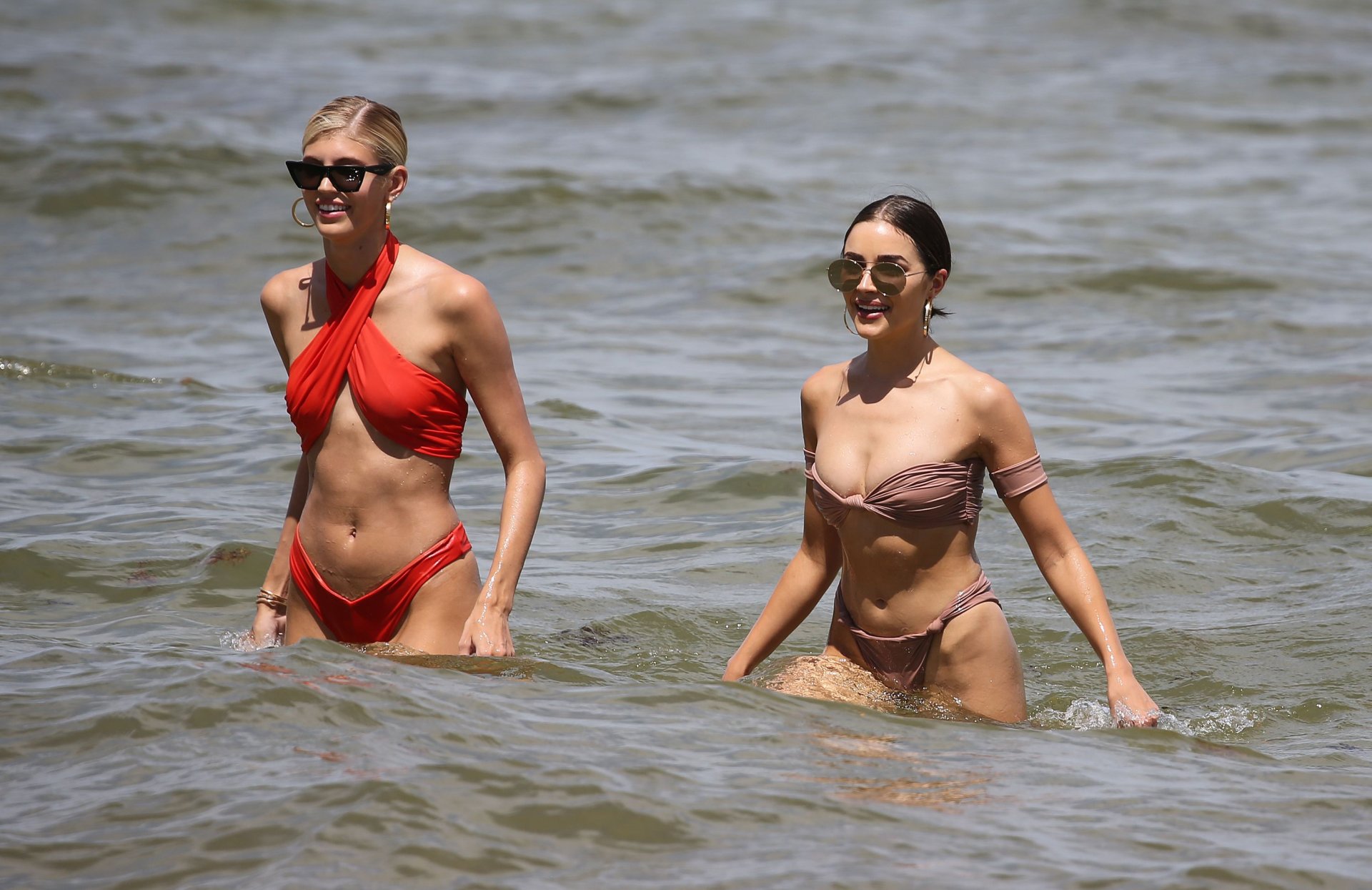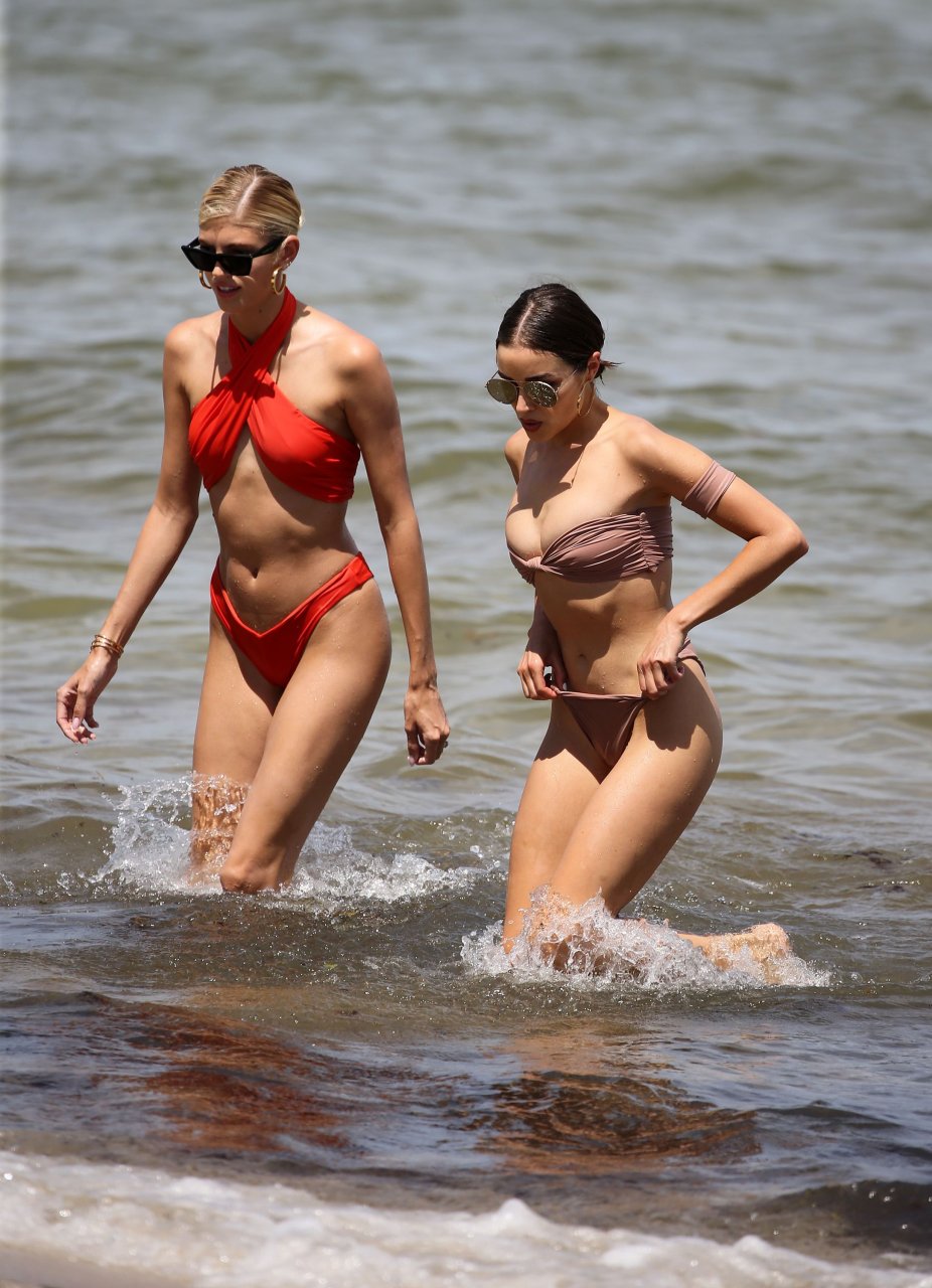 Olivia Culpo e Devon Windsor foram vistas usando biquínis reveladores enquanto dão um mergulho no oceano em Miami, 13/08/2018.