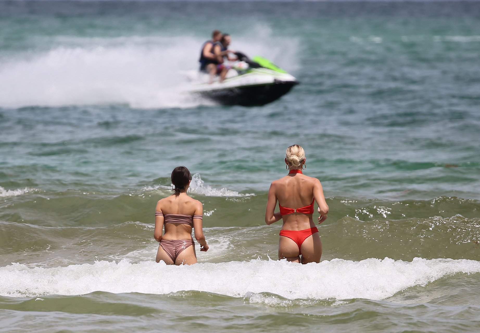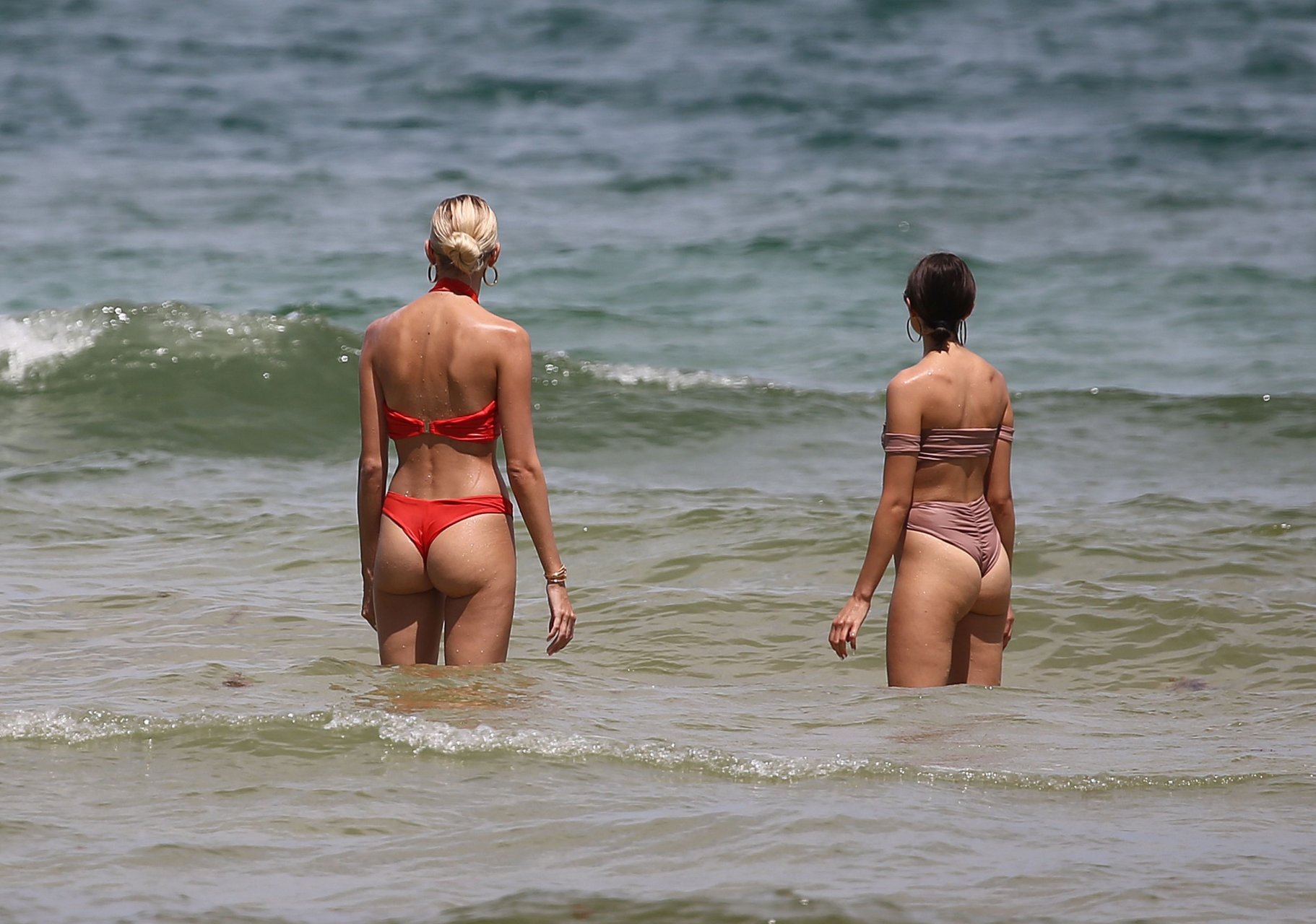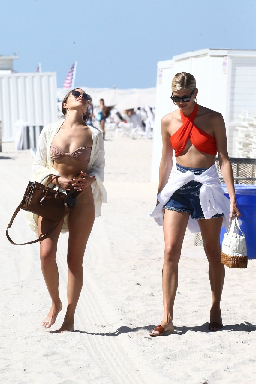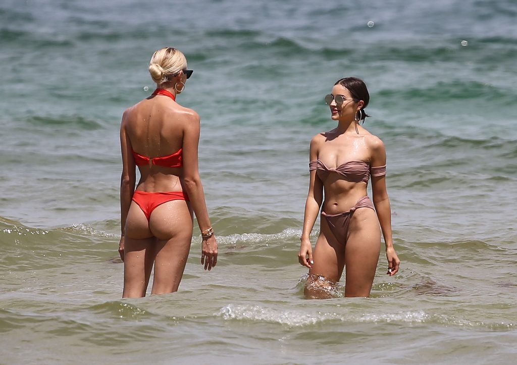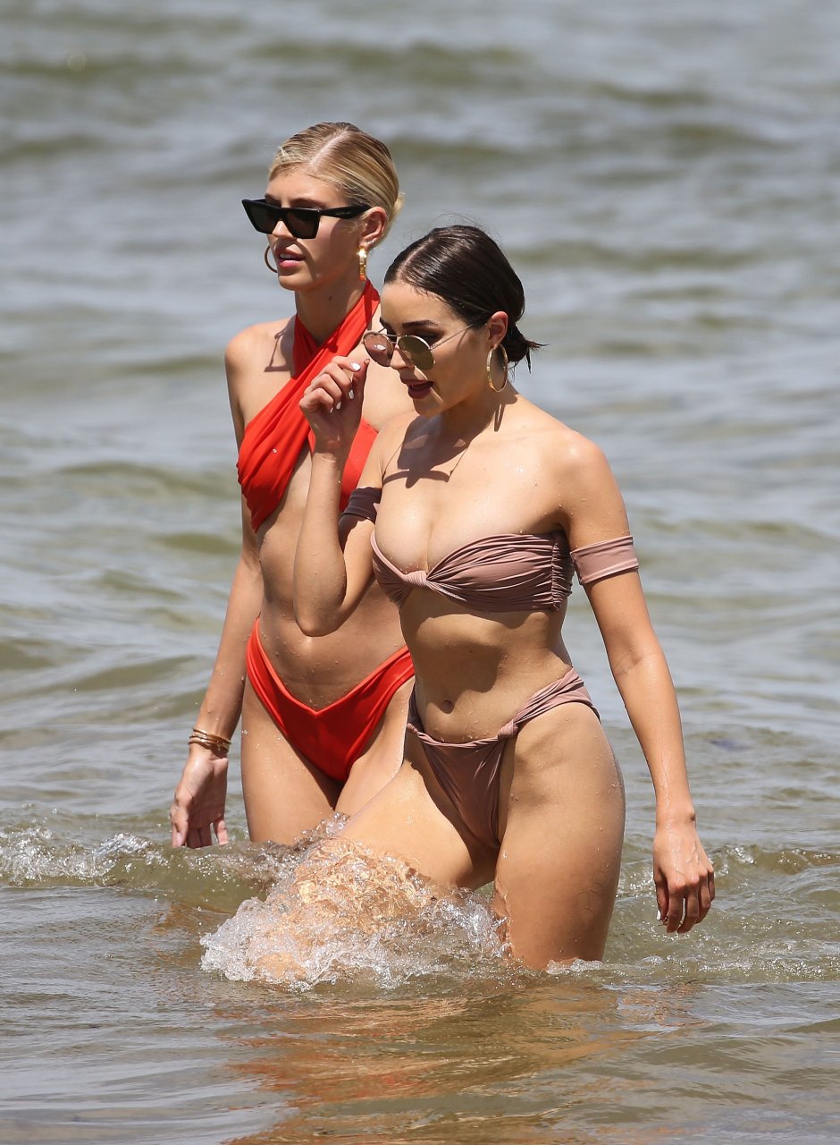 Olivia Culpo e Devon Windsor foram vistas usando biquínis reveladores enquanto dão um mergulho no oceano em Miami, 13/08/2018.