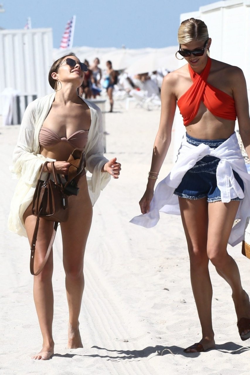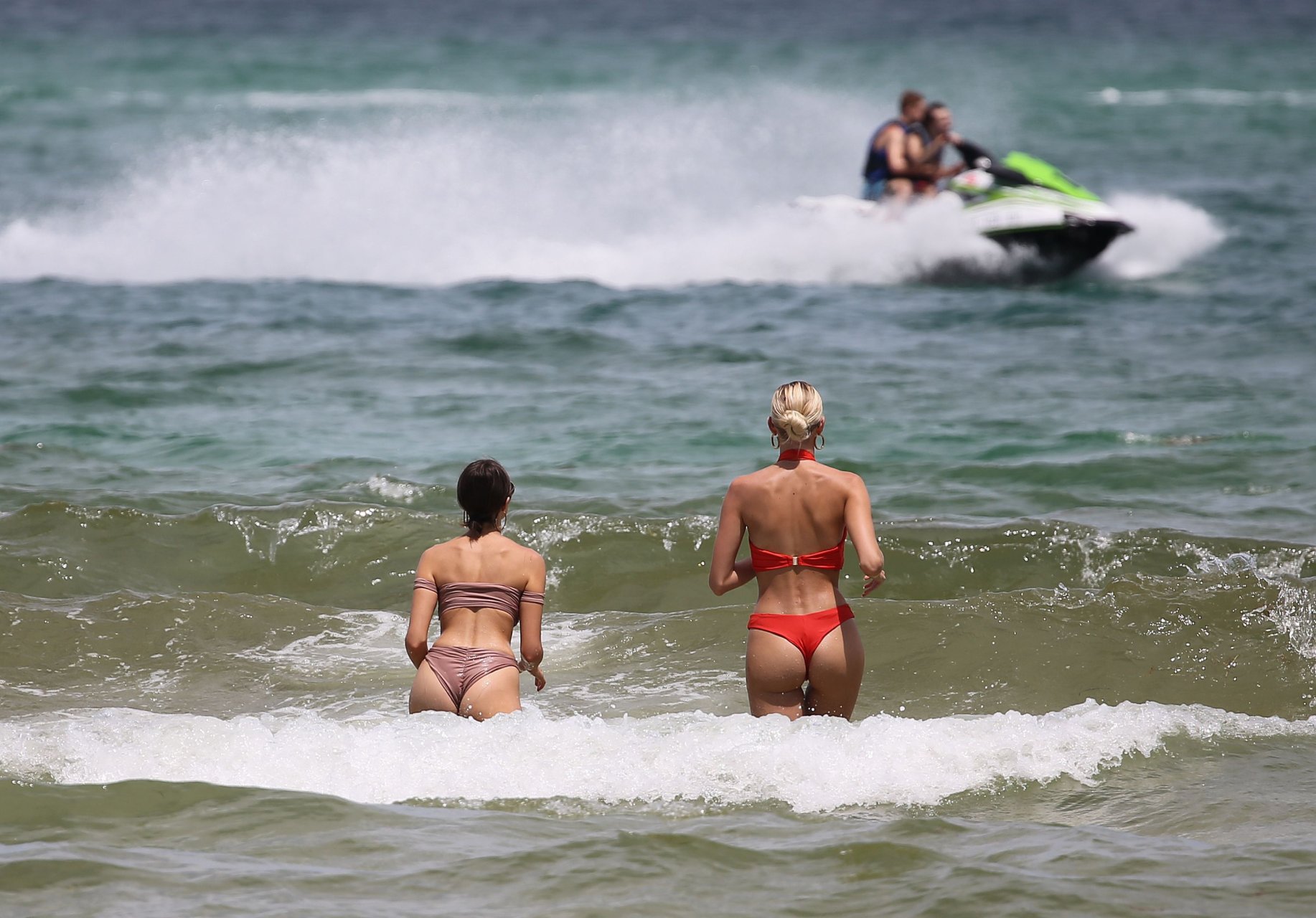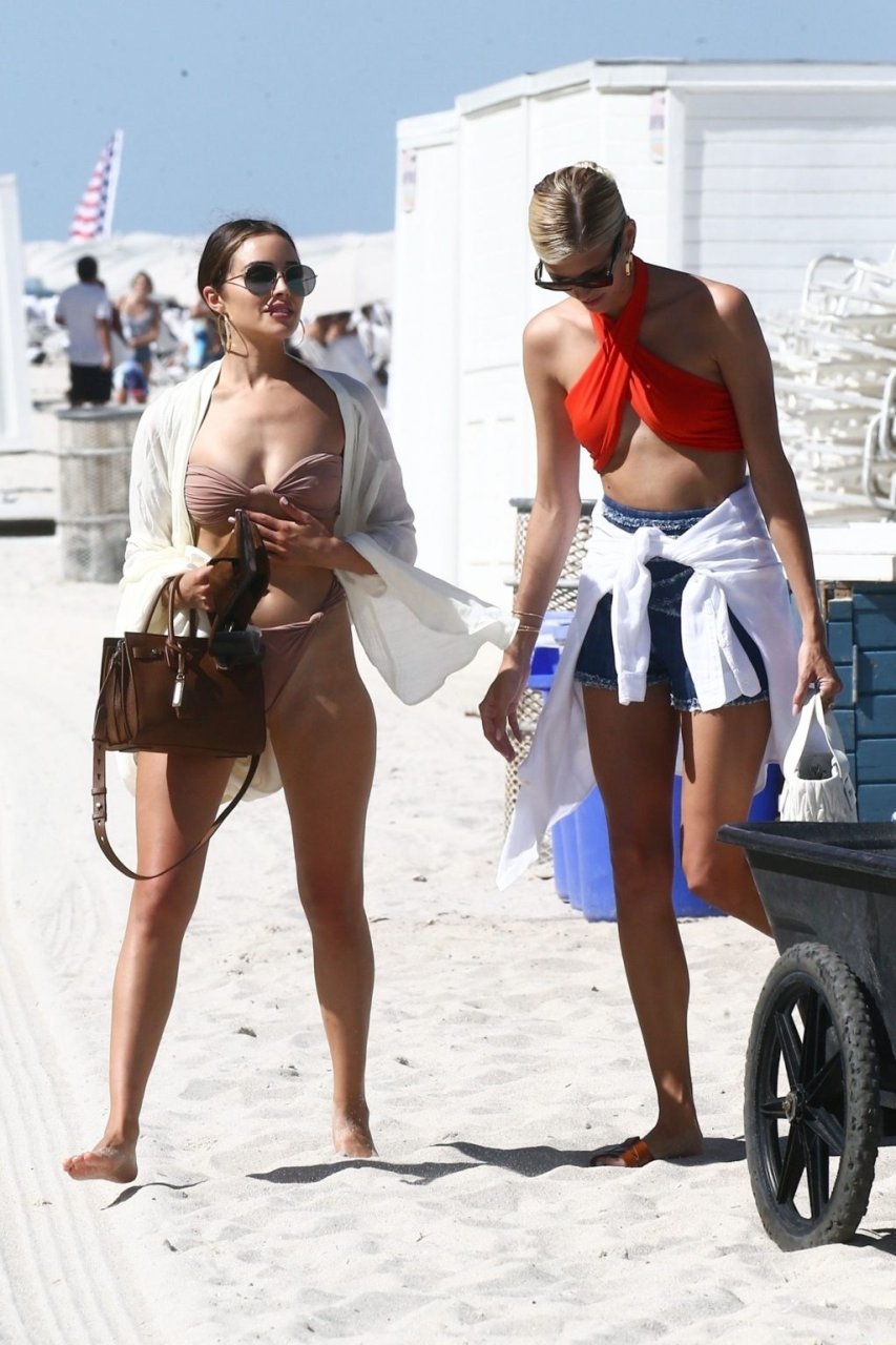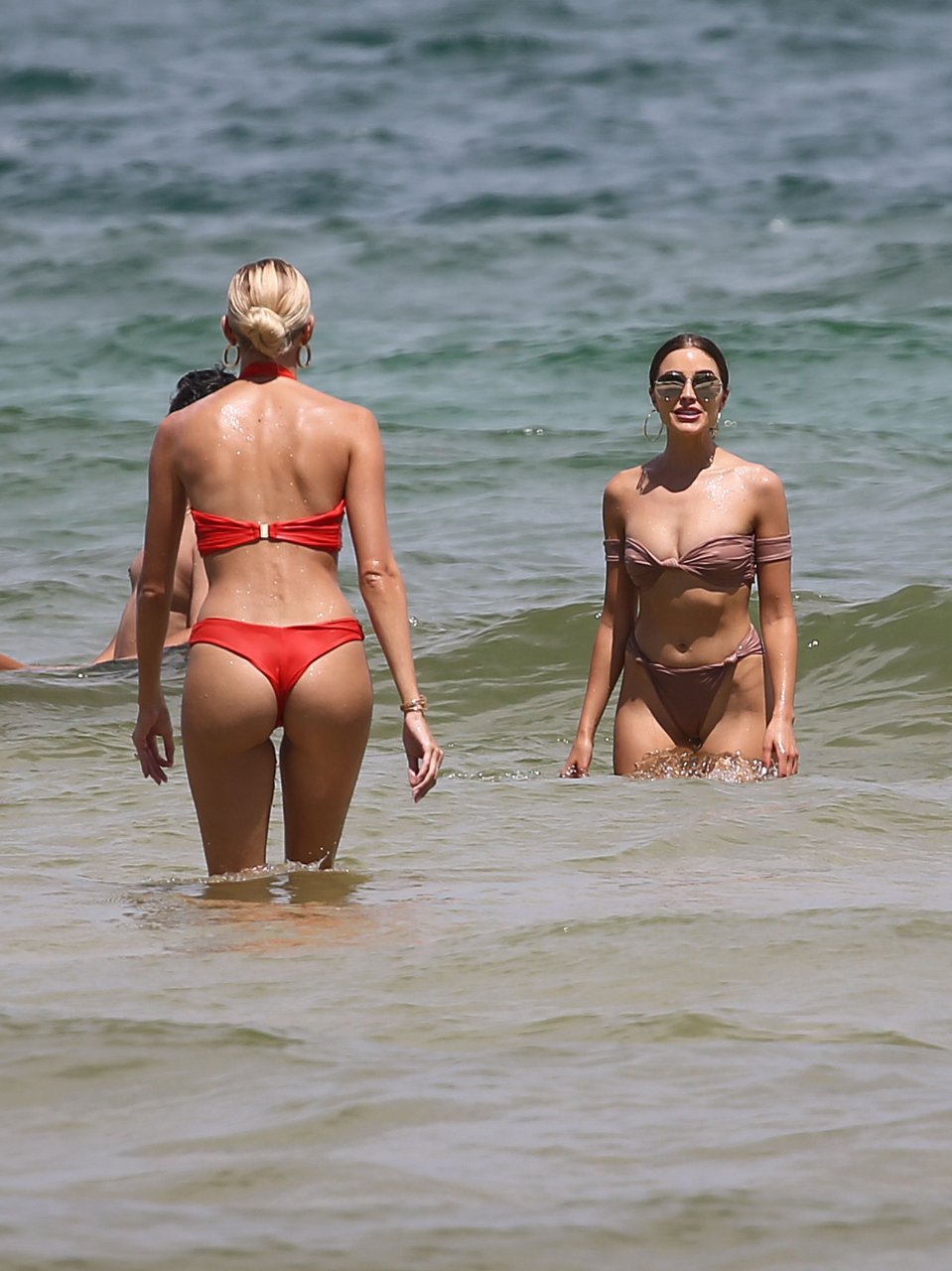 Olivia Culpo e Devon Windsor foram vistas usando biquínis reveladores enquanto dão um mergulho no oceano em Miami, 13/08/2018.