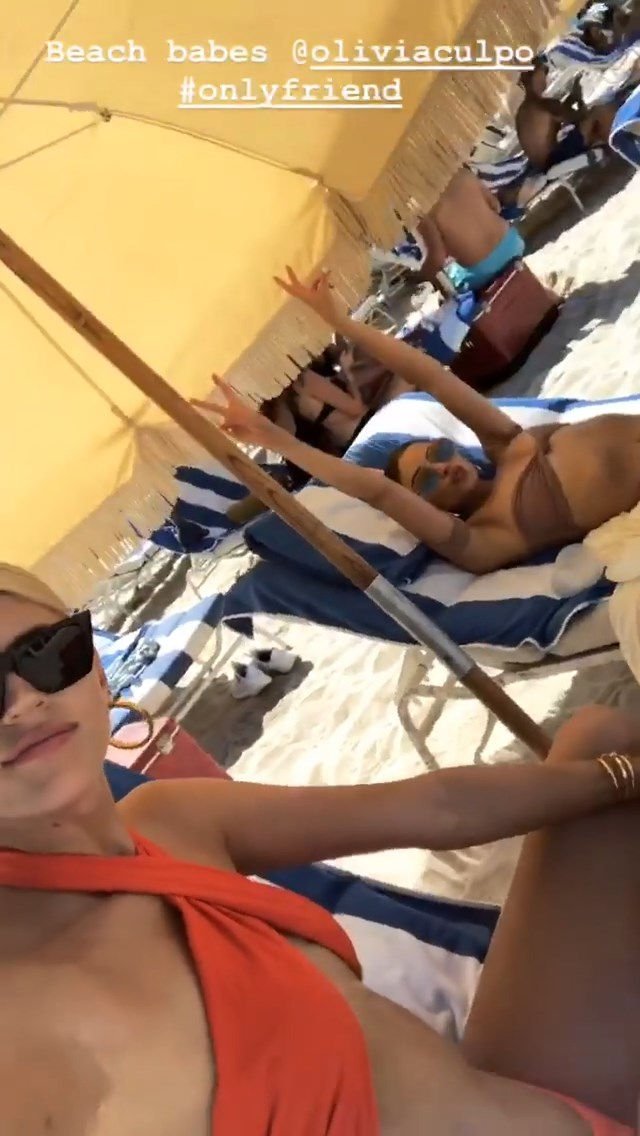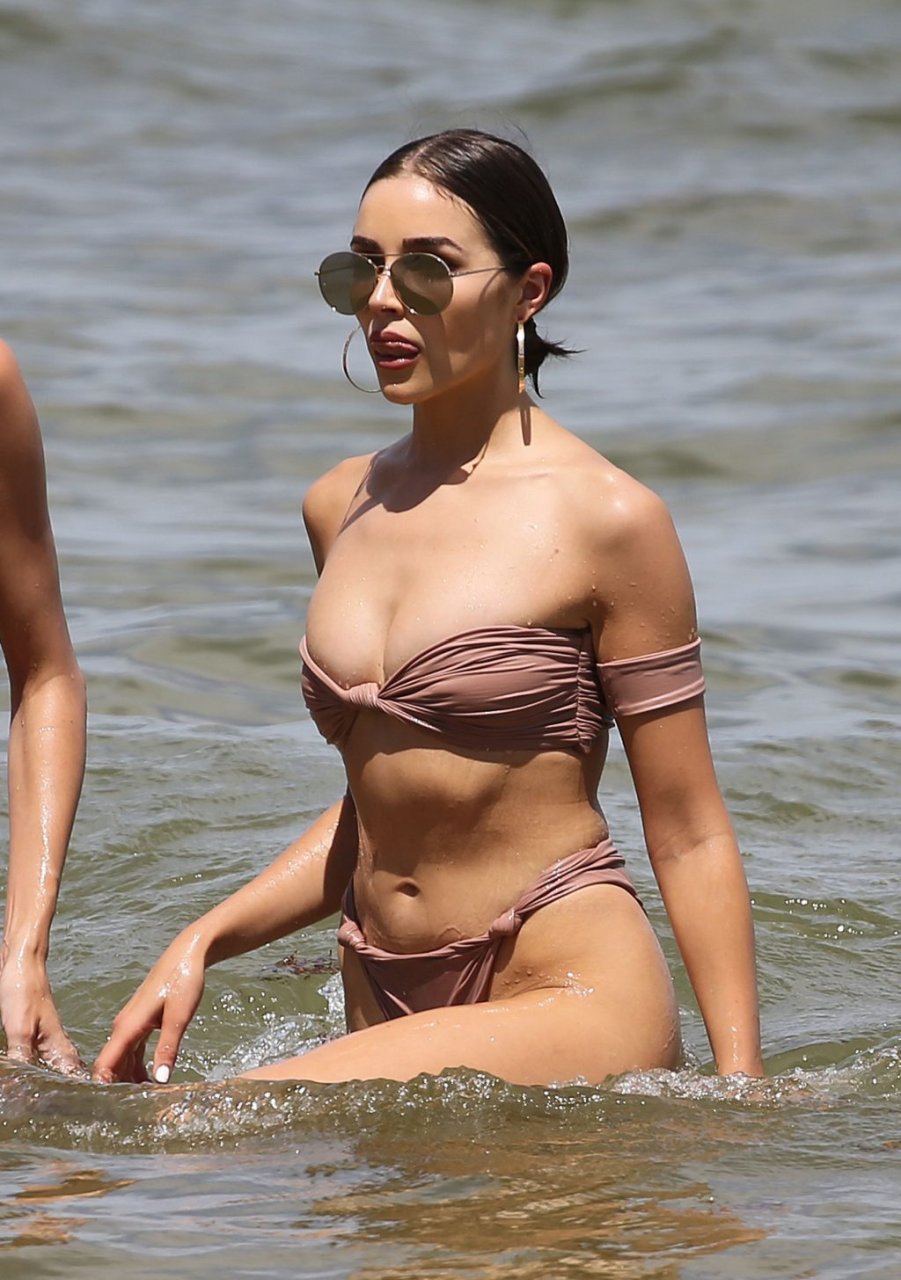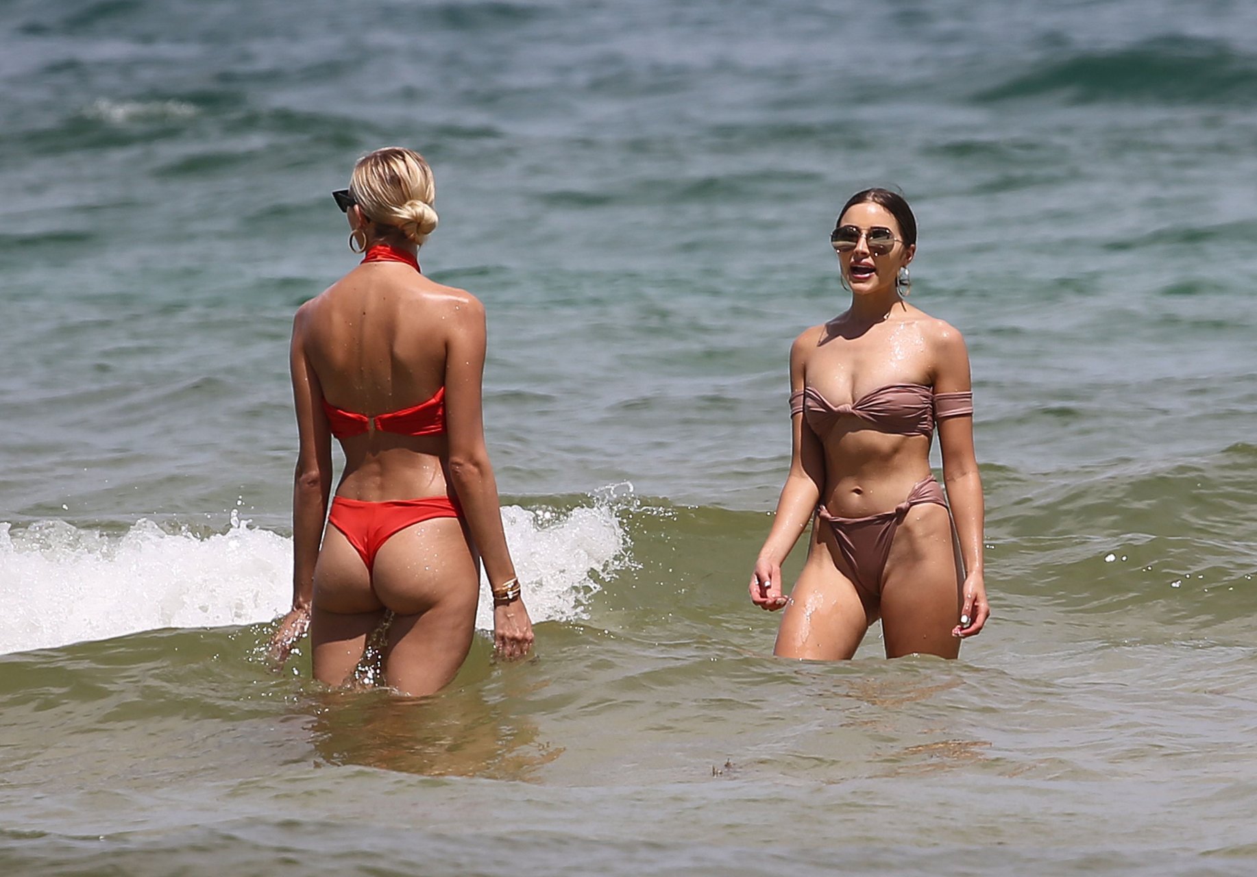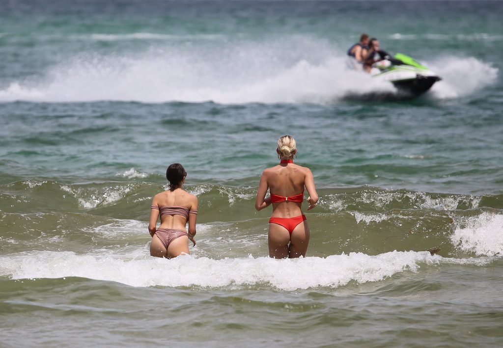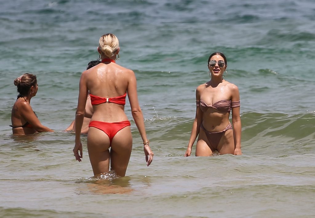 Olivia Culpo e Devon Windsor foram vistas usando biquínis reveladores enquanto dão um mergulho no oceano em Miami, 13/08/2018.