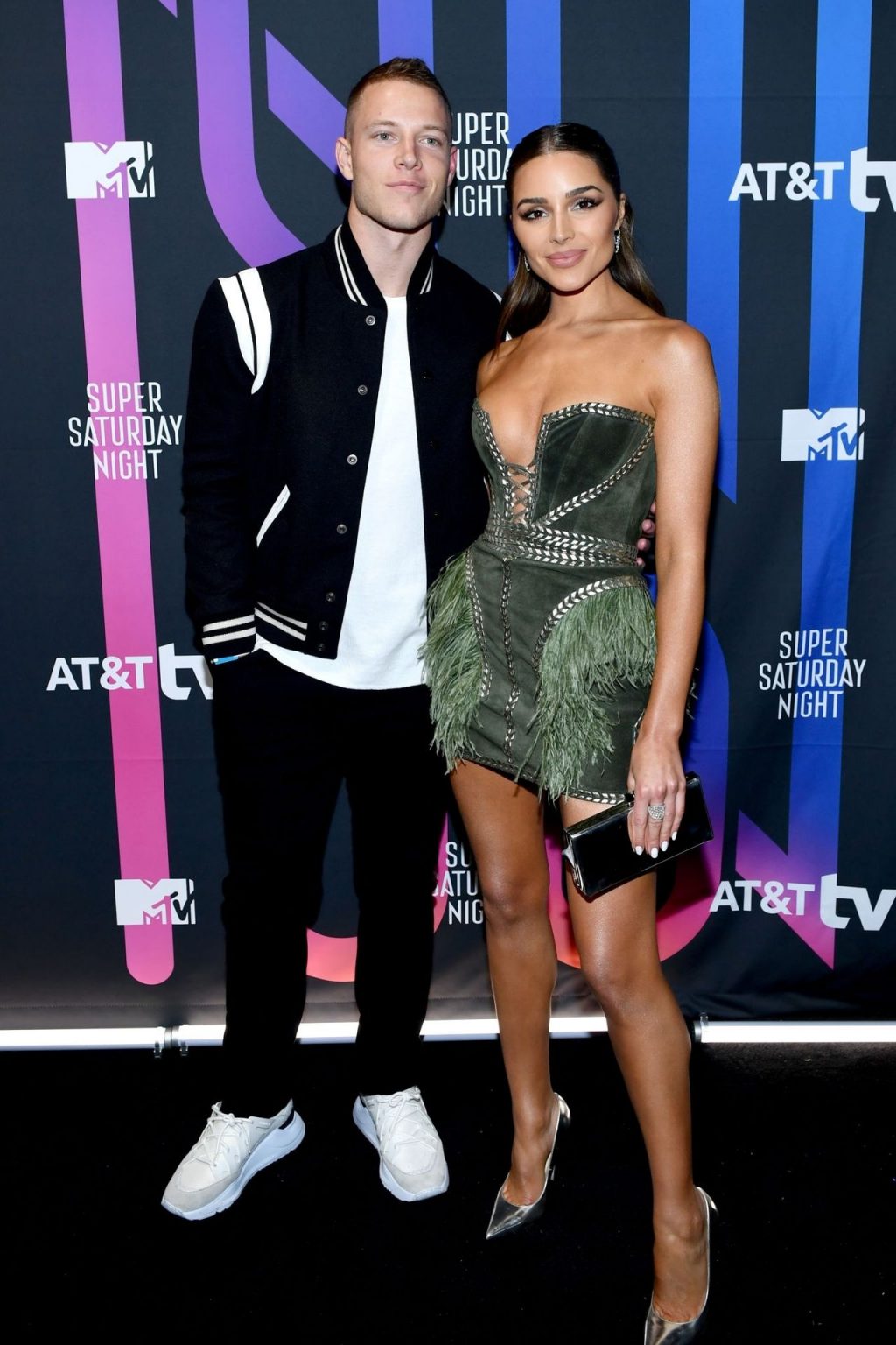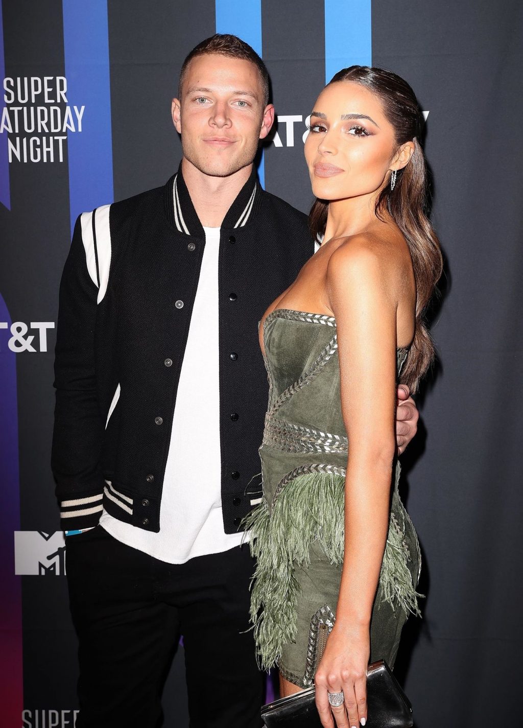 Olivia Culpo e Christian McCaffrey participam do AT&T TV Super Saturday Night no Meridian at Island Gardens em Miami, 01/02/2020.