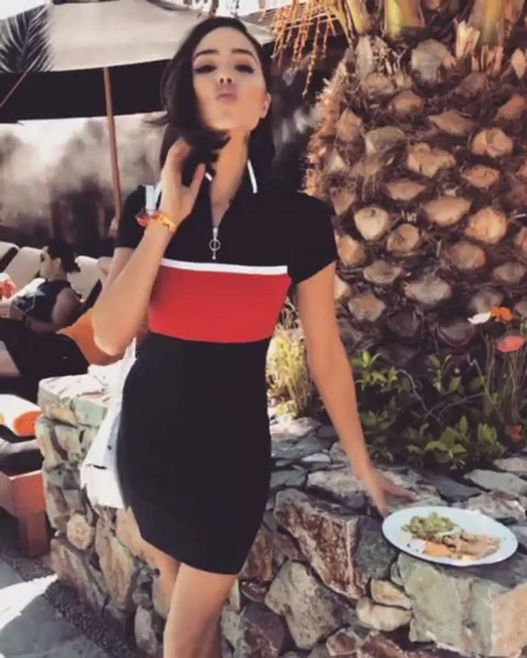 Olivia Culpo de pernas longas participa da Festa Lucky Brand Coachella no Hotel Arrive em Palm Springs, 13/04/2019. A princípio ela apareceu com uma roupa rosa transparente, e depois saiu da festa com um vestido vermelho e azul marinho.