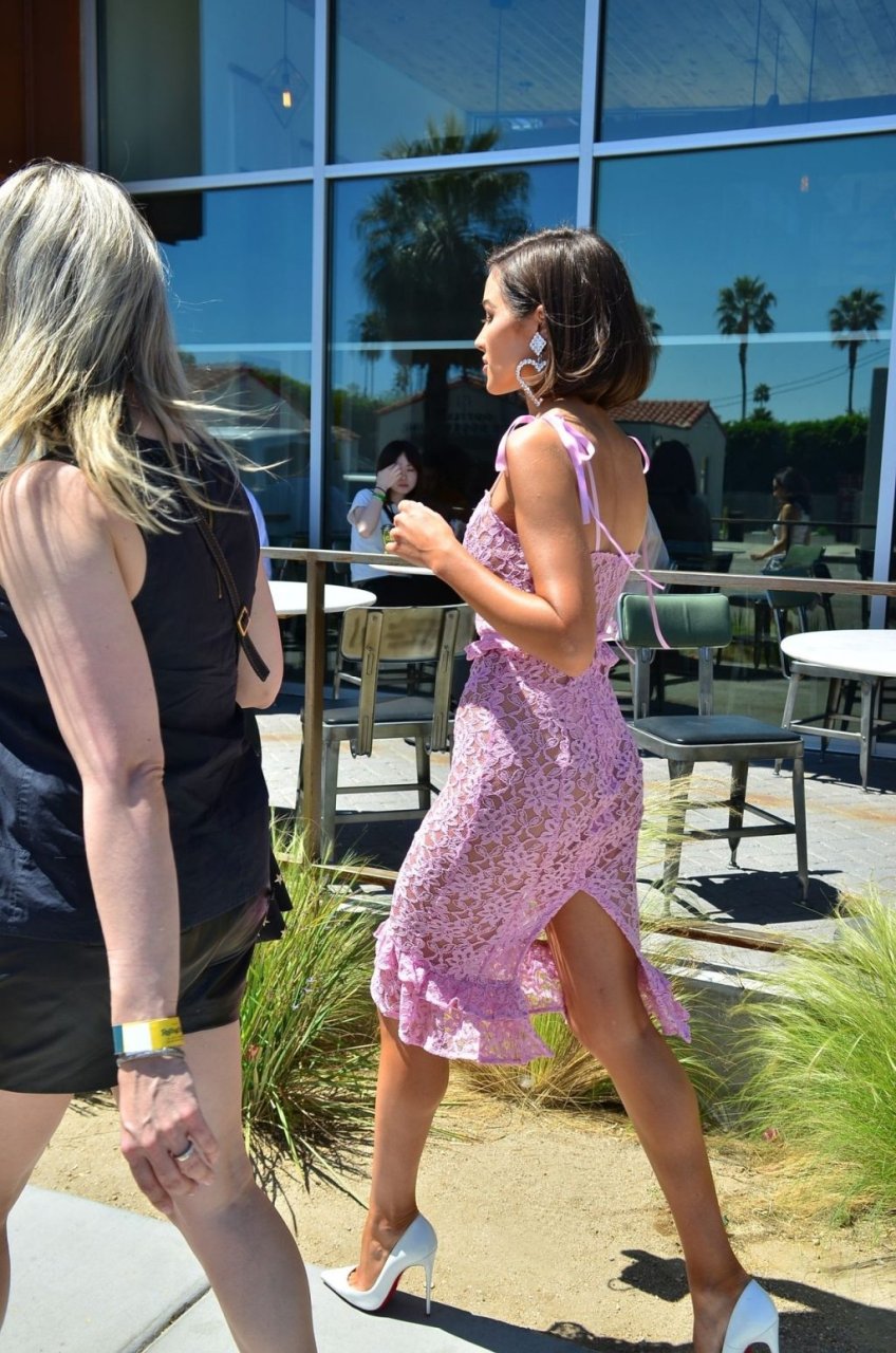 Olivia Culpo participa da Festa Lucky Brand Coachella no Hotel Arrive em Palm Springs, 13/04/2019. Ela usava uma cobertura rosa transparente com um biquíni rosa por baixo, e depois saiu da festa com um vestido vermelho e azul marinho.