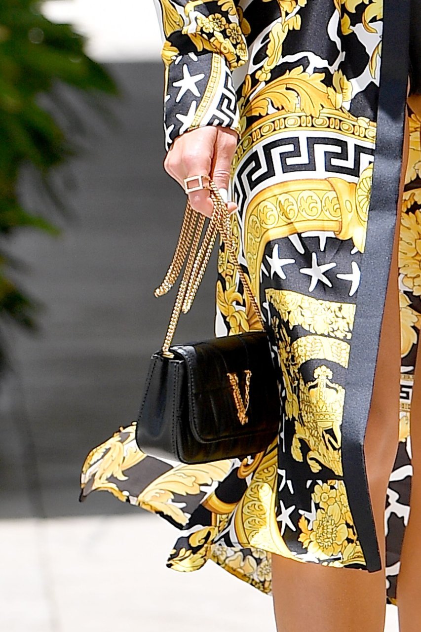 A modelo Olivia Culpo usa um robe Versace com um maiô preto em Miami Beach, Flórida, 14/07/2019.