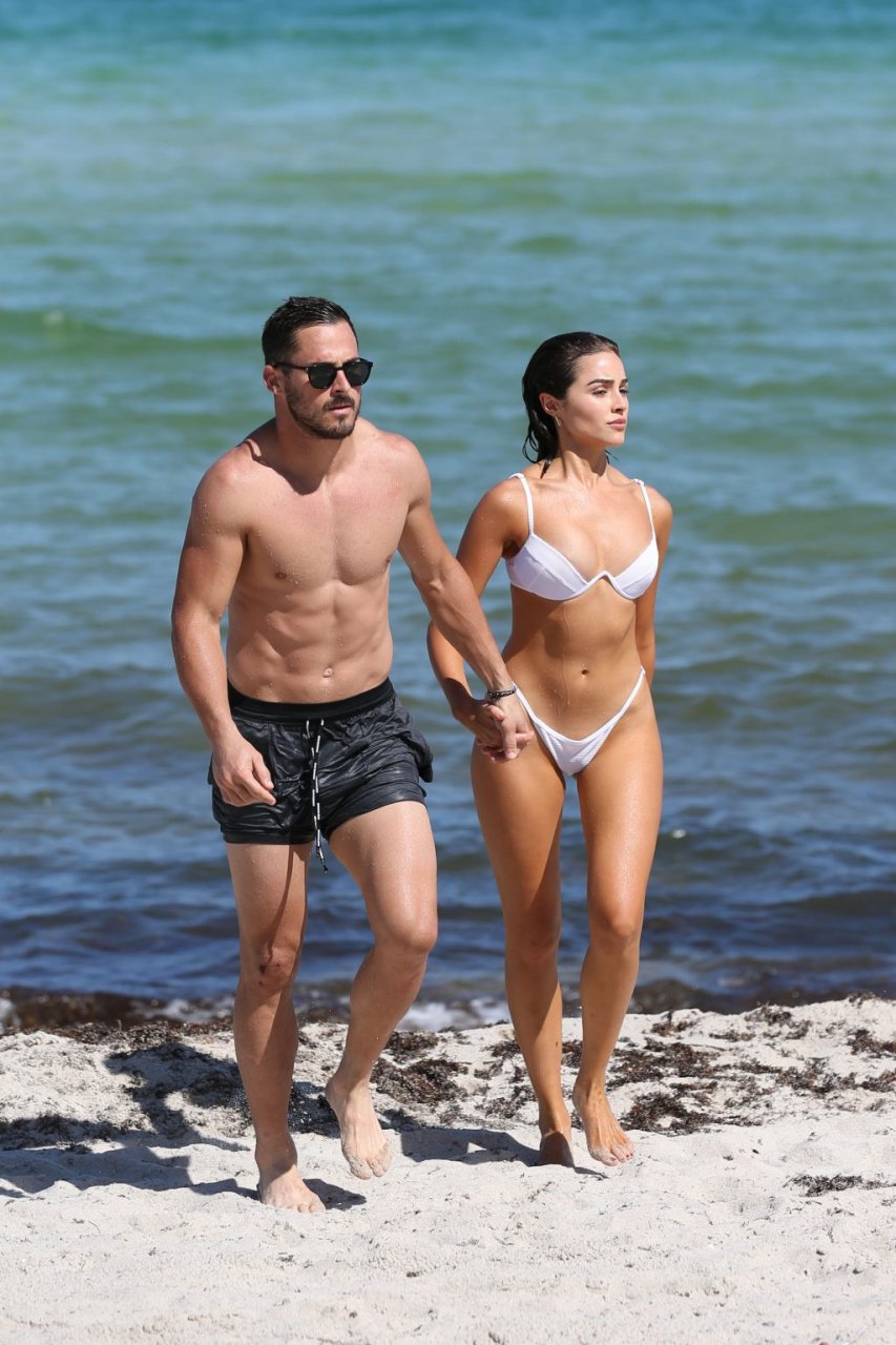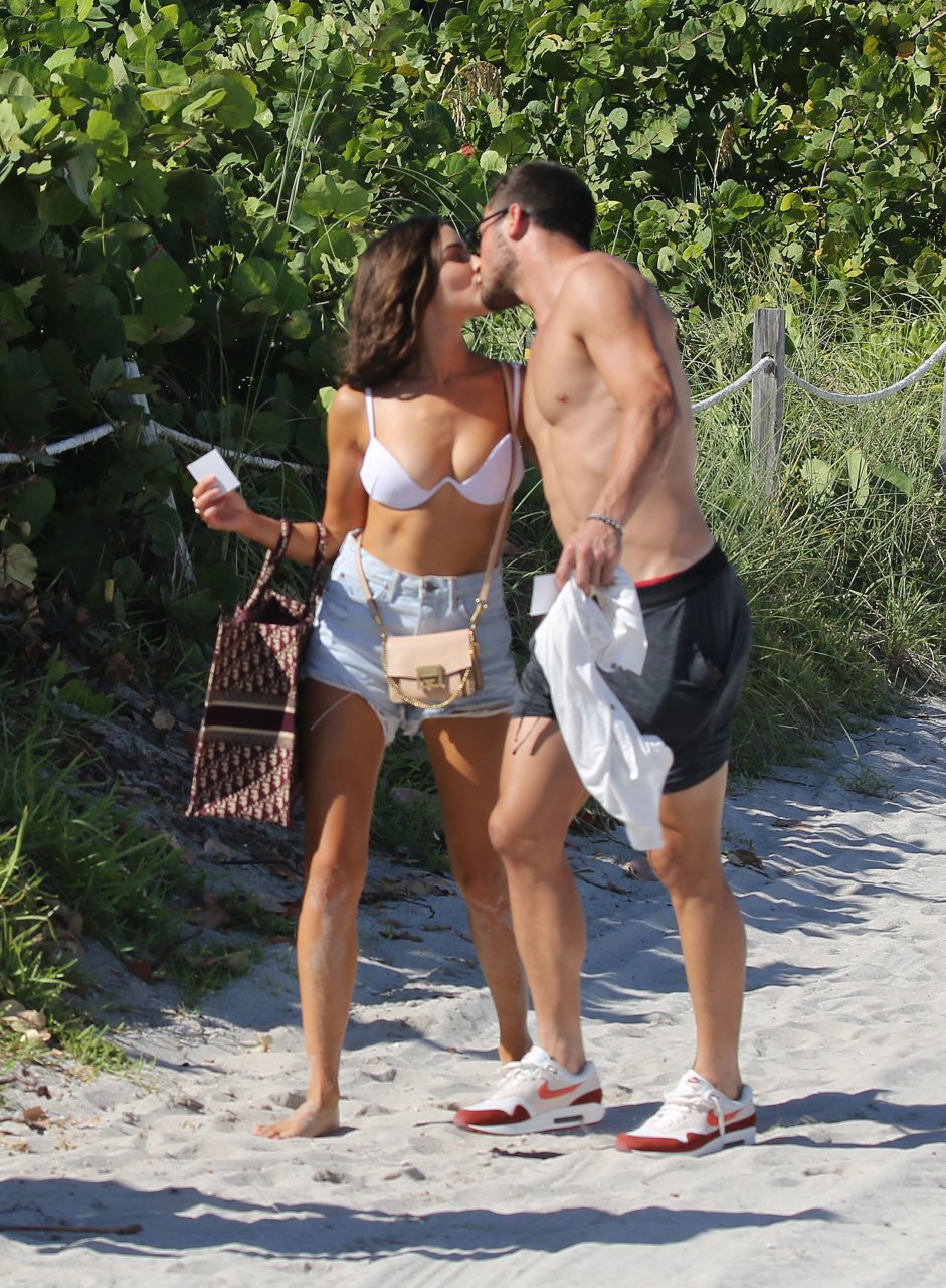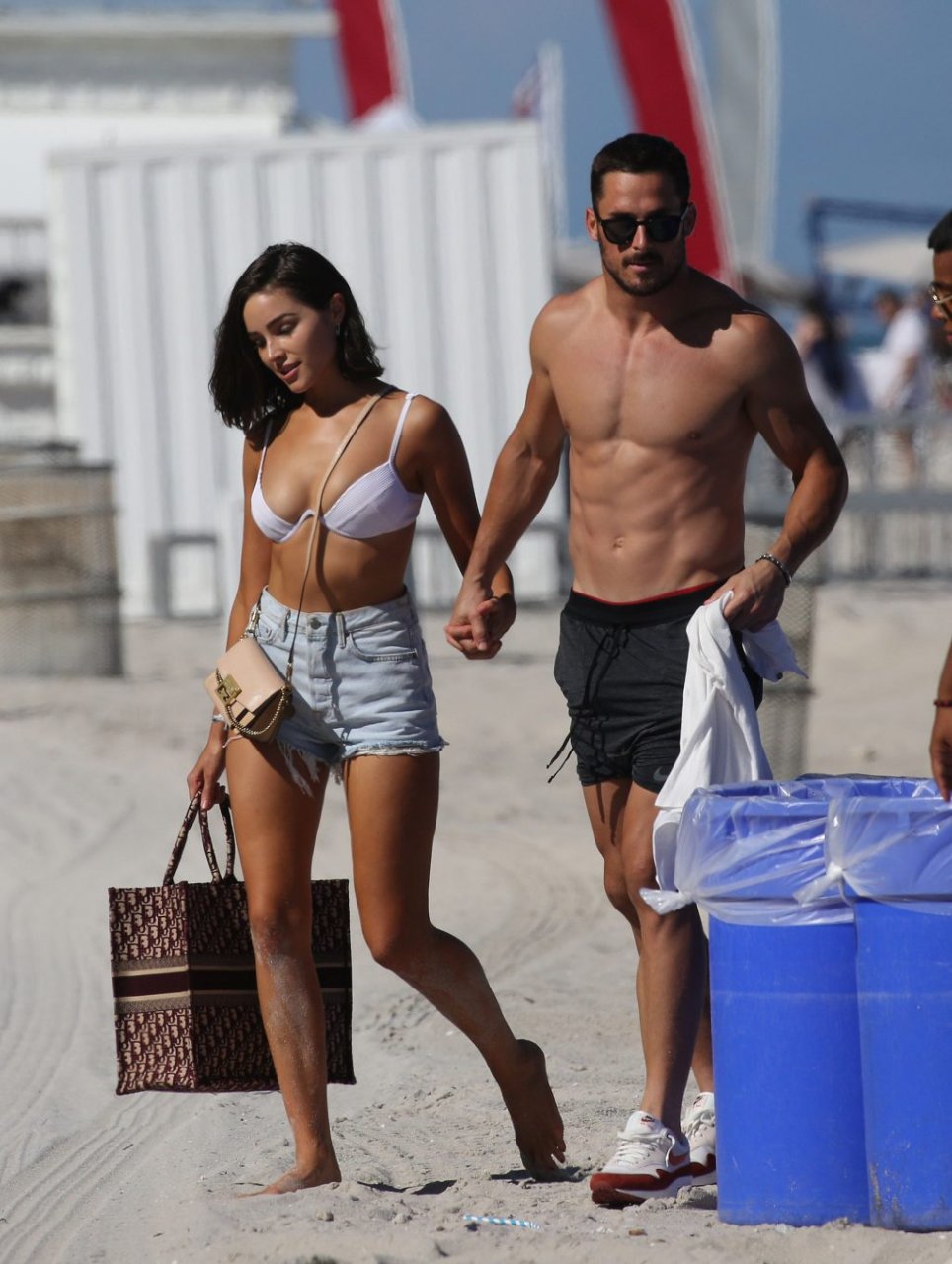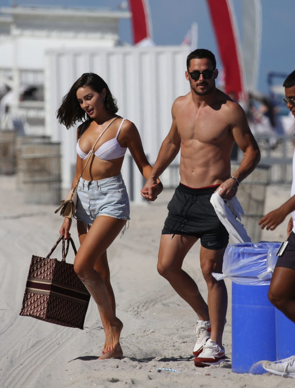 Modelo de biquíni Olivia Culpo e o jogador da NFL Danny Amendola estão claramente juntos novamente enquanto caminham de mãos dadas na praia em Miami, 25/09/2018.