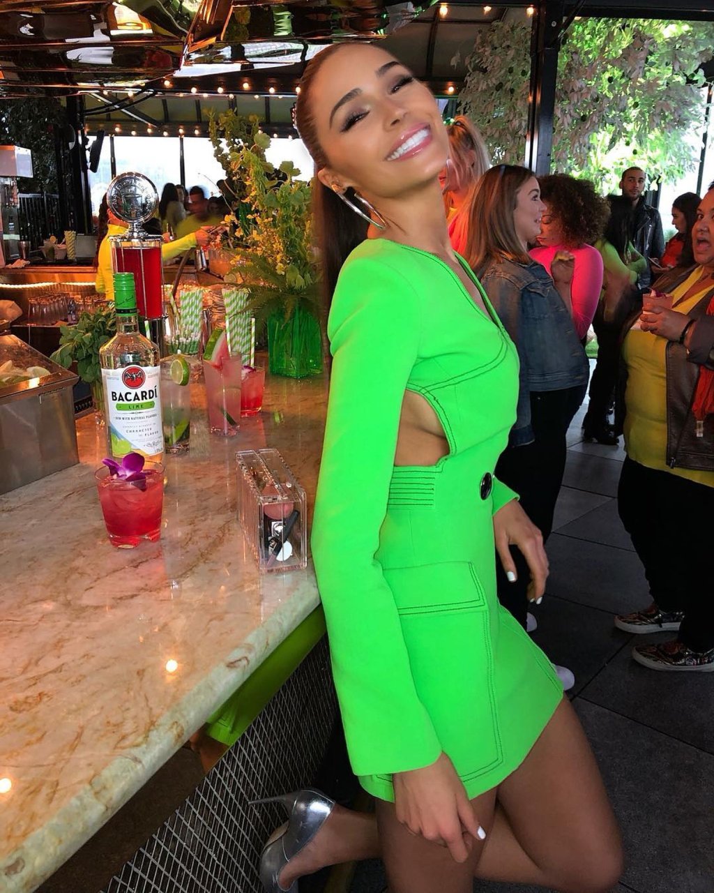 Leggy Olivia Culpo foi vista usando um vestido verde-limão David Koma com sapatos Brian Atwood e brincos Jennifer Fisher em Nova York, 26/04/2019.