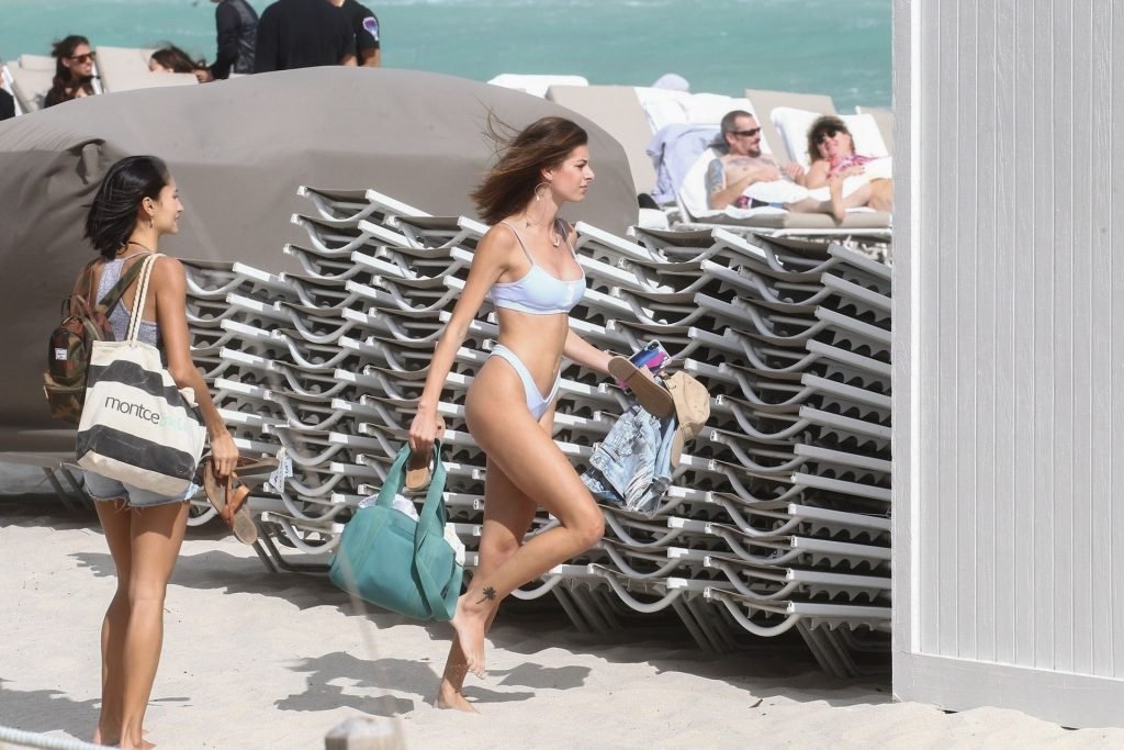Model Olivia Pascale, que teve um papel na série de TV “Ballers” com Dwayne Johnson, é vista posando para fotos com a amiga modelo Jessica Martin enquanto usa biquínis minúsculos em Miami Beach, 22/01/2019.