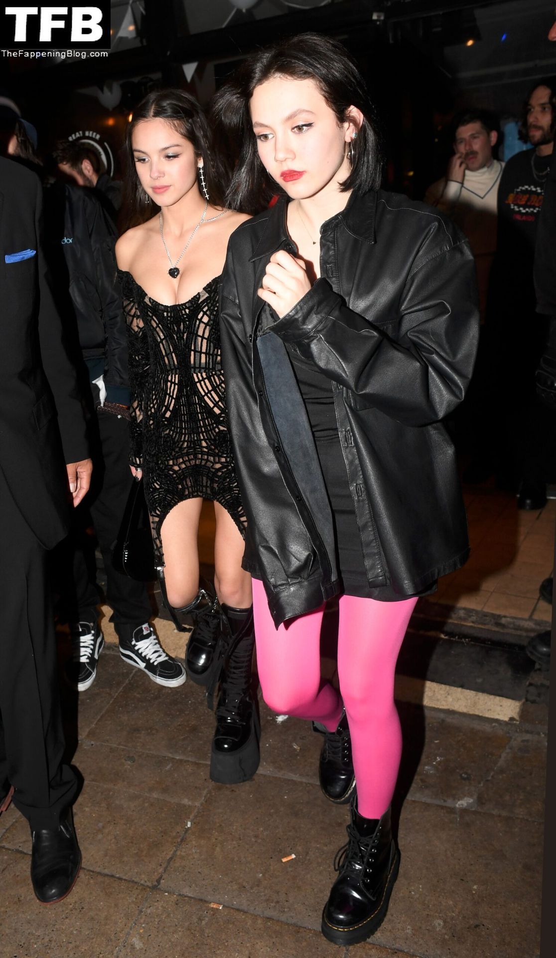 Olivia Rodrigo chega à after party do The BRIT Awards em Londres, 08/02/2022. A atriz/cantora de 18 anos mostra seus seios e calcinha sexy, usando um vestido preto transparente.