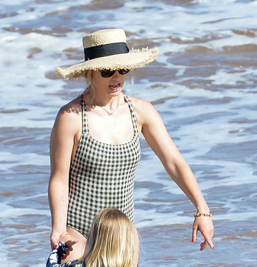 A mãe de dois filhos esteve ativa e fez parecer fácil ser mãe enquanto os segurava e os levava para as águas tropicais turquesa.