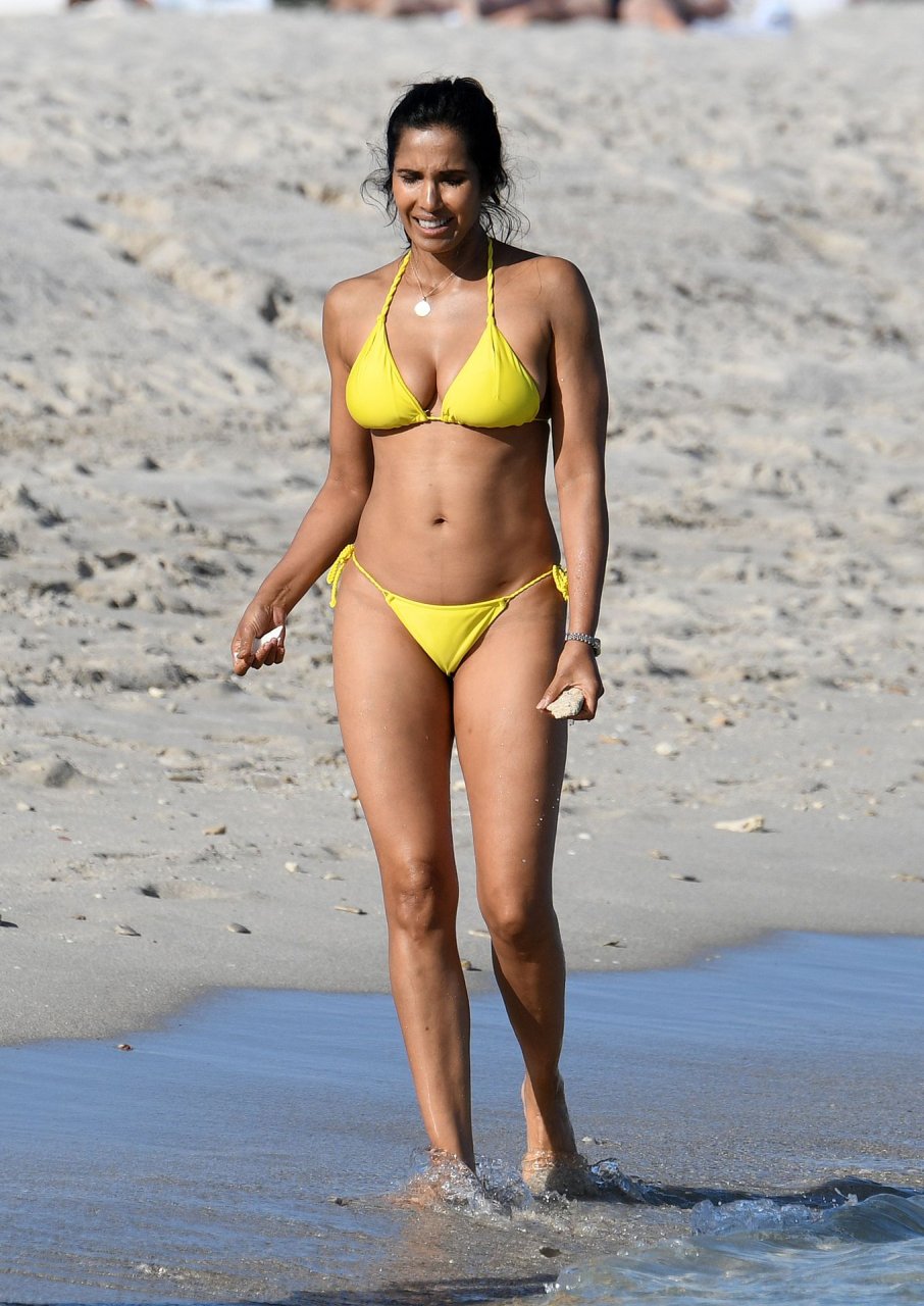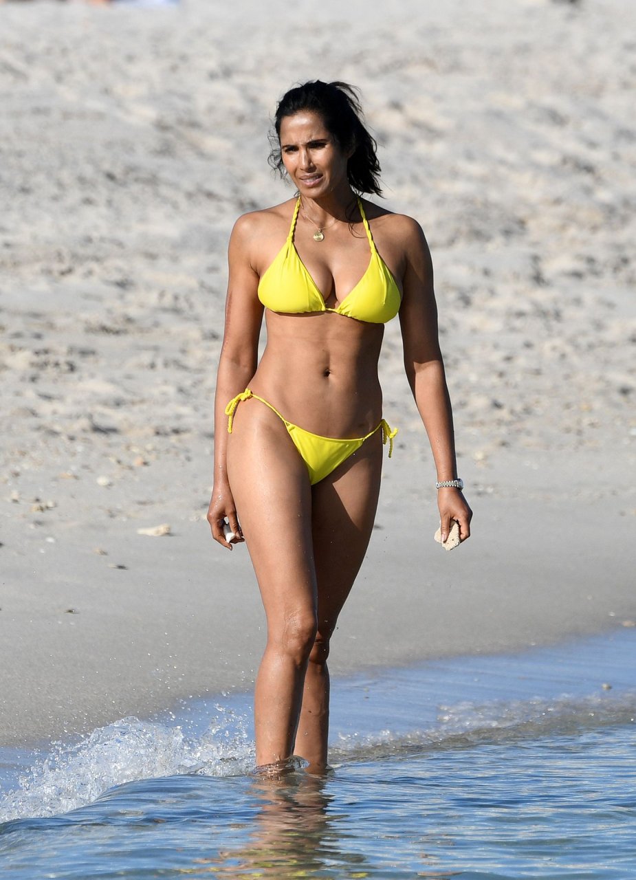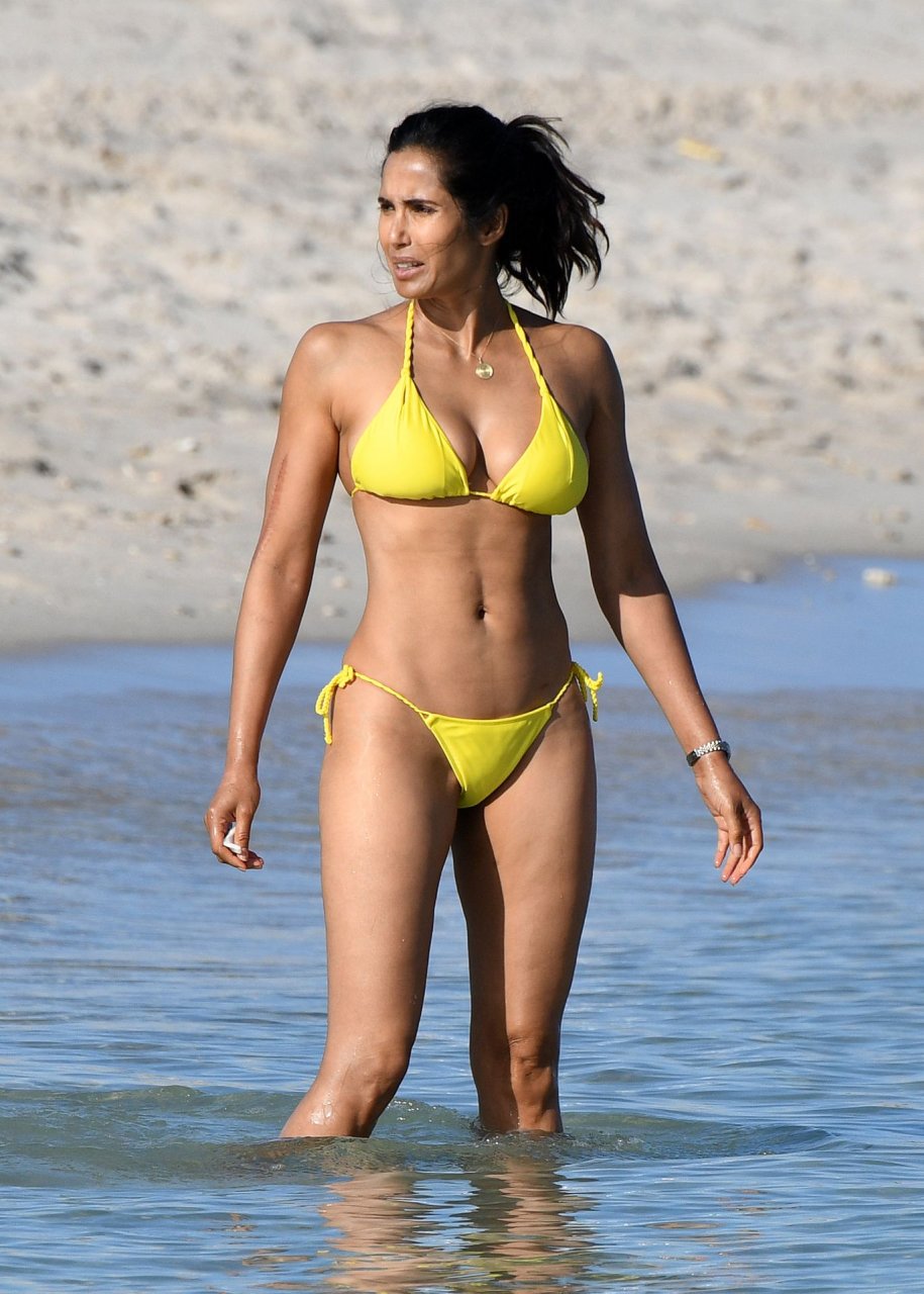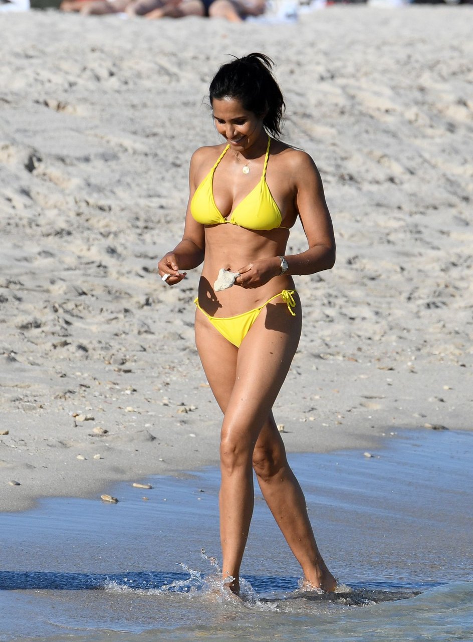 Modelo, atriz e apresentadora de TV Padma Lakshmi exibe seu corpo fantástico de biquíni enquanto mergulha no oceano durante férias em Miami, 01/05/2019. A estrela da rede de TV de 48 anos usava um biquíni amarelo brilhante que destacava suas curvas enquanto brincava e ria com uma amiga antes de se dirigir a uma cabana VIP para um pouco de sombra e descanso.