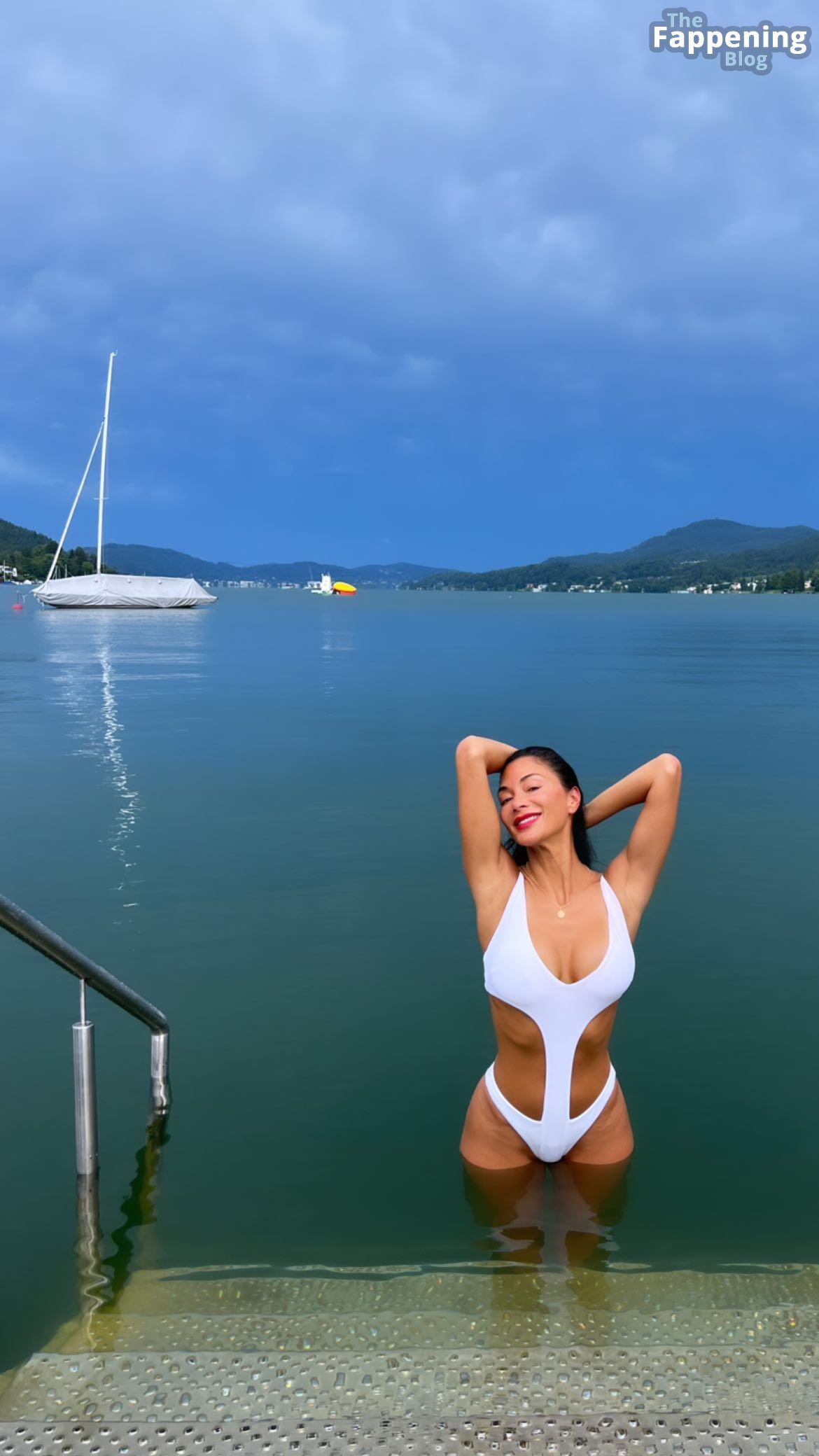 A estrela do Fappening Nicole Scherzinger impressiona com um maiô branco exibindo sua bela figura durante as férias.
