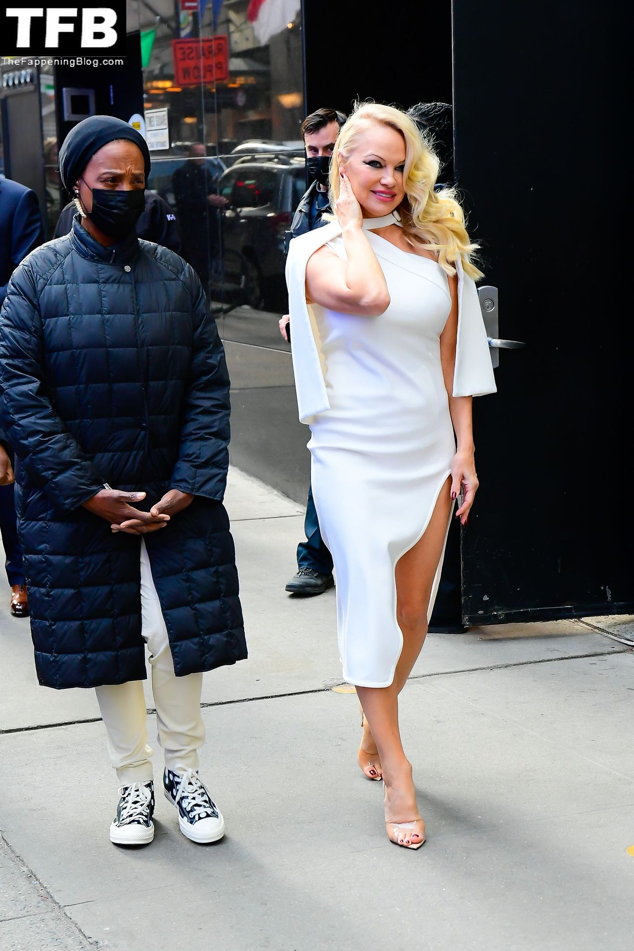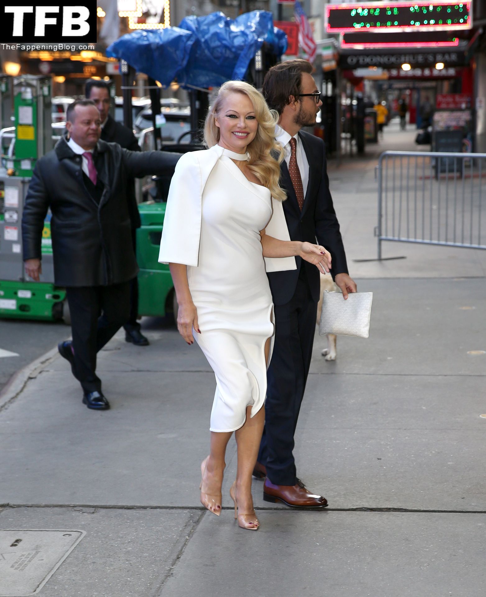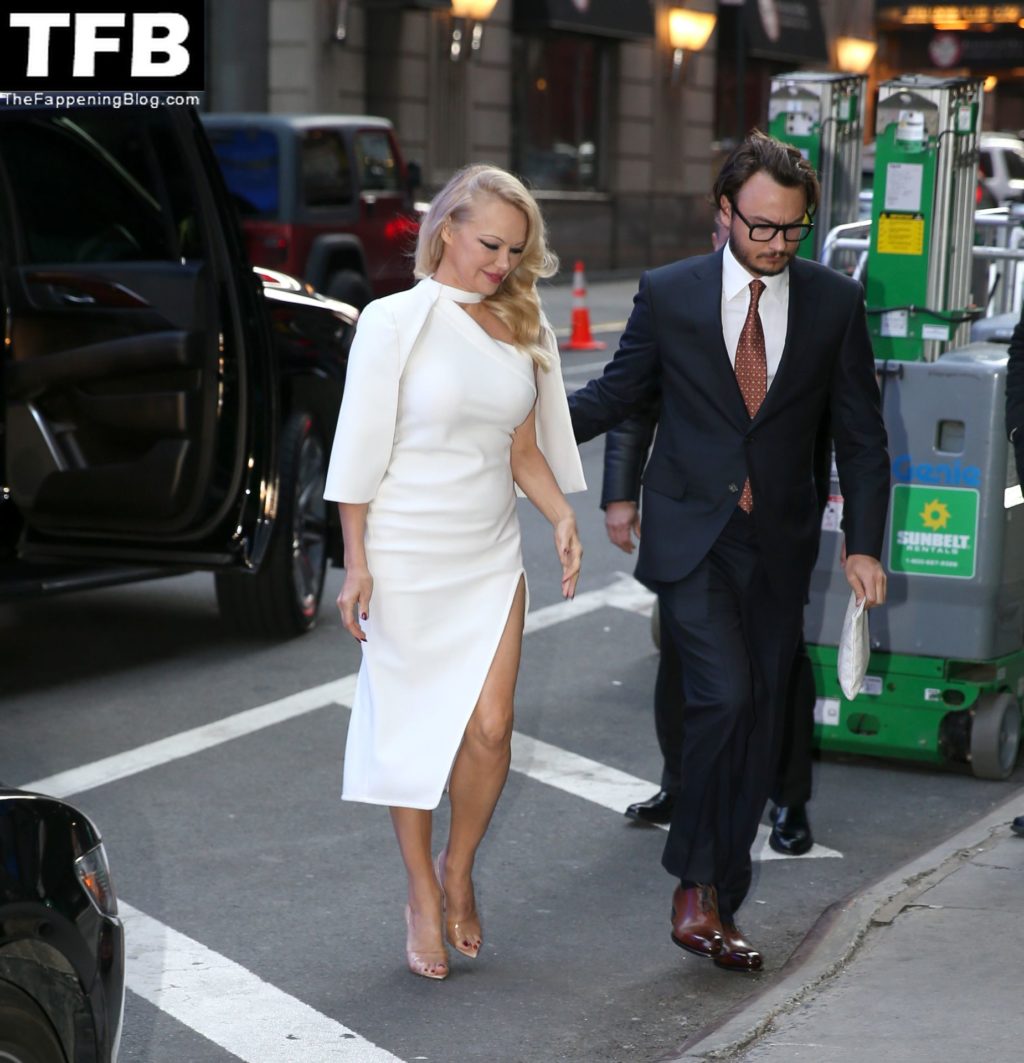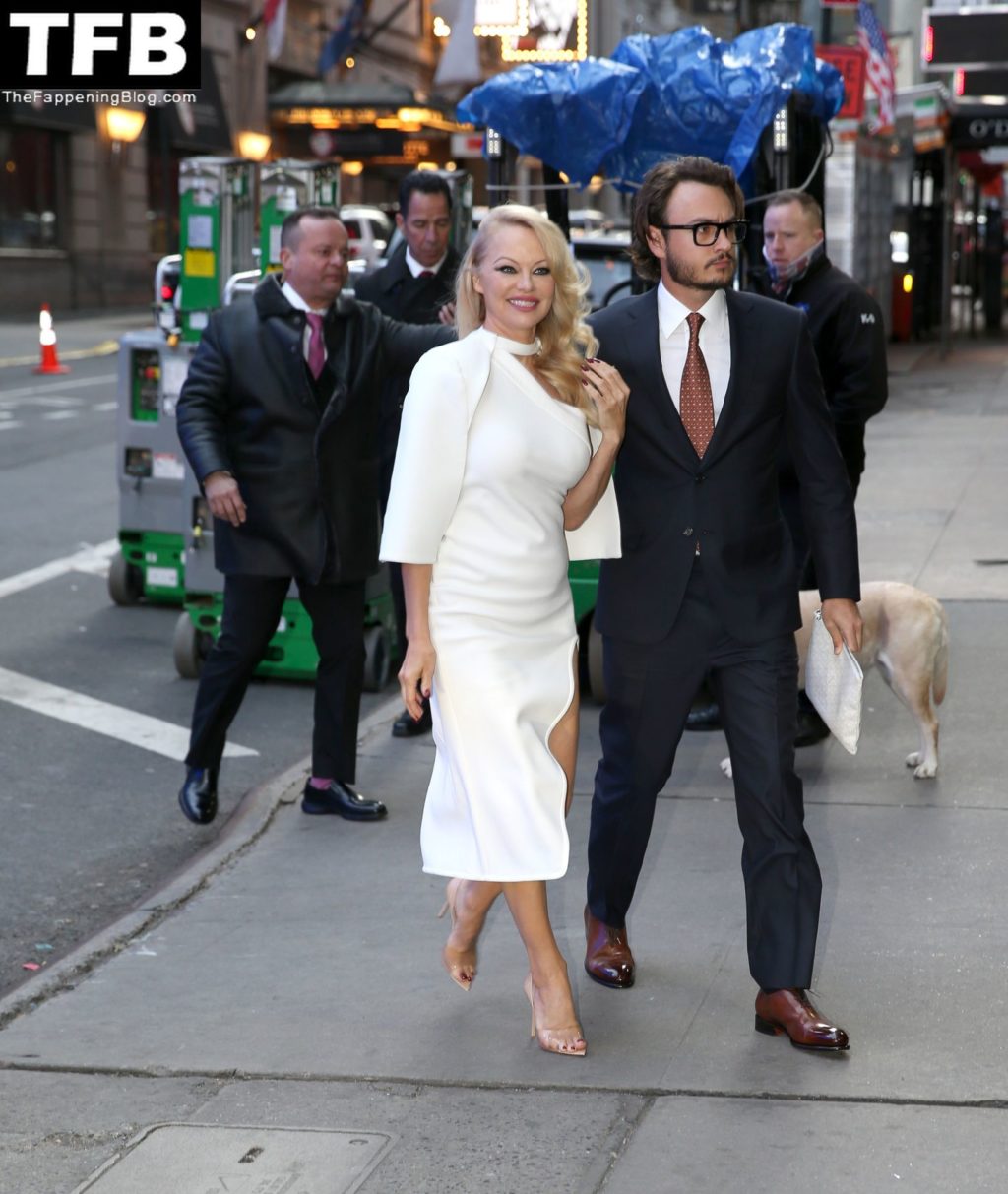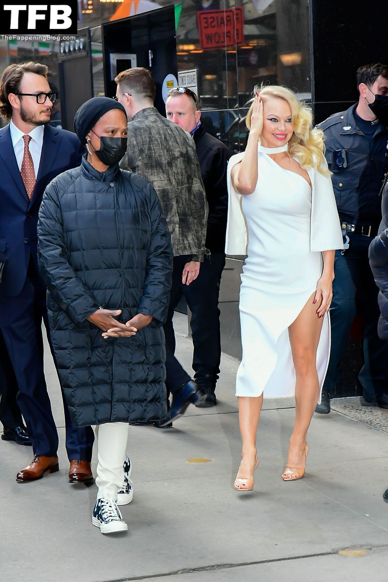 Pamela Anderson chega ao Good Morning America em Nova York, 23/03/2022. A atriz e modelo de 54 anos de “Baywatch” usava um vestido branco com um par de saltos transparentes.