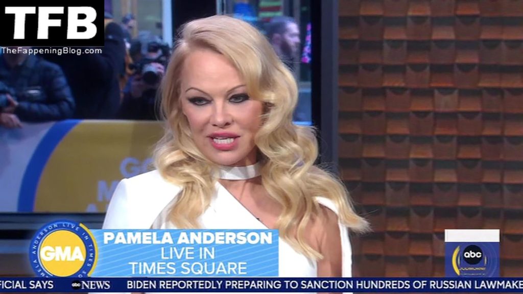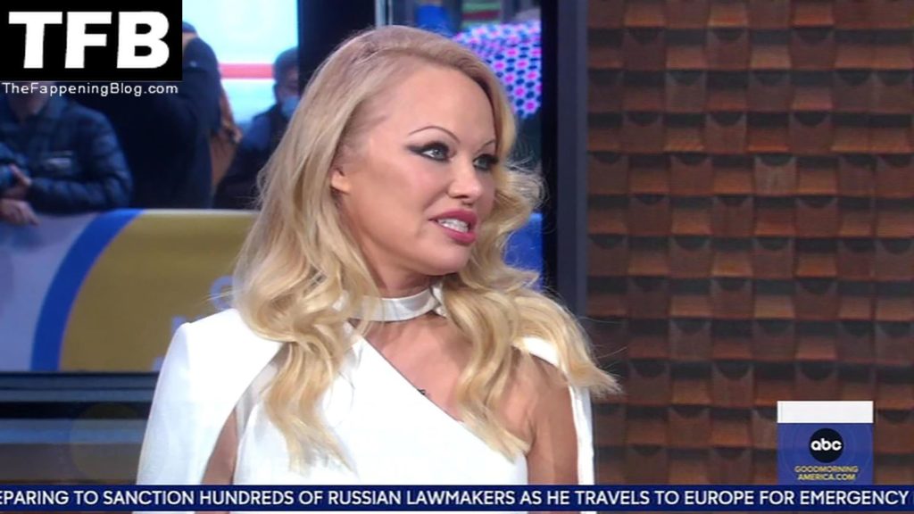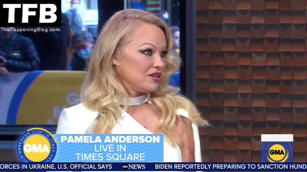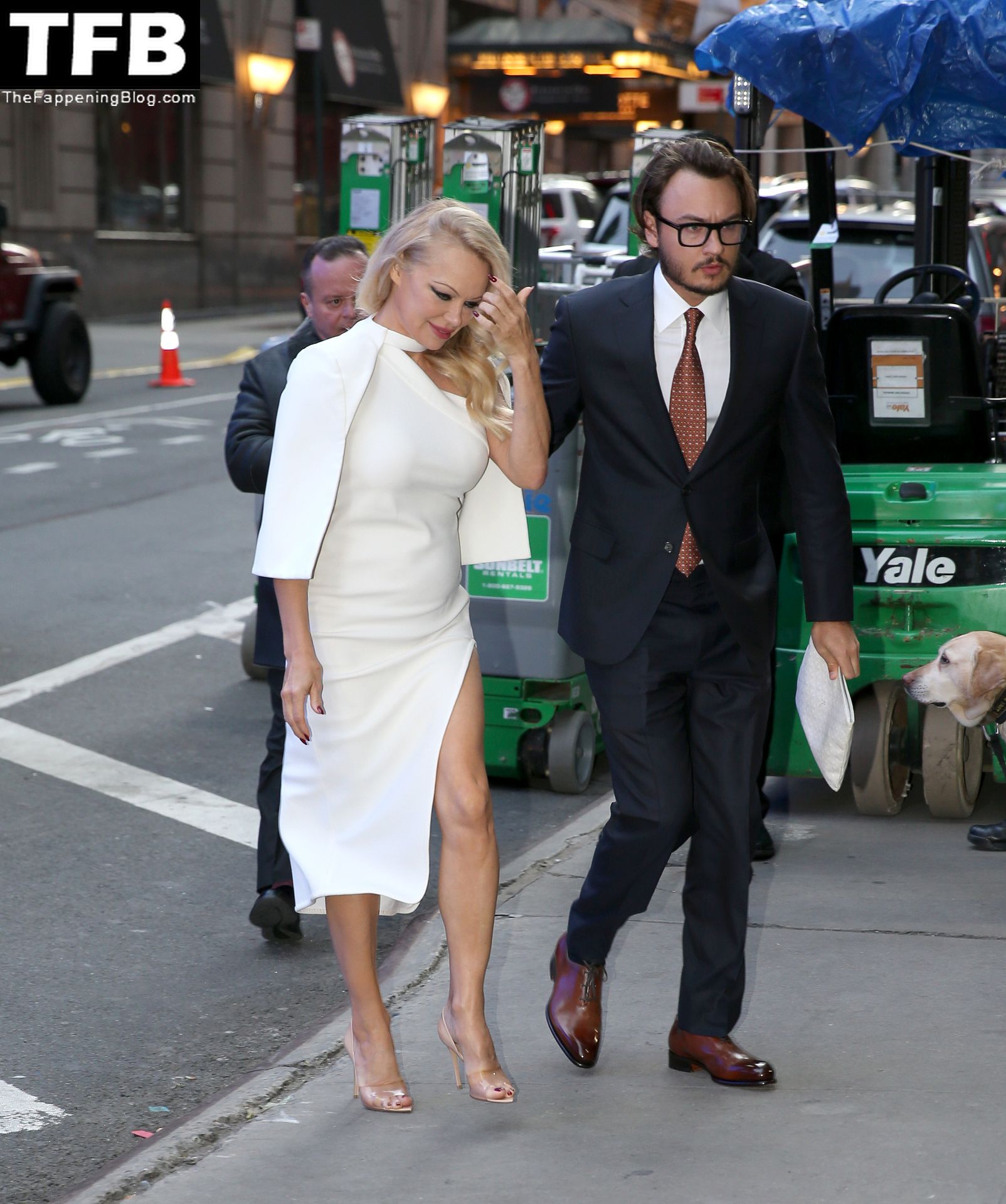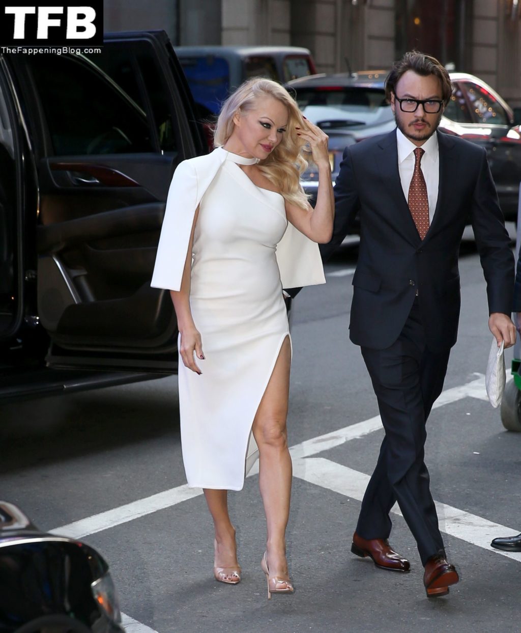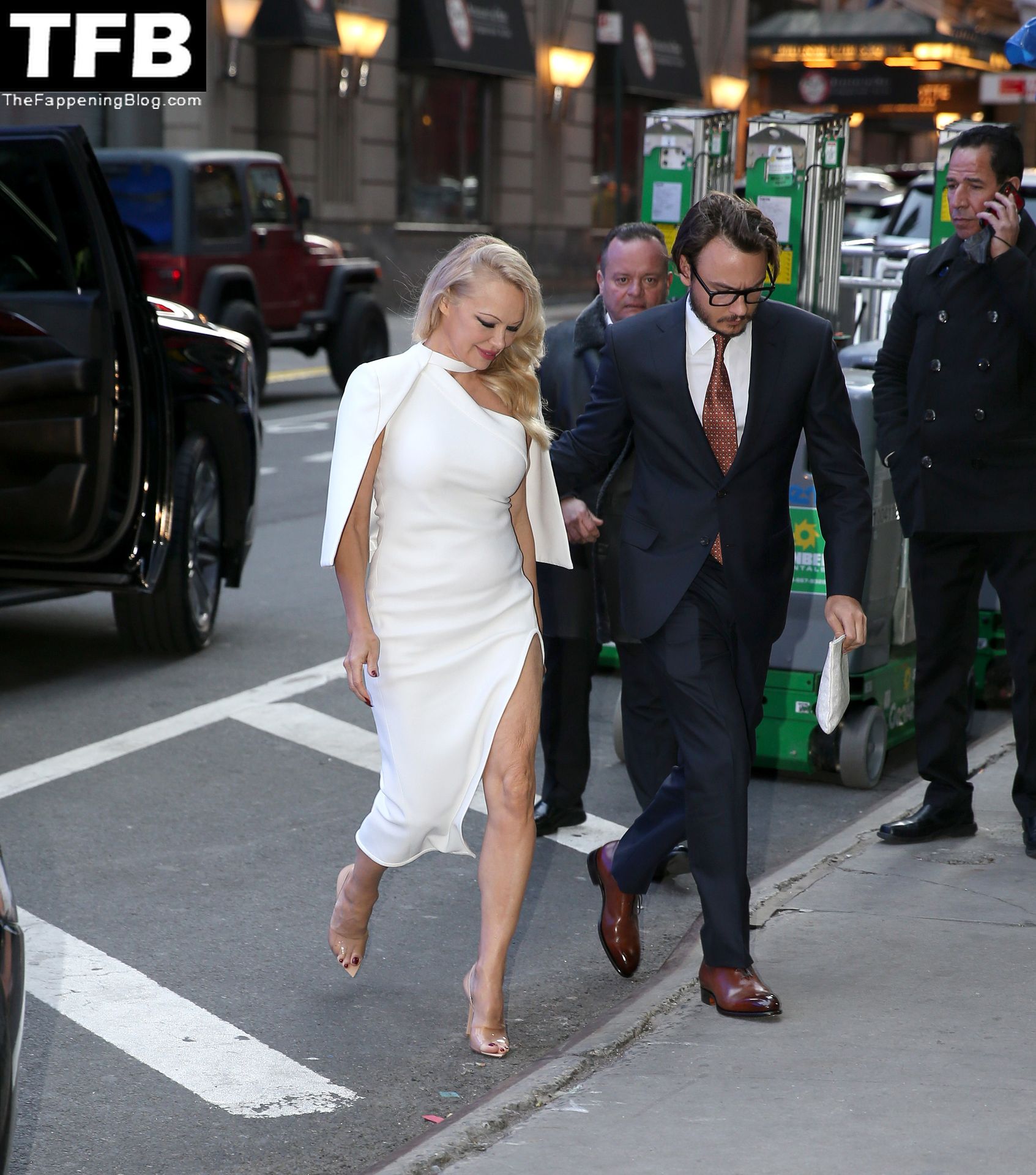 Pamela Anderson chega ao Good Morning America em Nova York, 23/03/2022. A atriz e modelo de 54 anos de “Baywatch” usava um vestido branco com um par de saltos transparentes.