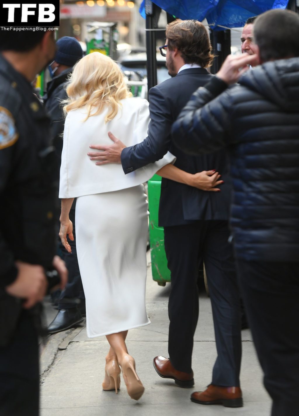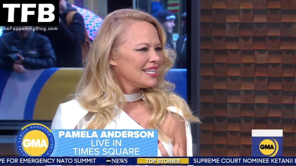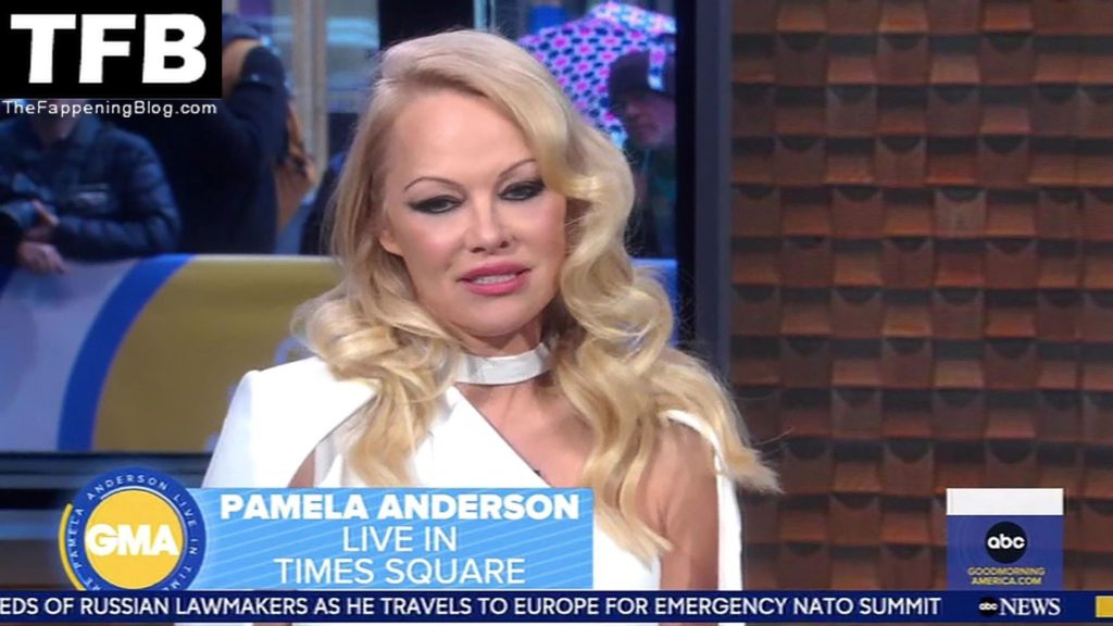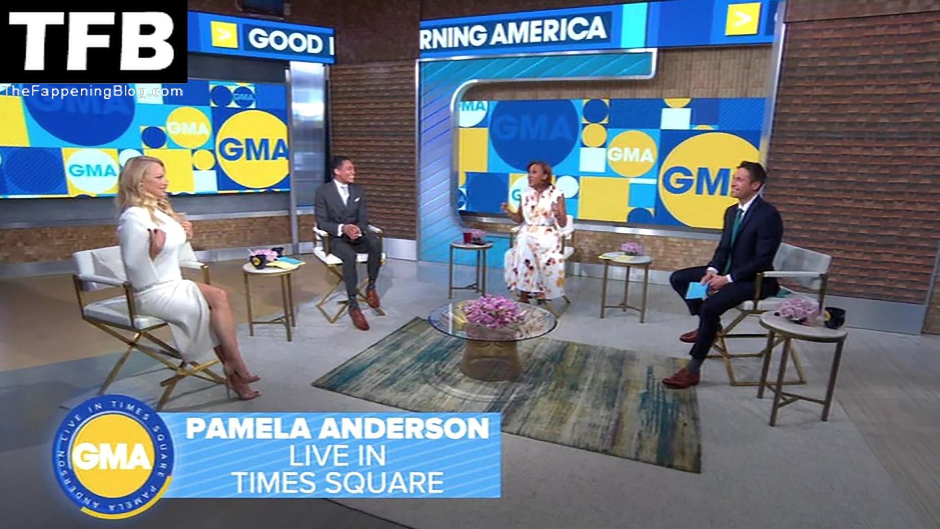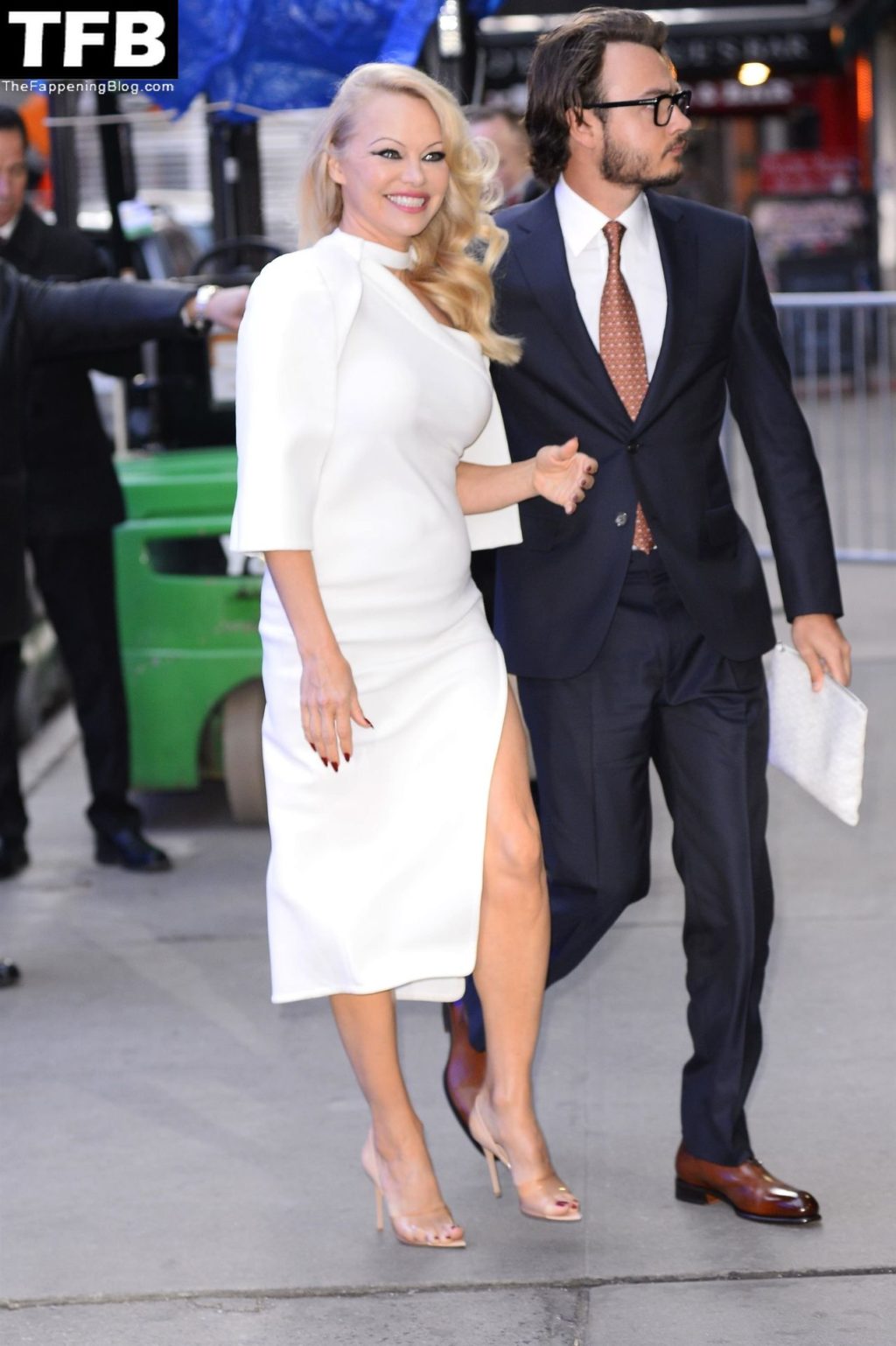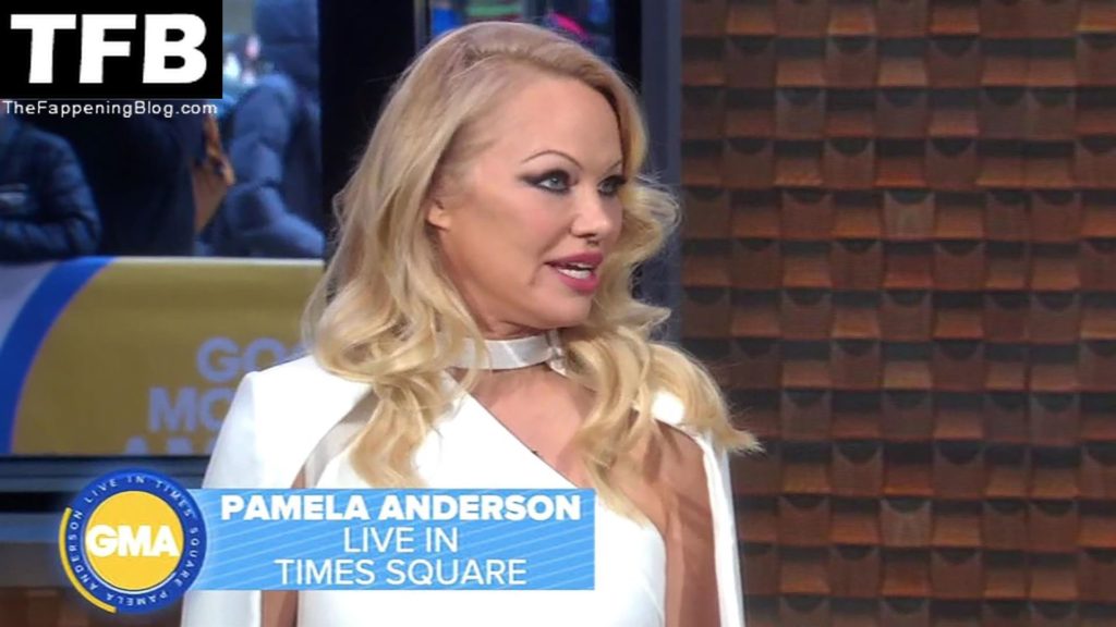 Pamela Anderson chega ao Good Morning America em Nova York, 23/03/2022. A atriz e modelo de 54 anos de “Baywatch” usava um vestido branco com um par de saltos transparentes.