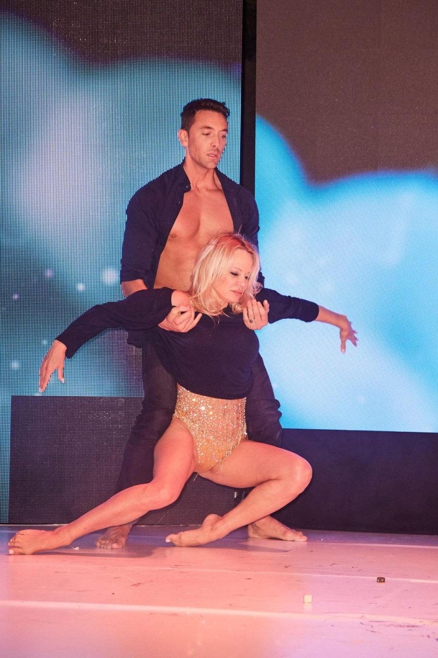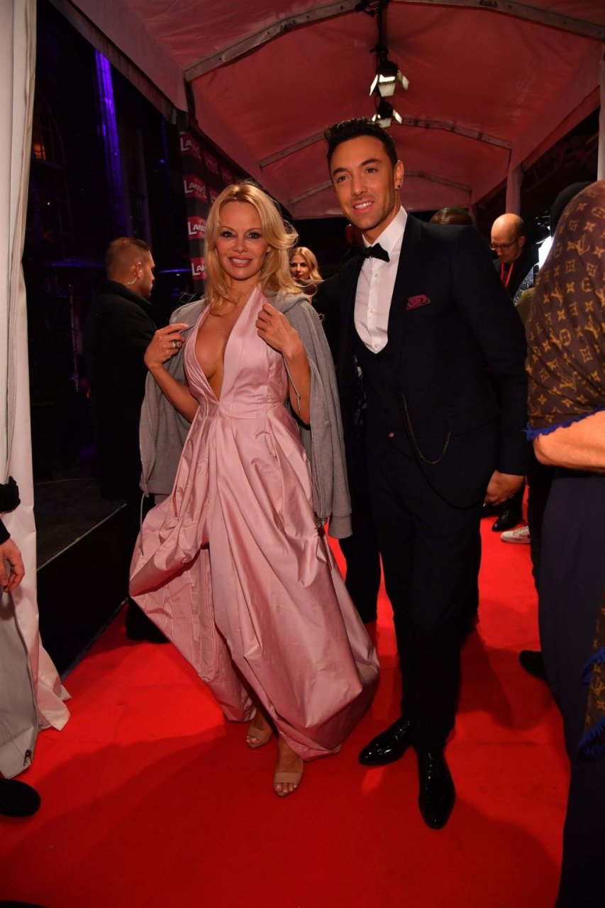 Aqui está Pamela Anderson mostrando os seios com um decote profundo antes de fazer uma performance estranha no Lambertz Monday Night em Colônia, Alemanha, 28/01/2019.