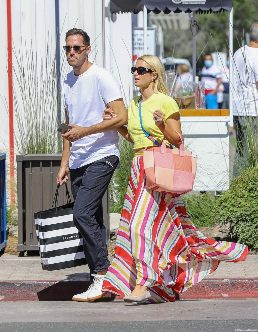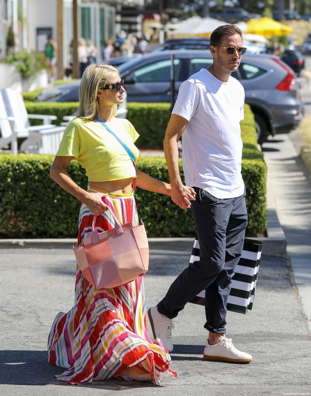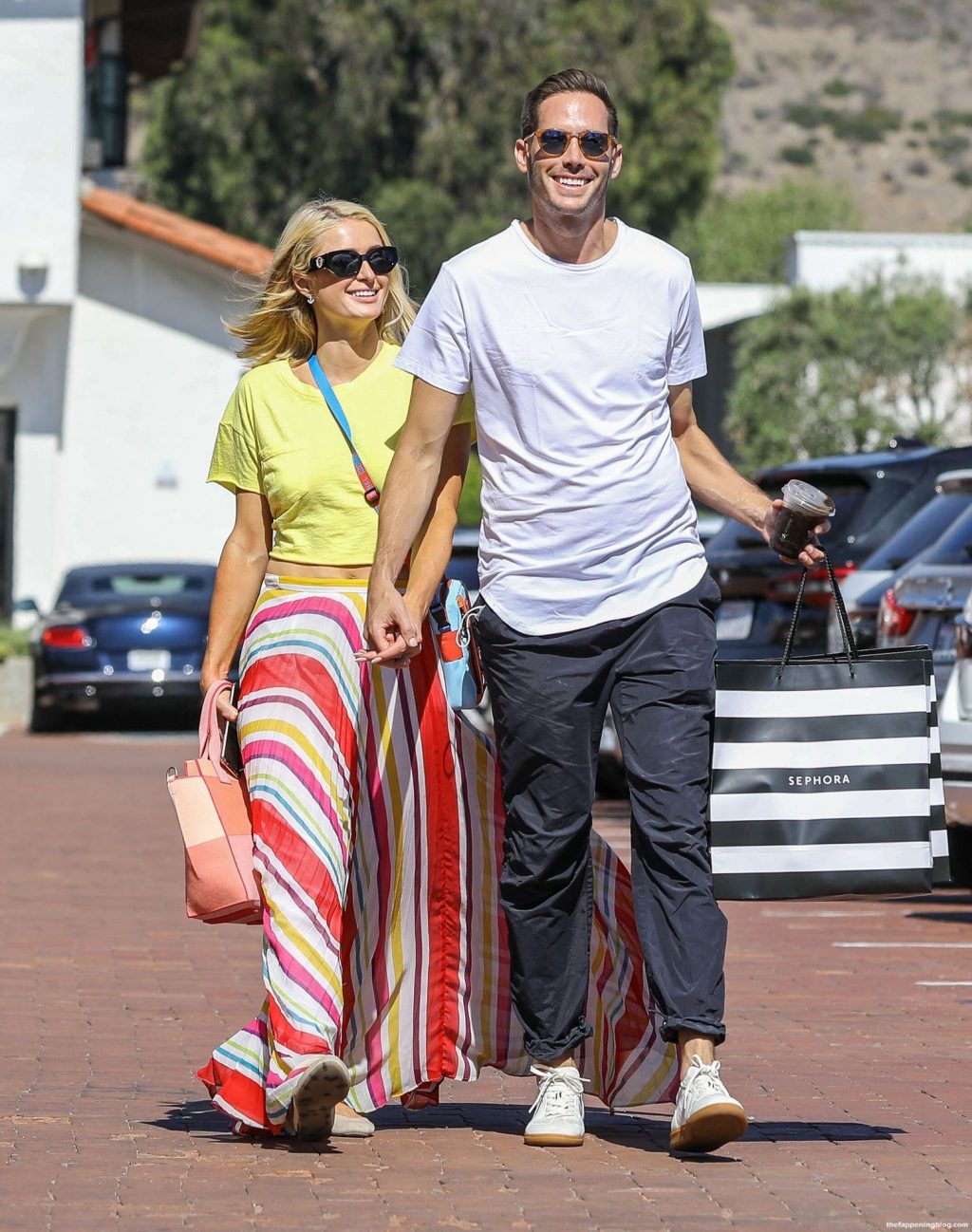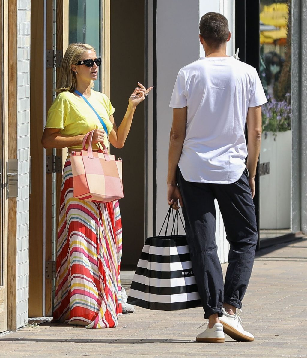 Stunning Paris Hilton é vista mostrando barriga lisa e seios em um top amarelo enquanto faz compras em Malibu, 31/07/2021.
