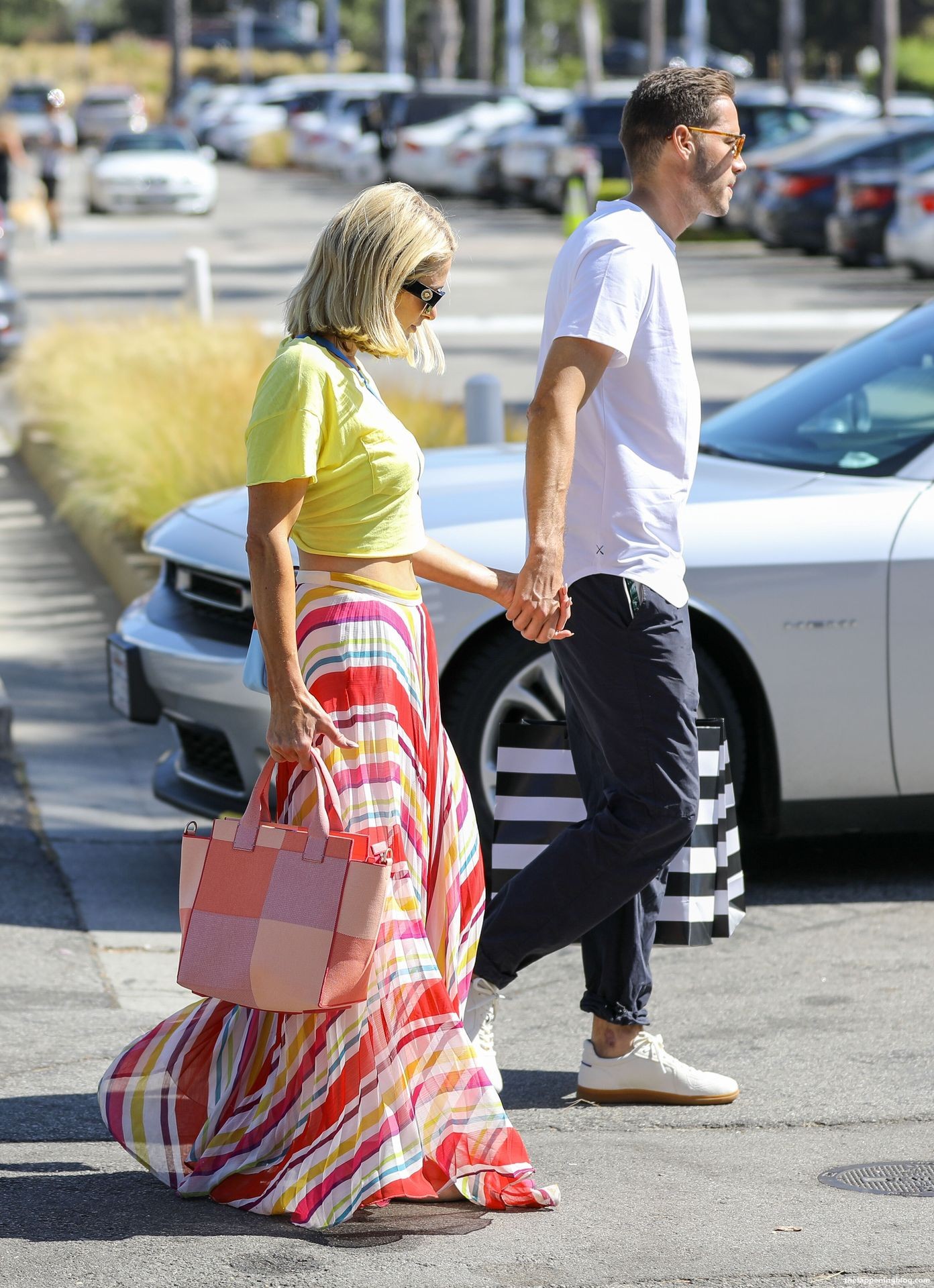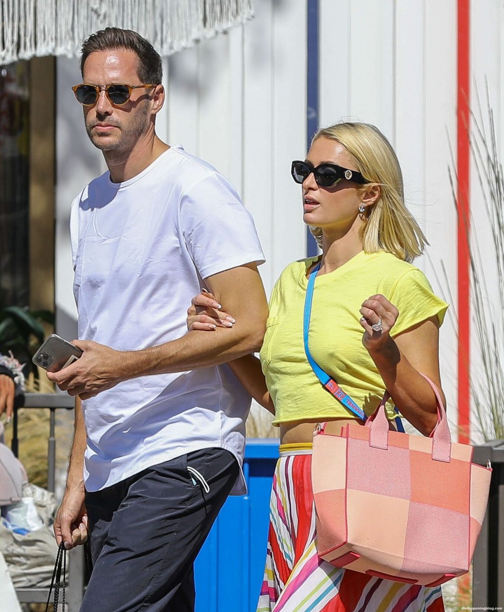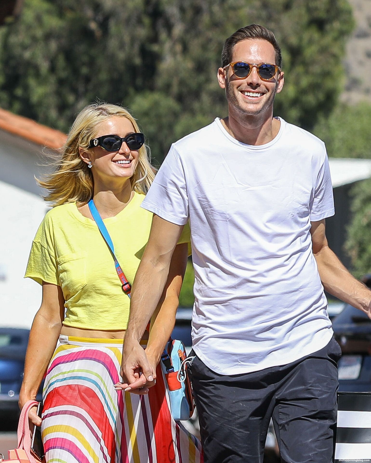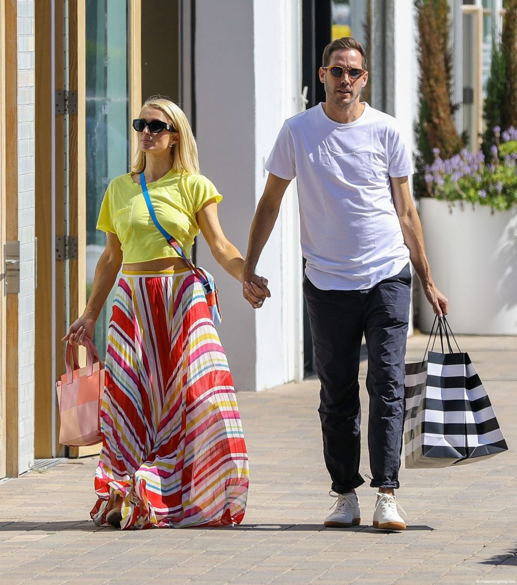 Stunning Paris Hilton é vista mostrando barriga lisa e seios em um top amarelo enquanto faz compras em Malibu, 31/07/2021.