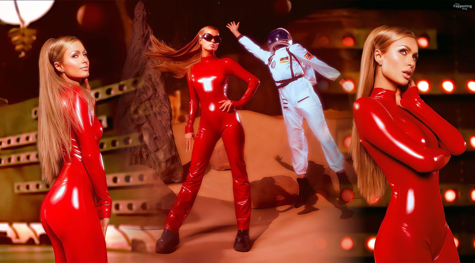 Paris Hilton posa com um traje de latex vermelho para o ensaio “Oops!… I Did It Again”.