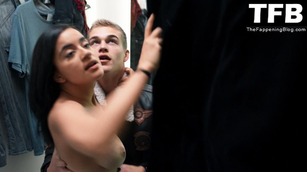 Paulina Gaitan está montada em um rapaz em um vestiário, tirando a camisa pela cabeça para ficar topless e mostrando seu seio direito algumas vezes, especialmente quando ela estica o braço para fechar a cortina atrás dela.