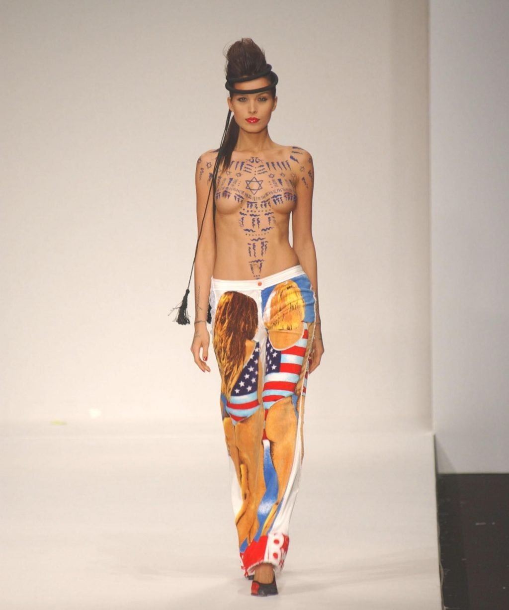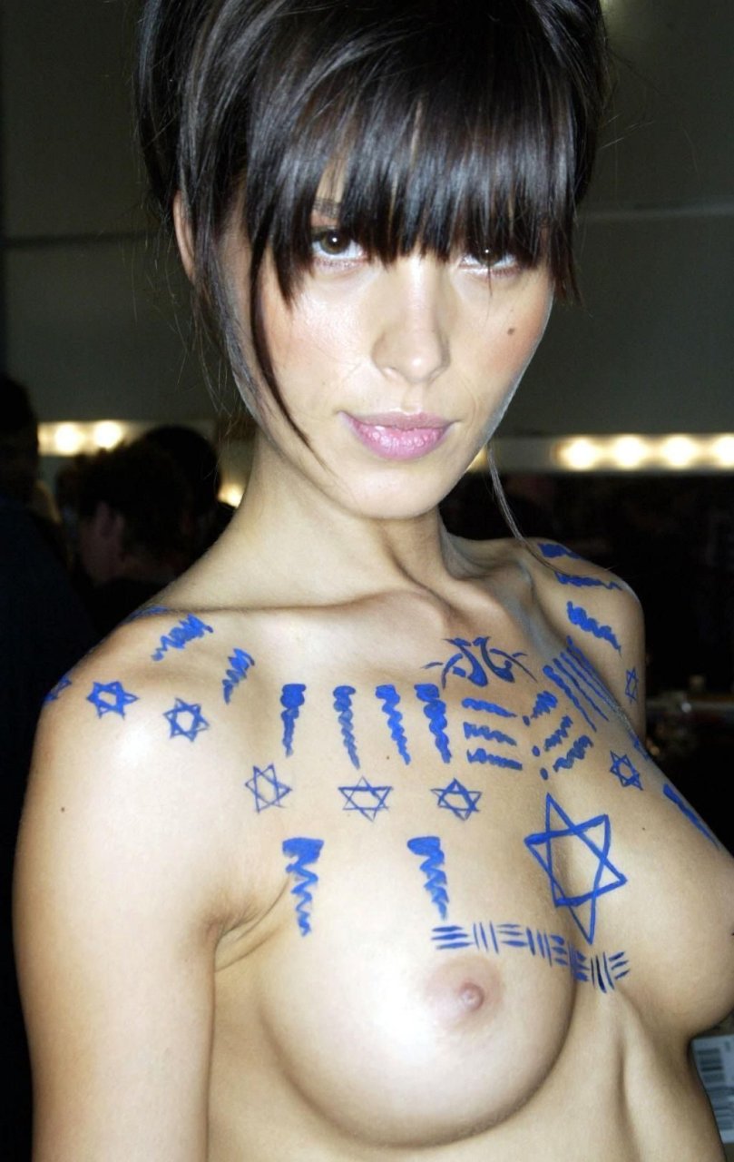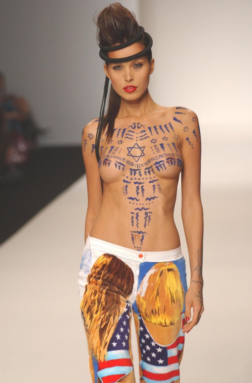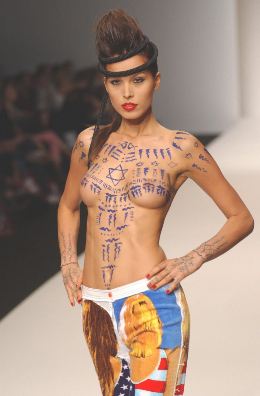 Modelo tcheca e apresentadora de TV Petra Nemcova participou de um desfile de moda com arte corporal ousada (2004). A artista decorou seus magníficos seios nus com a Estrela de Davi.