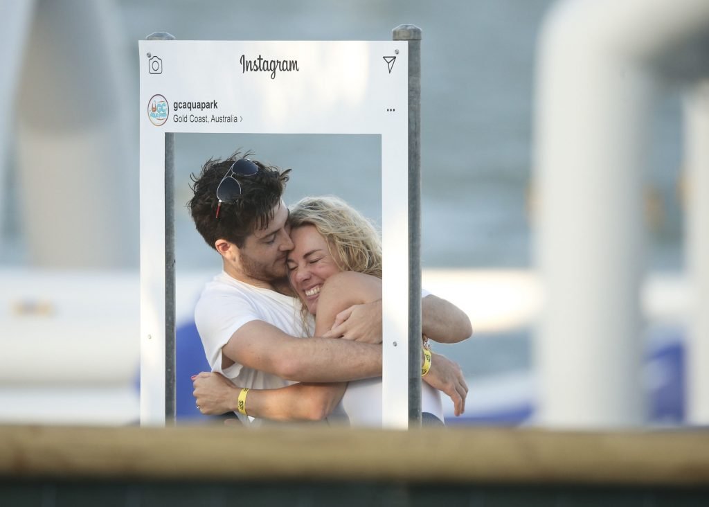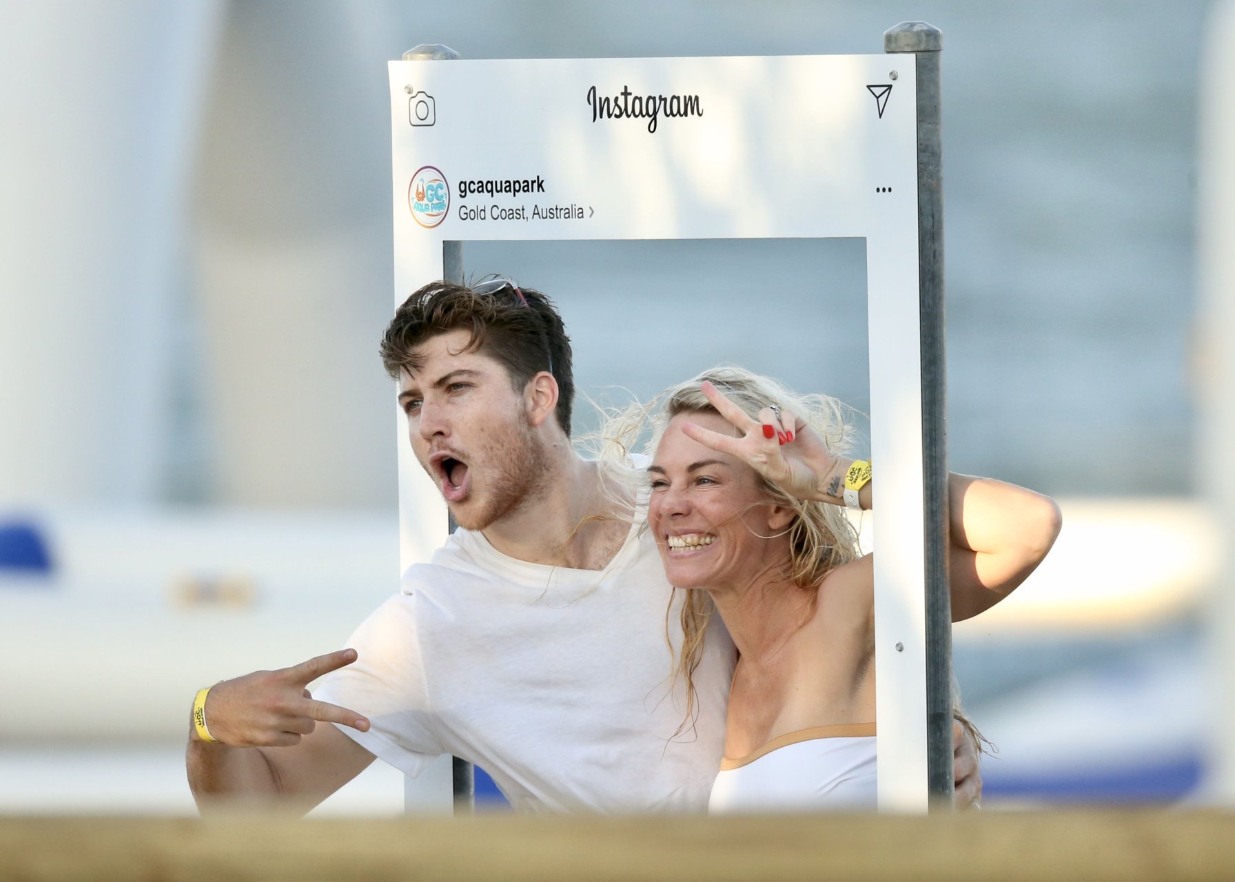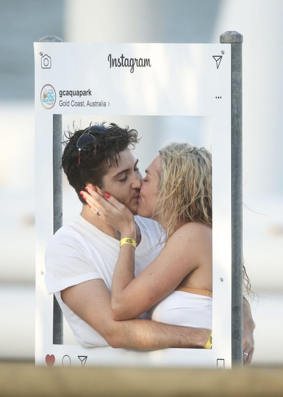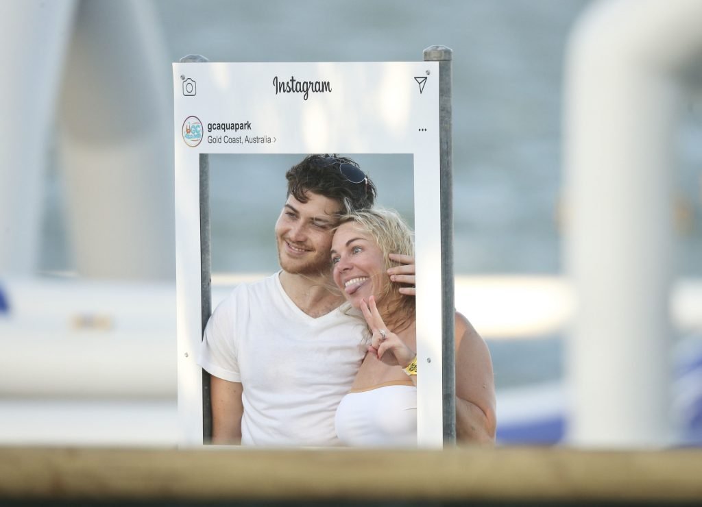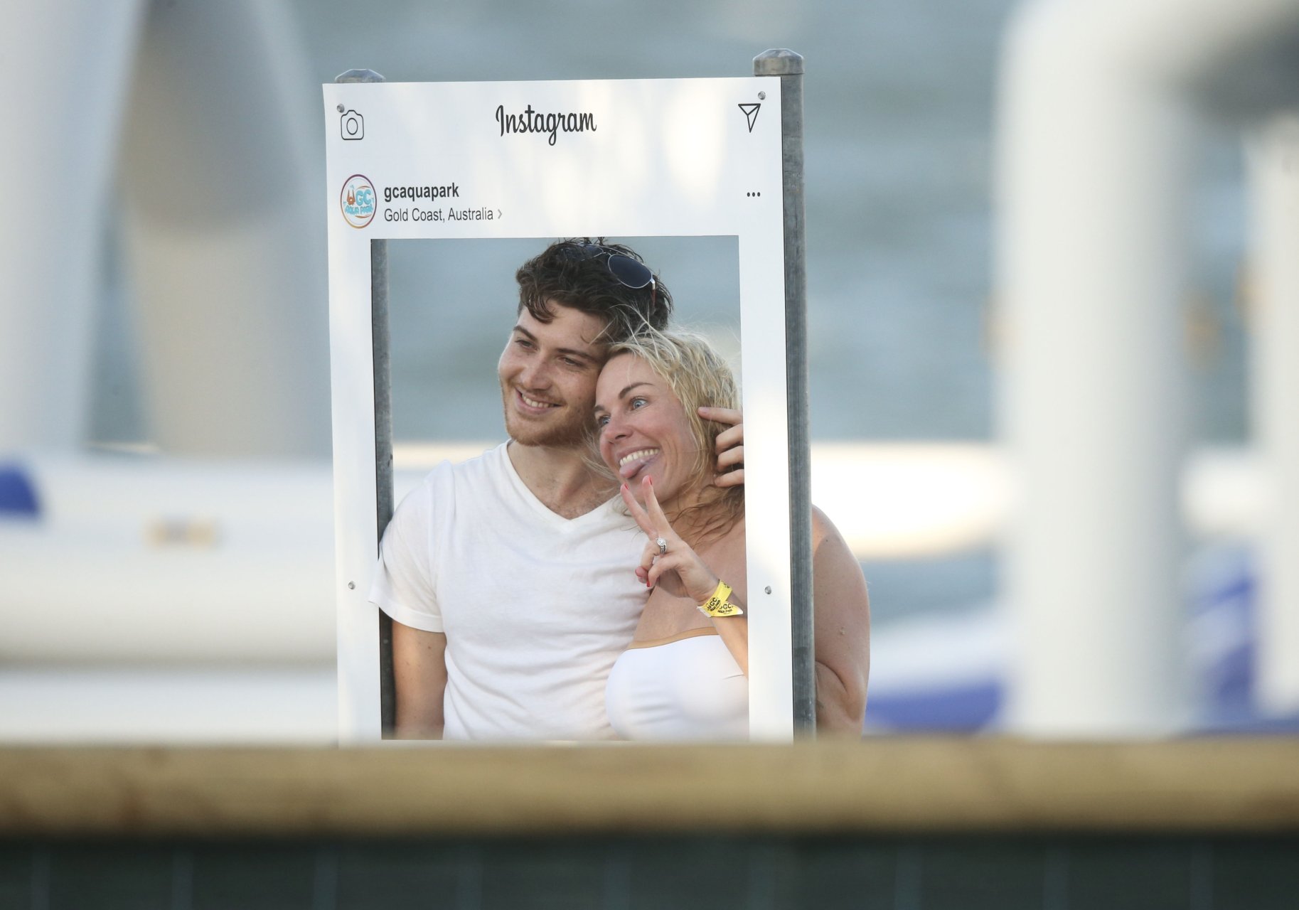 O casal de “Bride And Prejudice” Philippa Bennett (39) e Ry McLean (21) mostram que conseguiram chegar ao altar apesar das objeções familiares, exibindo suas alianças em um dia no Gold Coast Aqua Park na Austrália, 11/07/2018. O casal parecia loucamente apaixonado e não conseguia ficar longe um do outro, beijando-se e abraçando-se durante todo o dia.