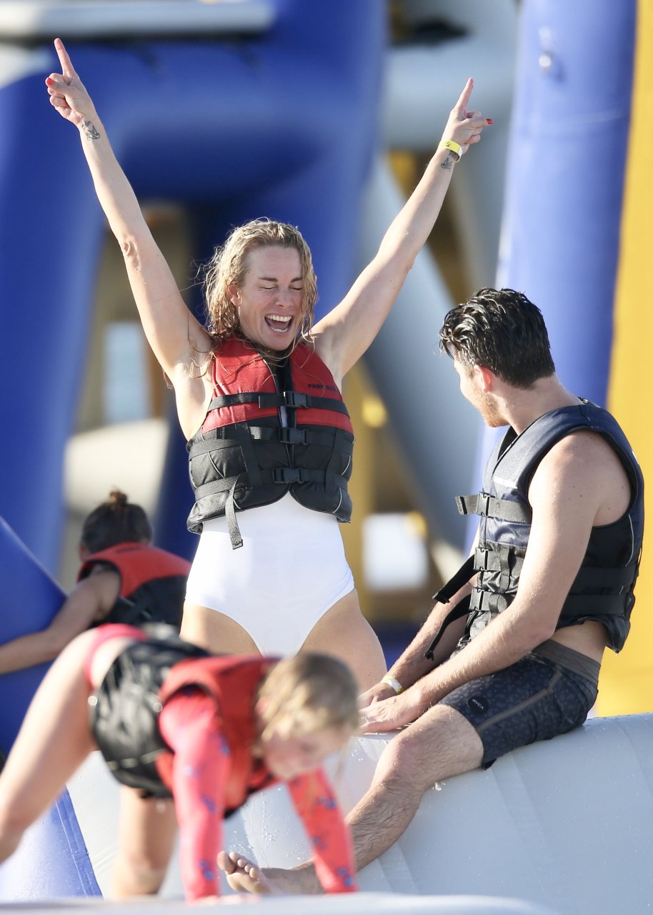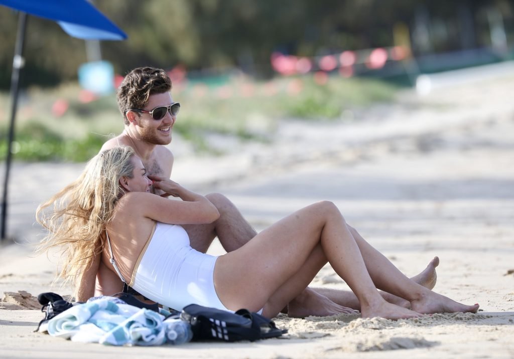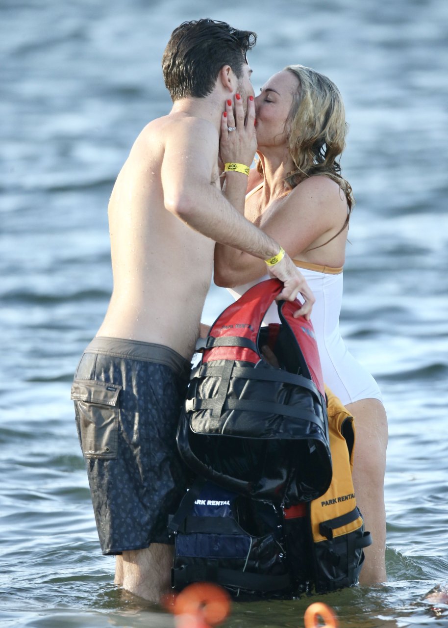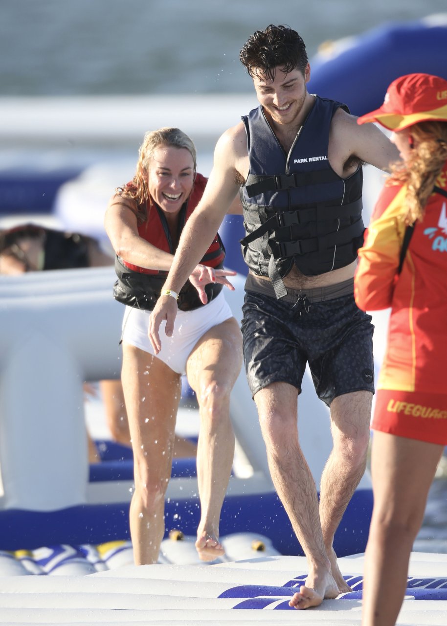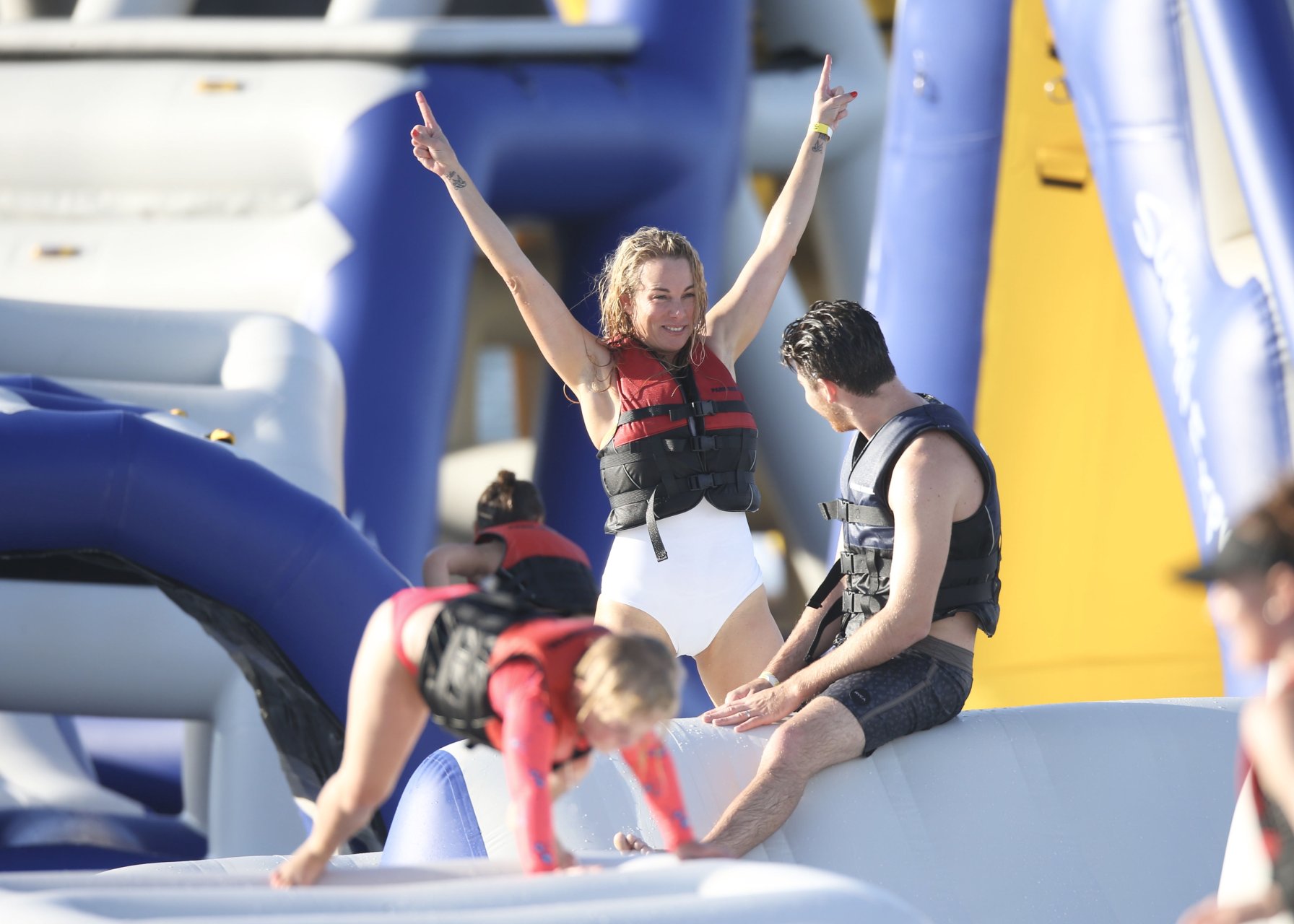 O casal de “Bride And Prejudice” Philippa Bennett (39) e Ry McLean (21) mostram que conseguiram chegar ao altar apesar das objeções familiares, exibindo suas alianças em um dia no Gold Coast Aqua Park na Austrália, 11/07/2018. O casal parecia loucamente apaixonado e não conseguia ficar longe um do outro, beijando-se e abraçando-se durante todo o dia.