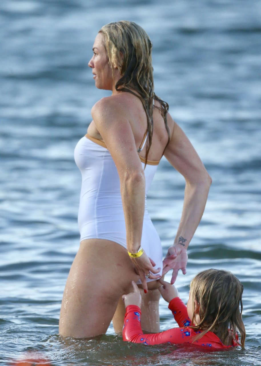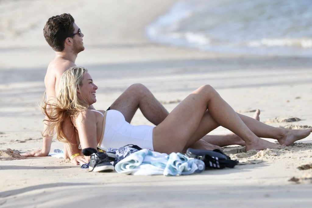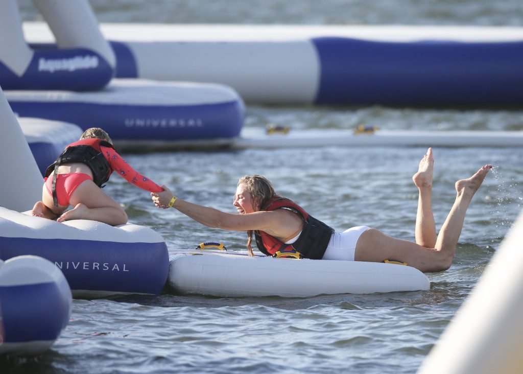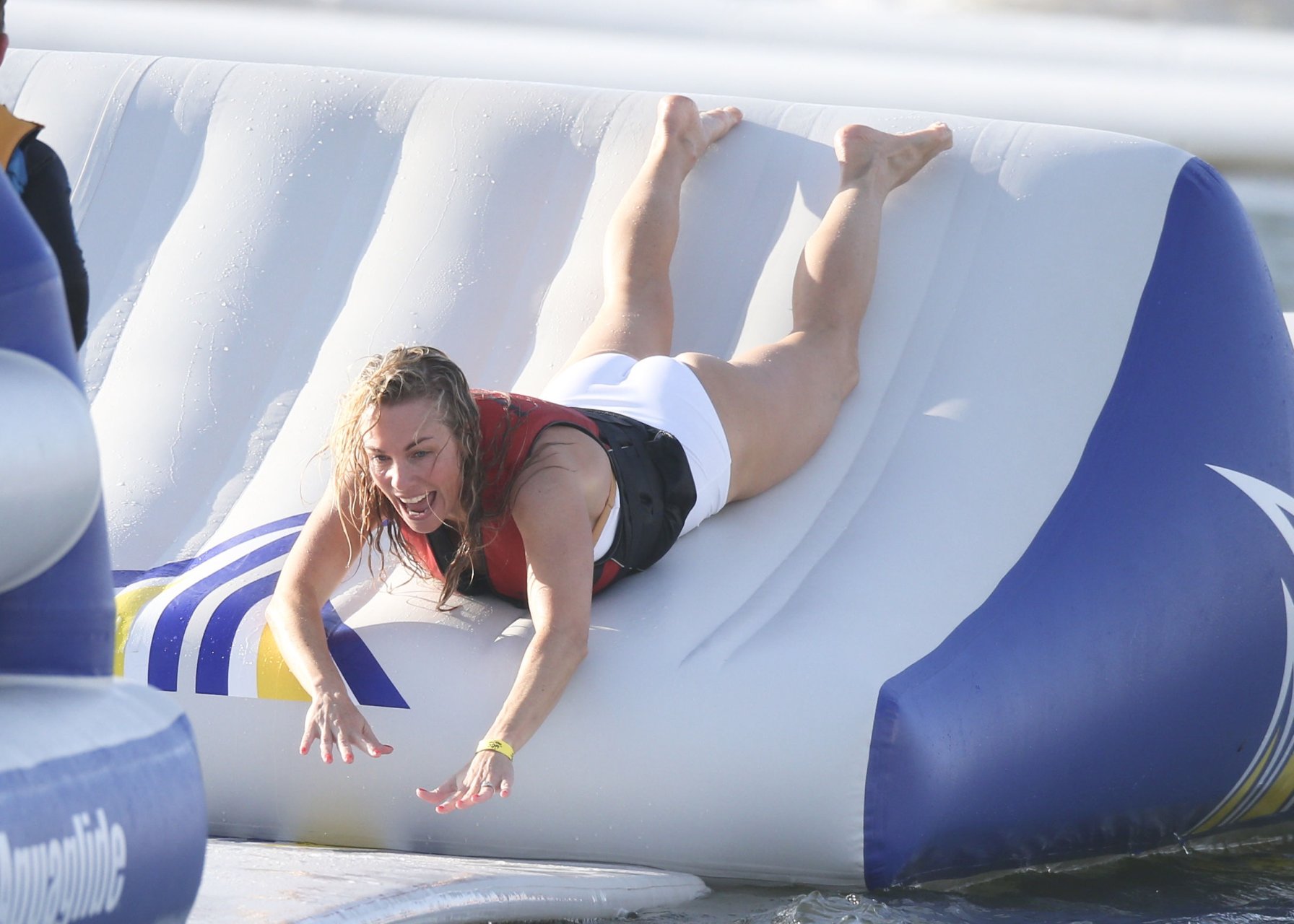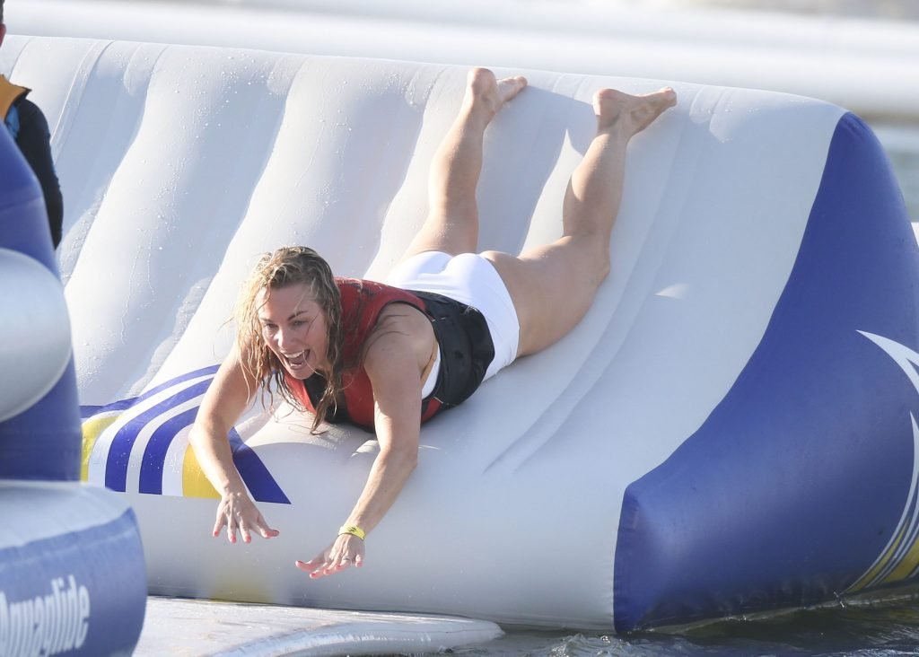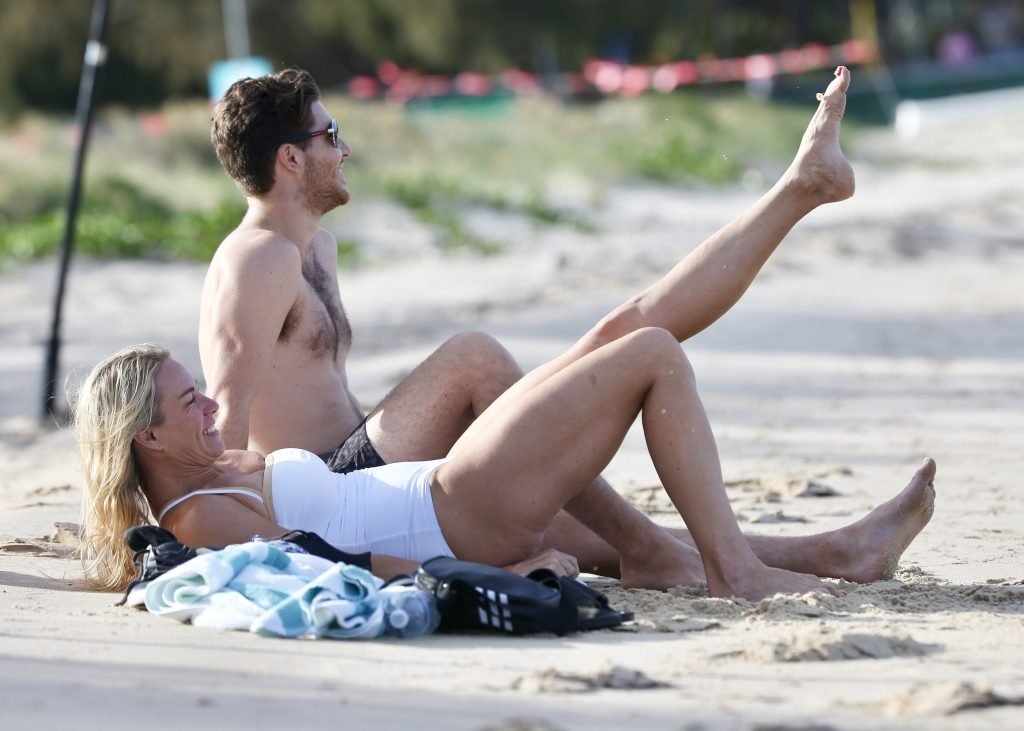 O casal de “Bride And Prejudice” Philippa Bennett (39) e Ry McLean (21) mostram que conseguiram chegar ao altar apesar das objeções familiares, exibindo suas alianças em um dia no Gold Coast Aqua Park na Austrália, 11/07/2018. O casal parecia loucamente apaixonado e não conseguia ficar longe um do outro, beijando-se e abraçando-se durante todo o dia.