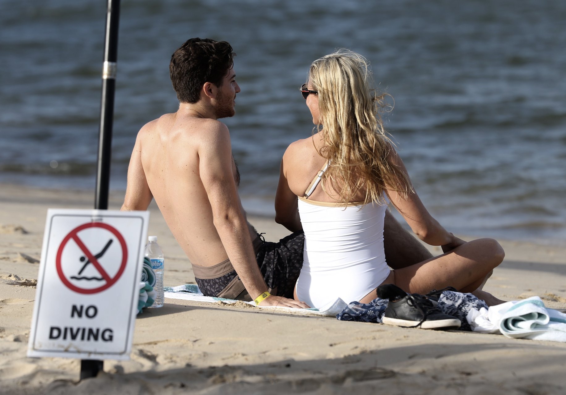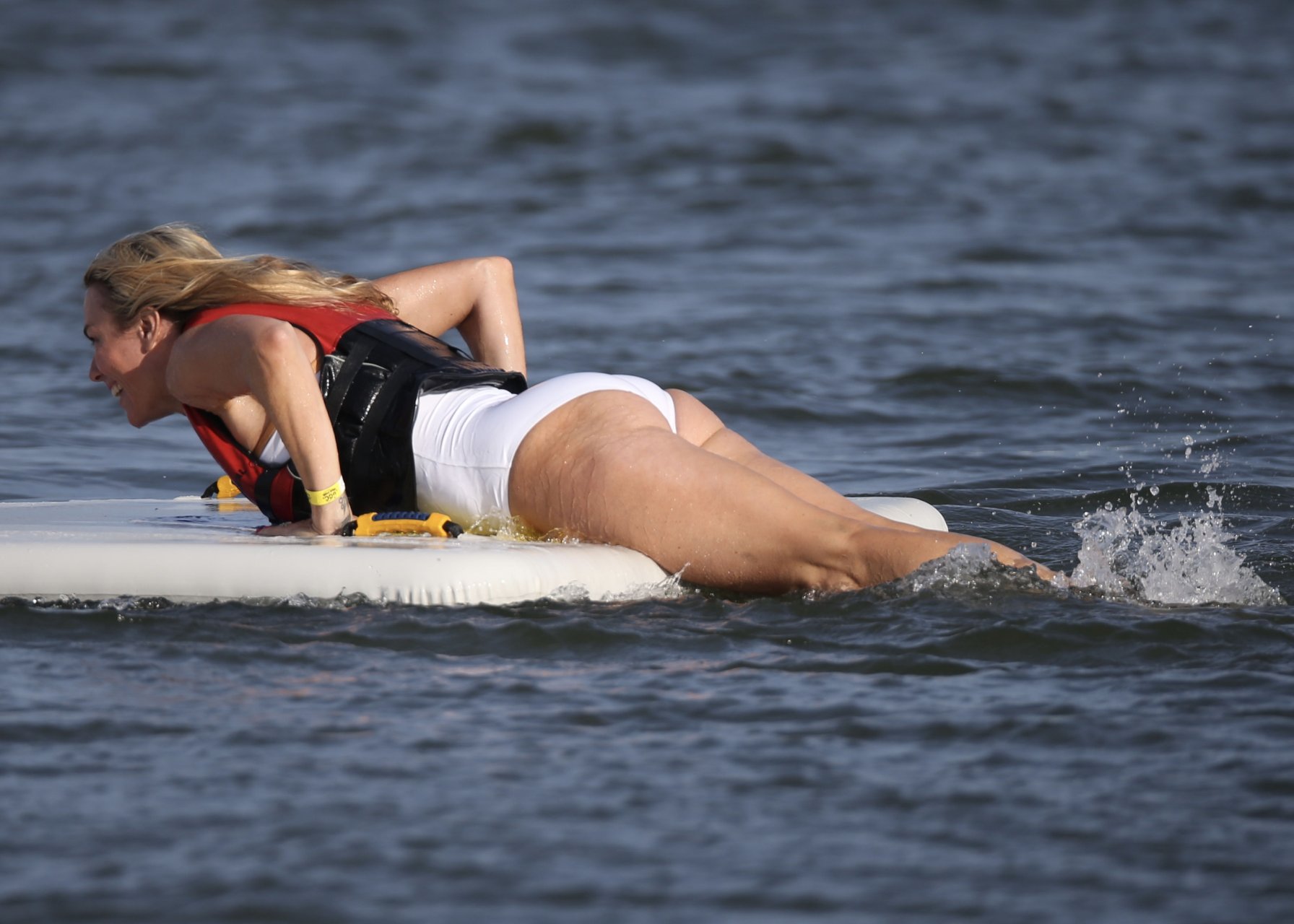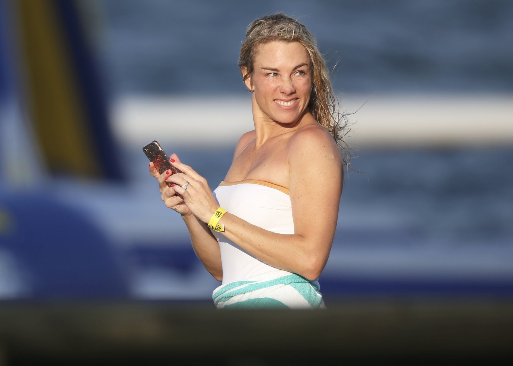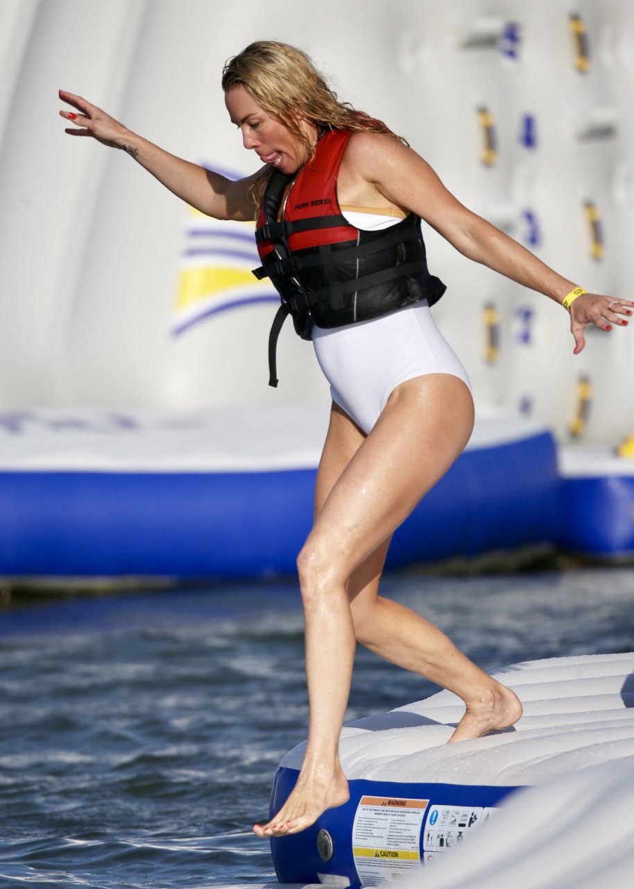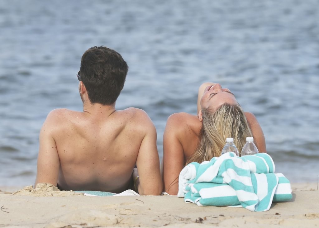 O casal de “Bride And Prejudice” Philippa Bennett (39) e Ry McLean (21) mostram que conseguiram chegar ao altar apesar das objeções familiares, exibindo suas alianças em um dia no Gold Coast Aqua Park na Austrália, 11/07/2018. O casal parecia loucamente apaixonado e não conseguia ficar longe um do outro, beijando-se e abraçando-se durante todo o dia.