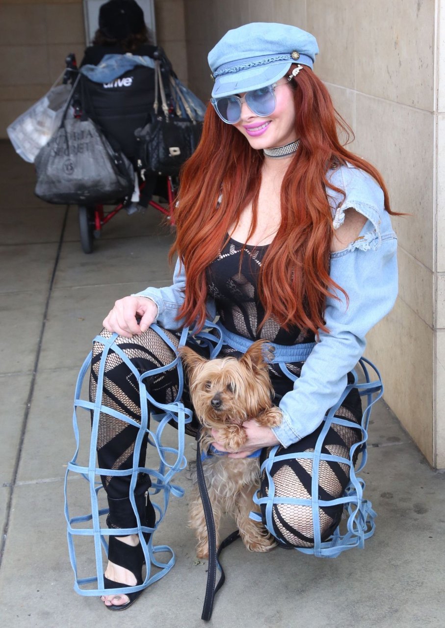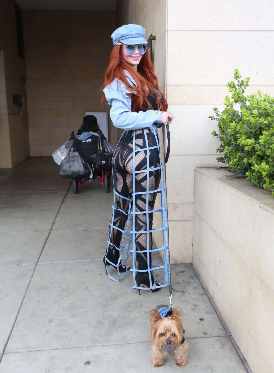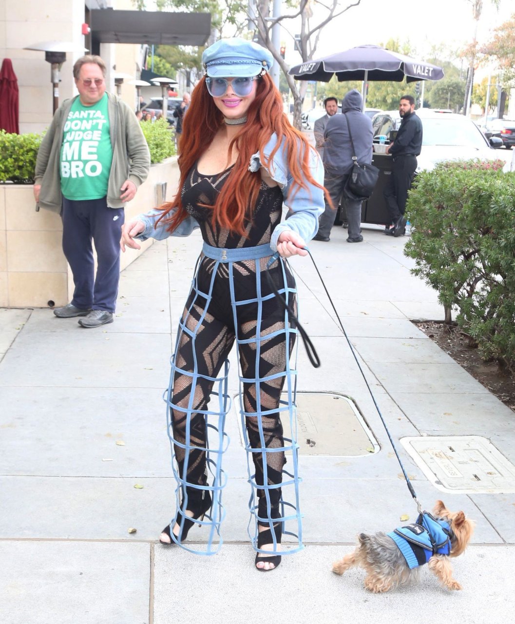 Phoebe Price exibe seus atributos enquanto passeia com seu cachorro em Beverly Hills, 01/03/2019. A modelo usava uma roupa interessante – calças azuis com recortes em formato de gaiola com lingerie preta de malha por baixo, um boné estilo “newsboy” e óculos de sol azuis. Esta senhora sabe como posar!