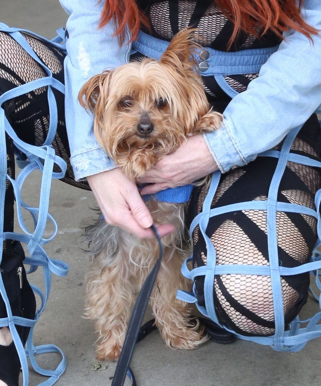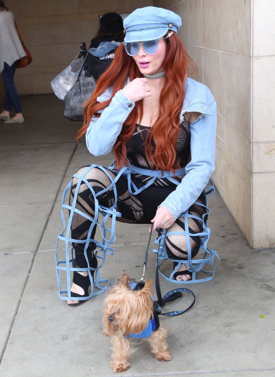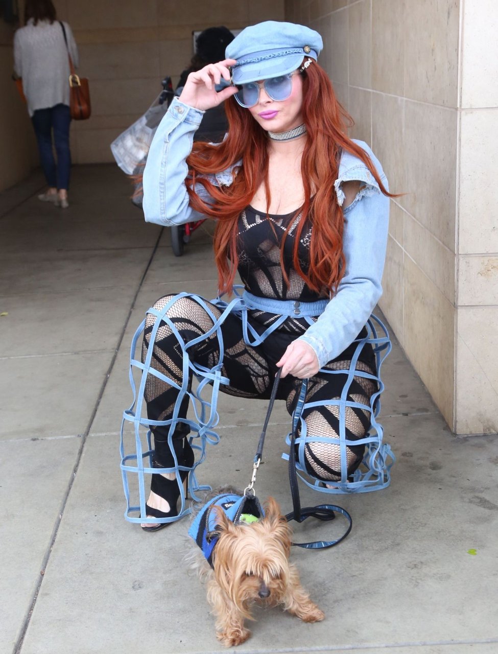 Phoebe Price exibe seus atributos enquanto passeia com seu cachorro em Beverly Hills, 01/03/2019. A modelo usava uma roupa interessante – calças azuis com recortes em formato de gaiola com lingerie preta de malha por baixo, um boné estilo “newsboy” e óculos de sol azuis. Esta senhora sabe como posar!