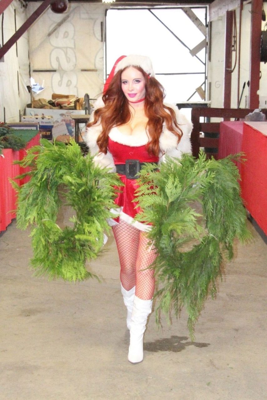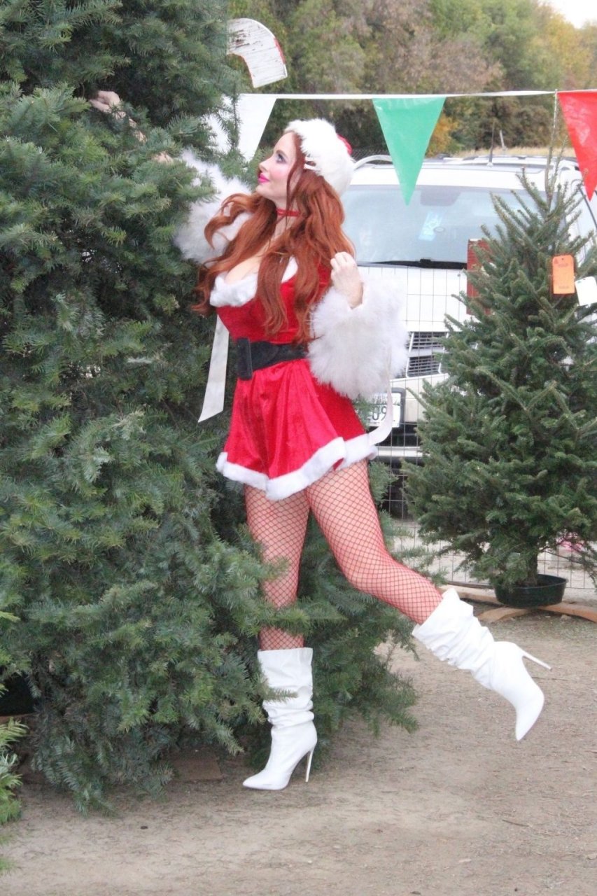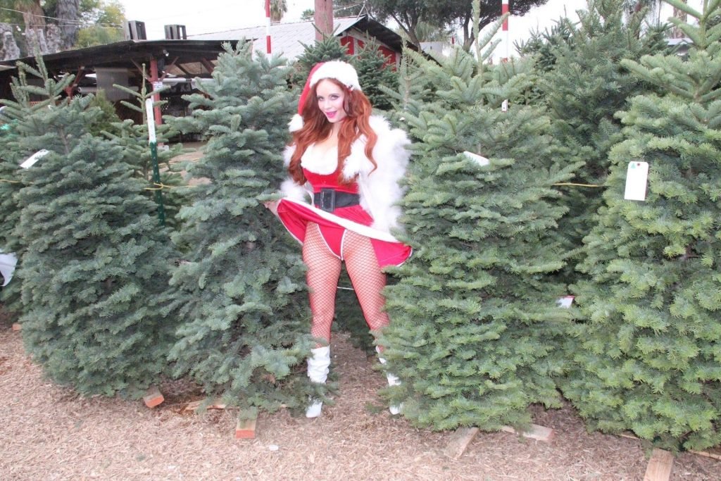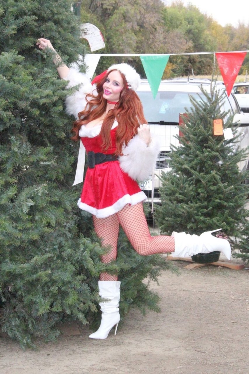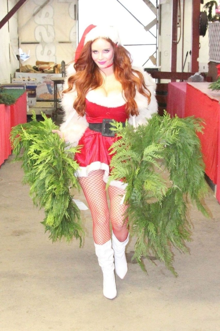 Phoebe Price entra no espírito natalino enquanto se veste de Papai Noel em uma fazenda de árvores de Natal em Los Angeles, 14/12/2018.