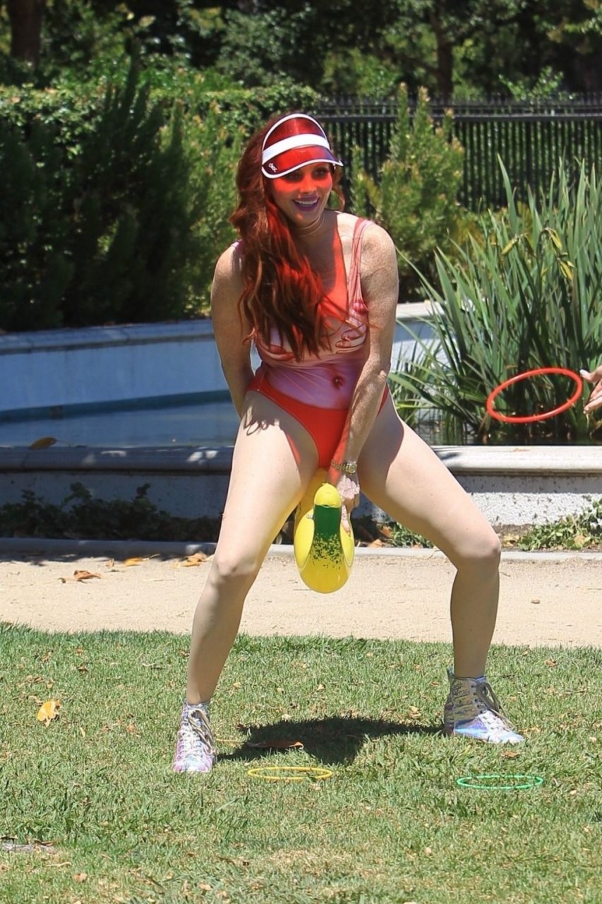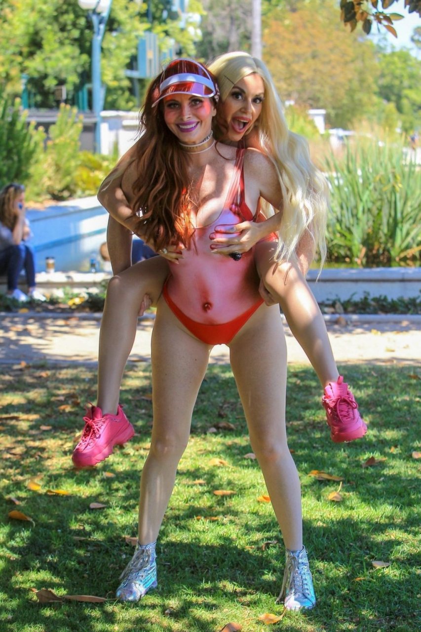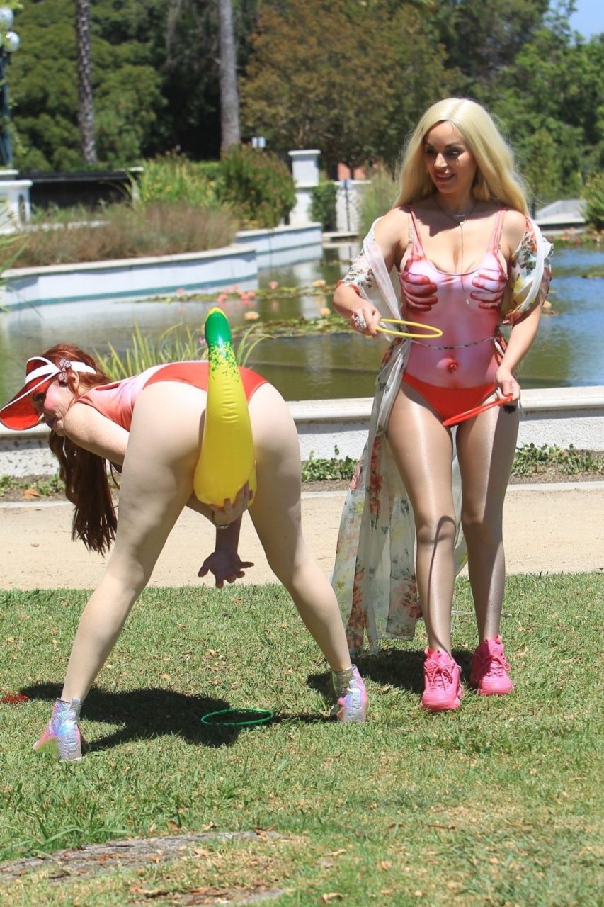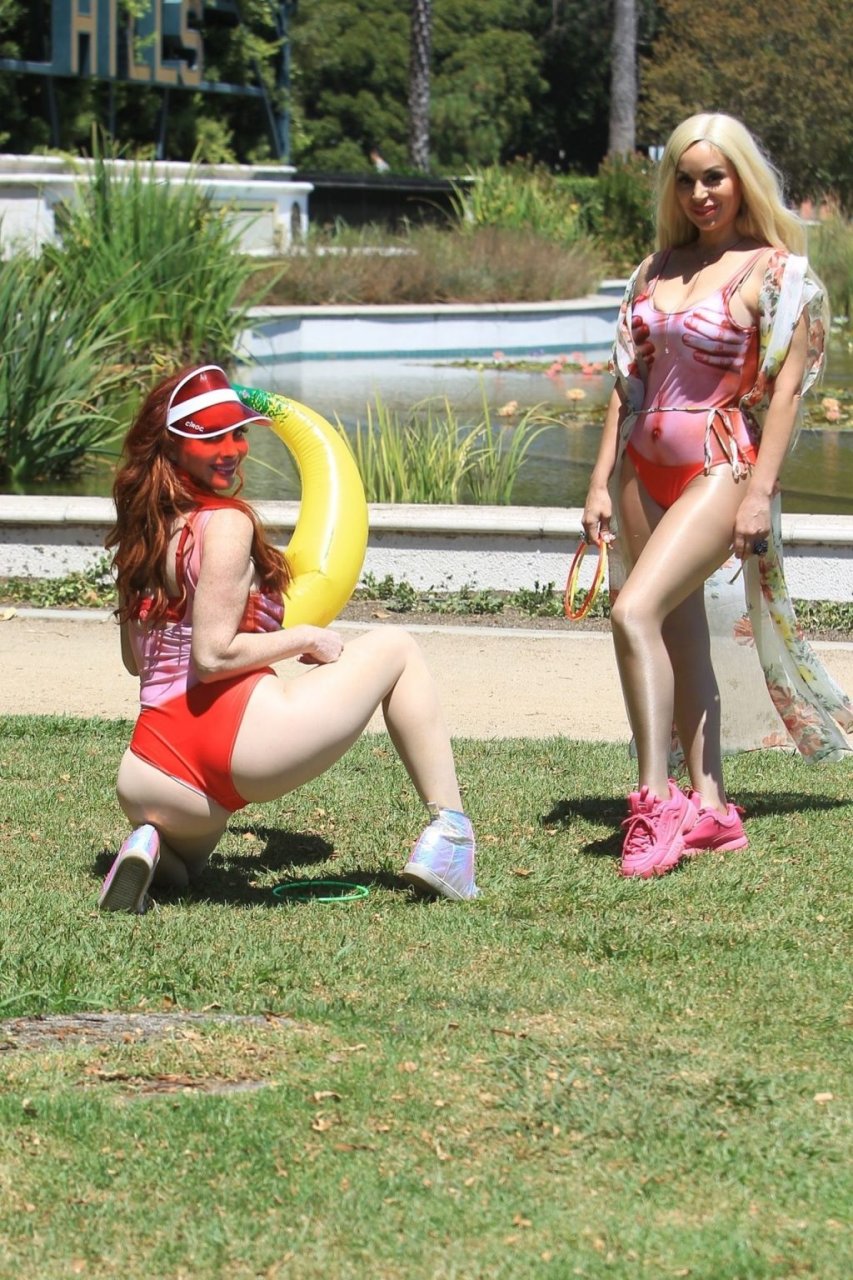 Phoebe Price e Marcela Iglesias se divertem no parque em Beverly Hills e exibem um visual ousado com bodys vermelhos, 15/08/2019. Phoebe, é hora de brincar com uma banana “normal”!