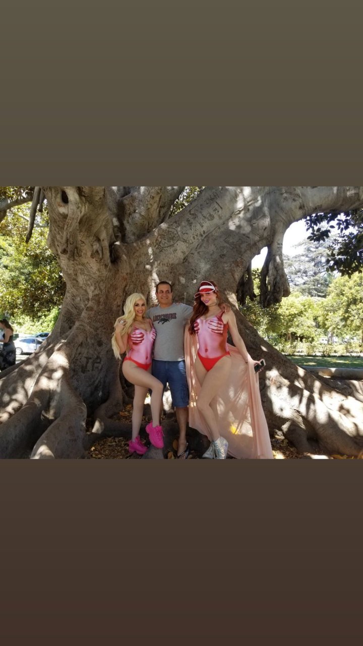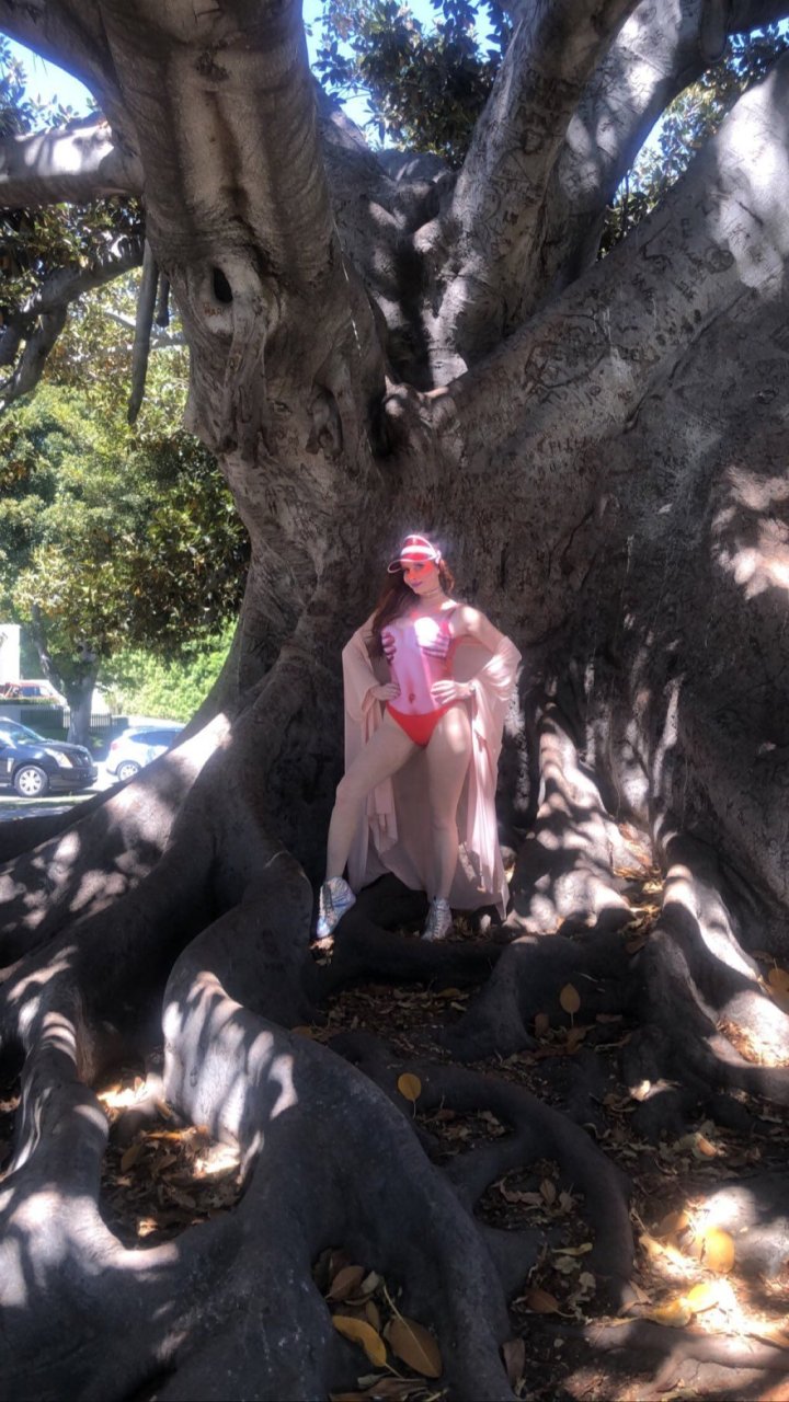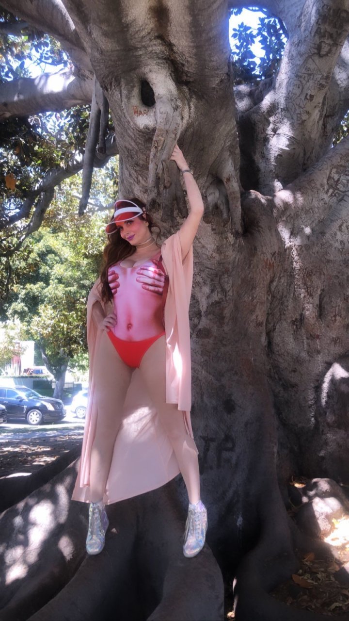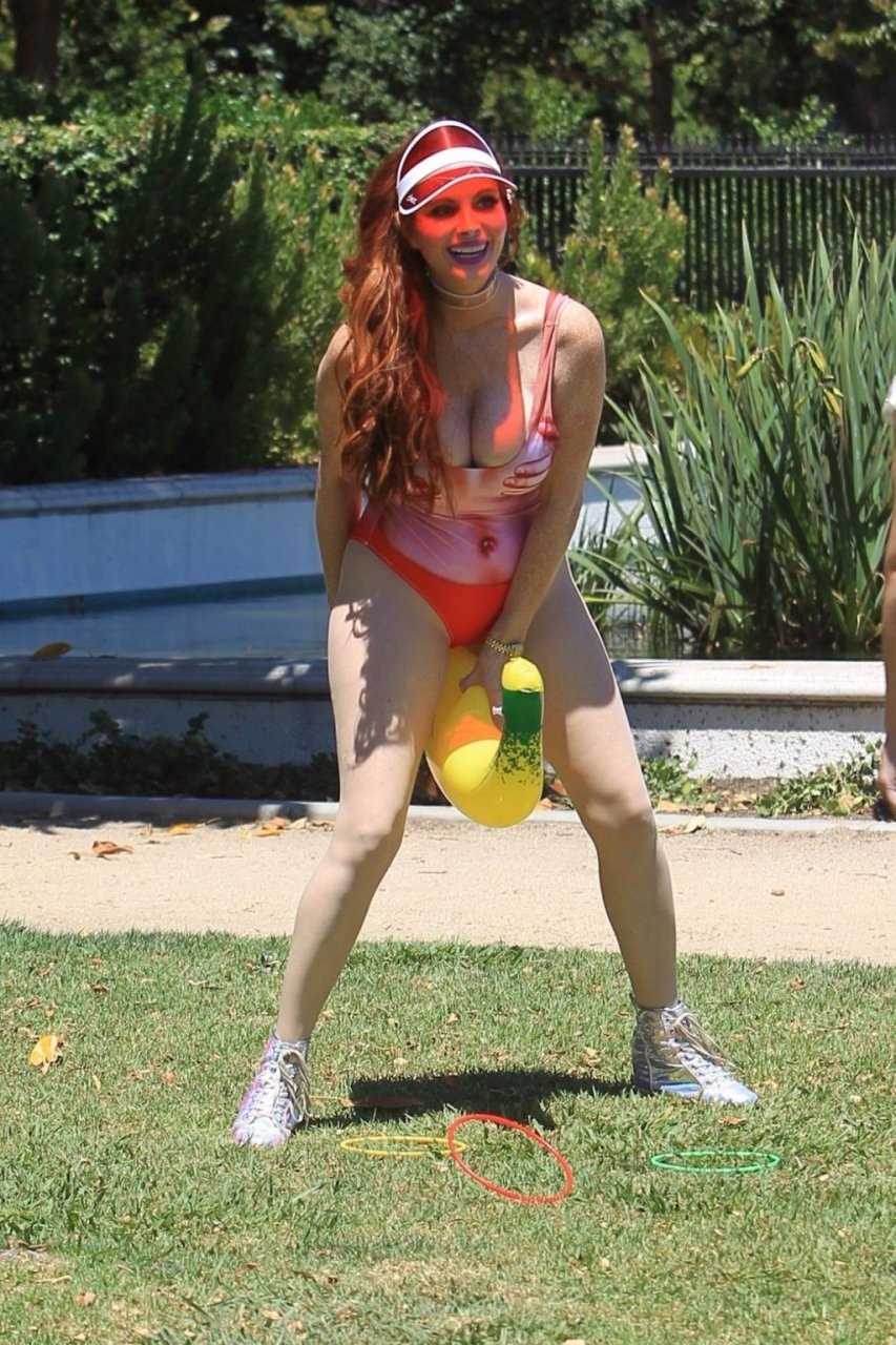 Phoebe Price e Marcela Iglesias se divertem no parque em Beverly Hills e exibem um visual ousado com bodys vermelhos, 15/08/2019. Phoebe, é hora de brincar com uma banana “normal”!