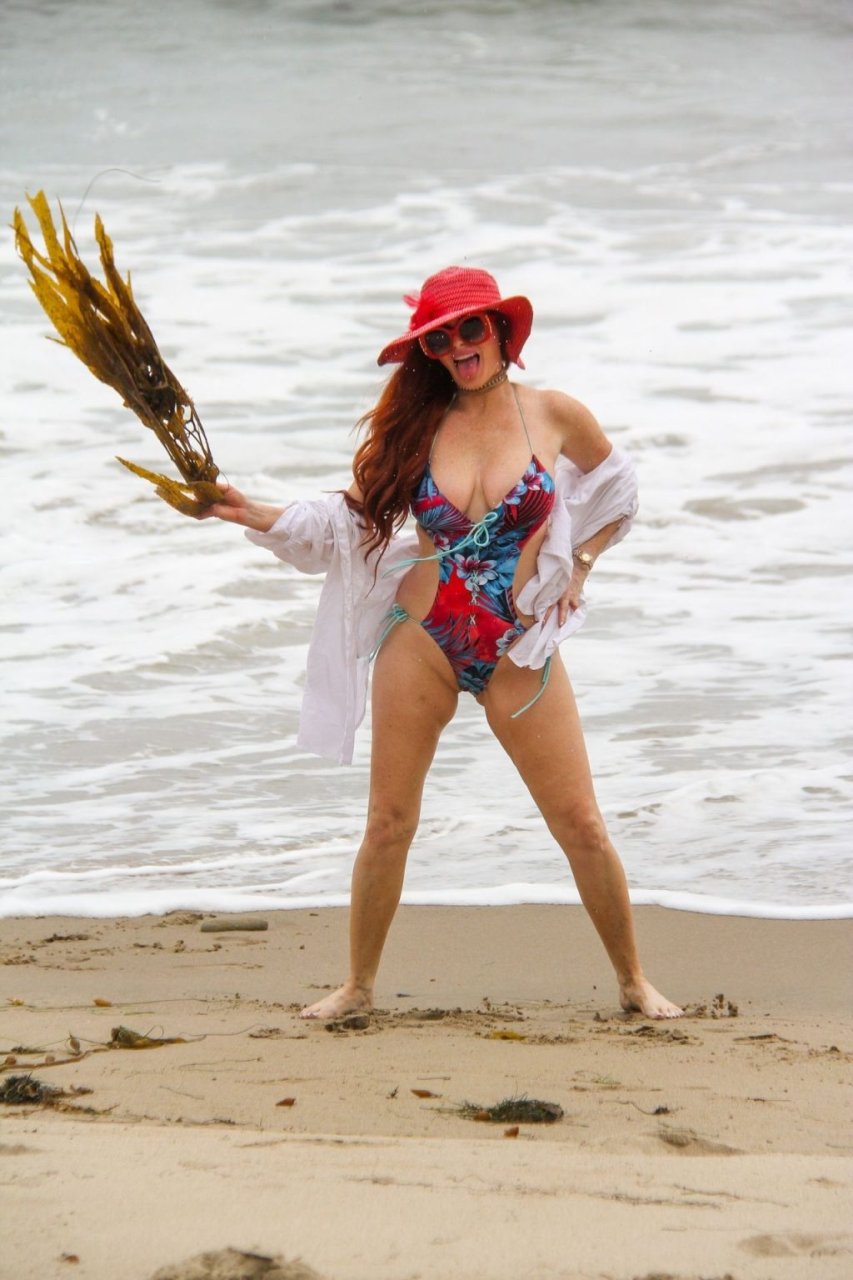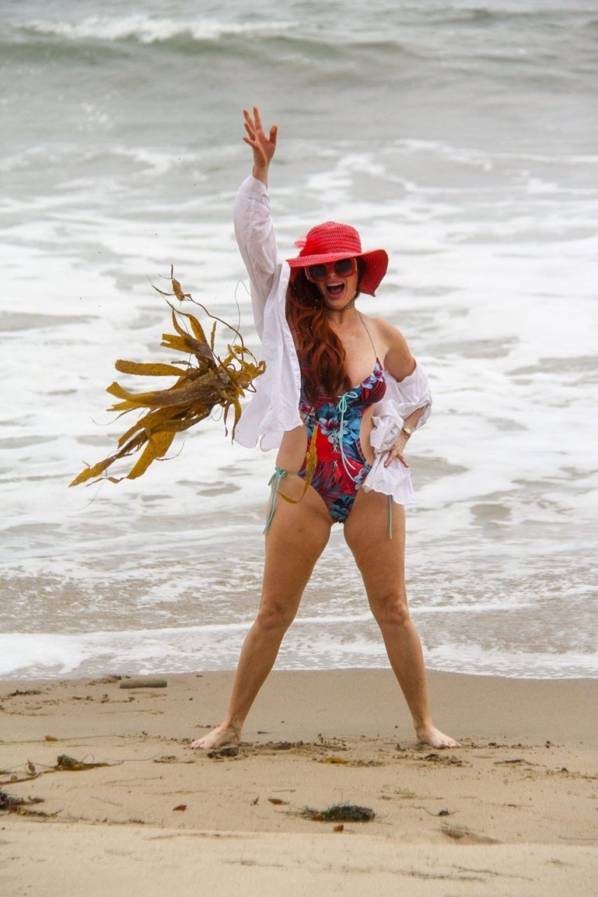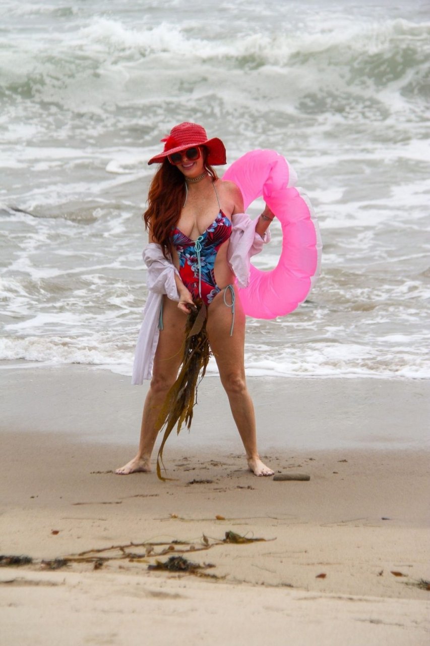 A aspirante a atriz Phoebe Price está aproveitando o clima quente com uma viagem às praias de Malibu, 26/06/2019. A atriz de 46 anos apresenta uma série de poses sensuais enquanto se despe durante a diversão à beira-mar.