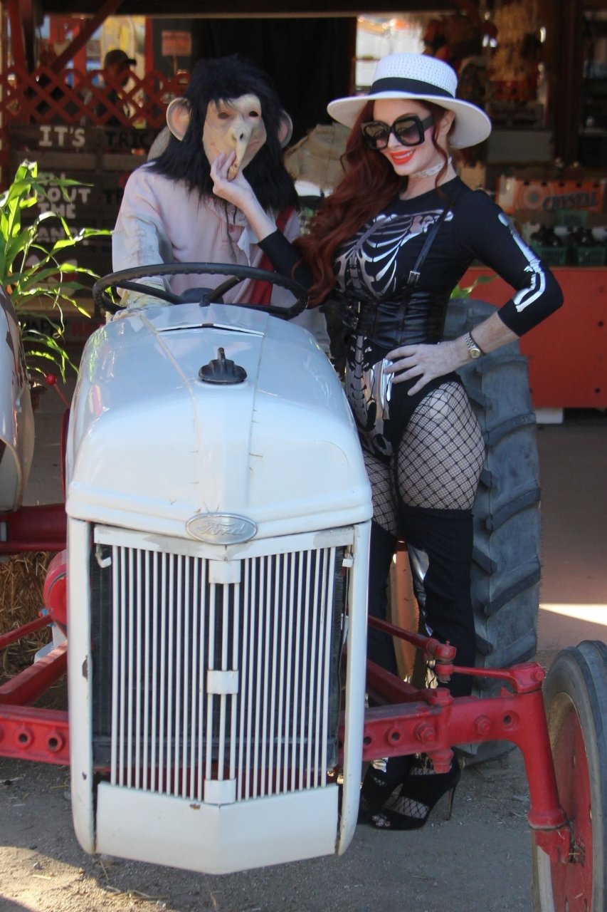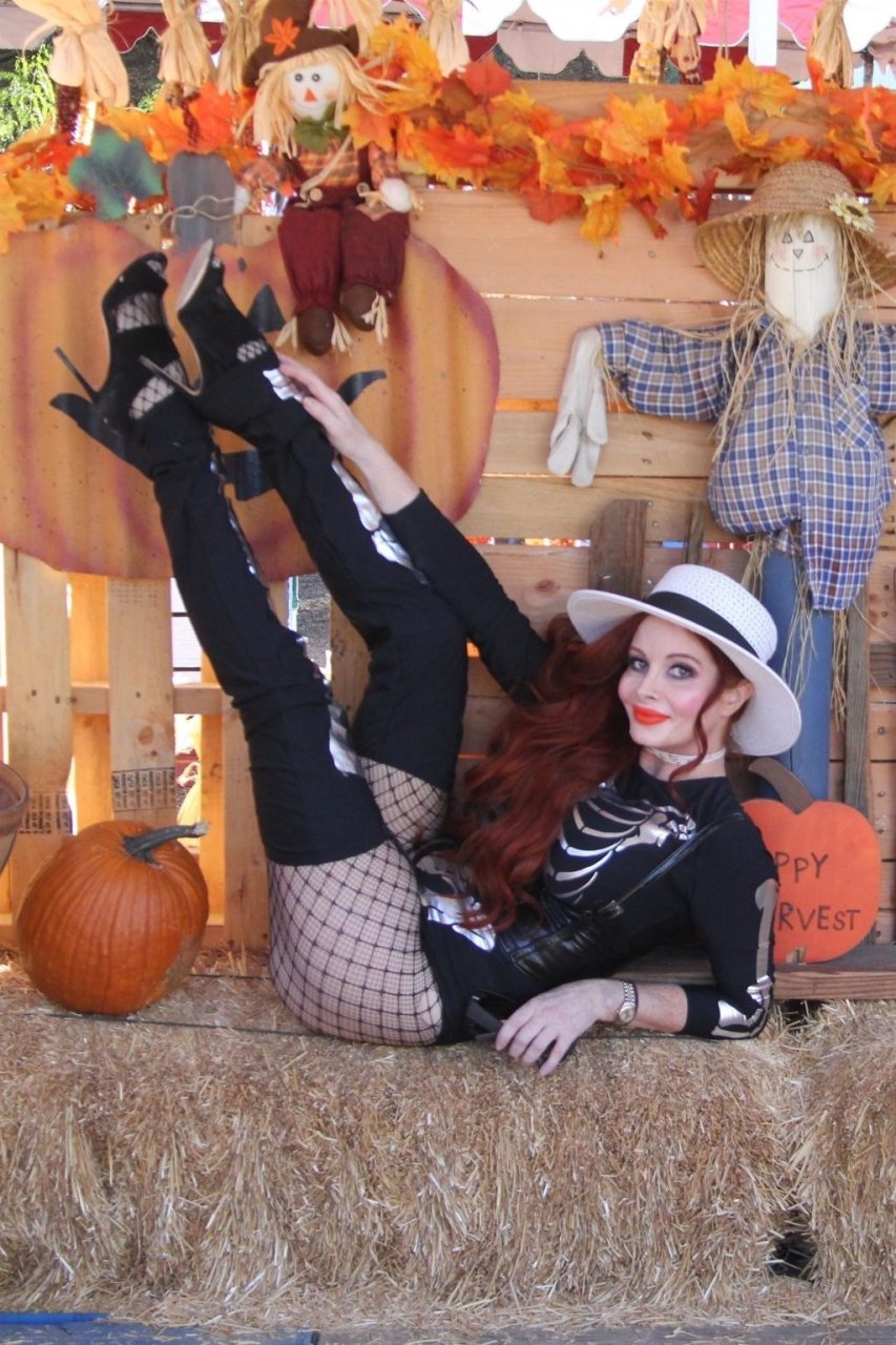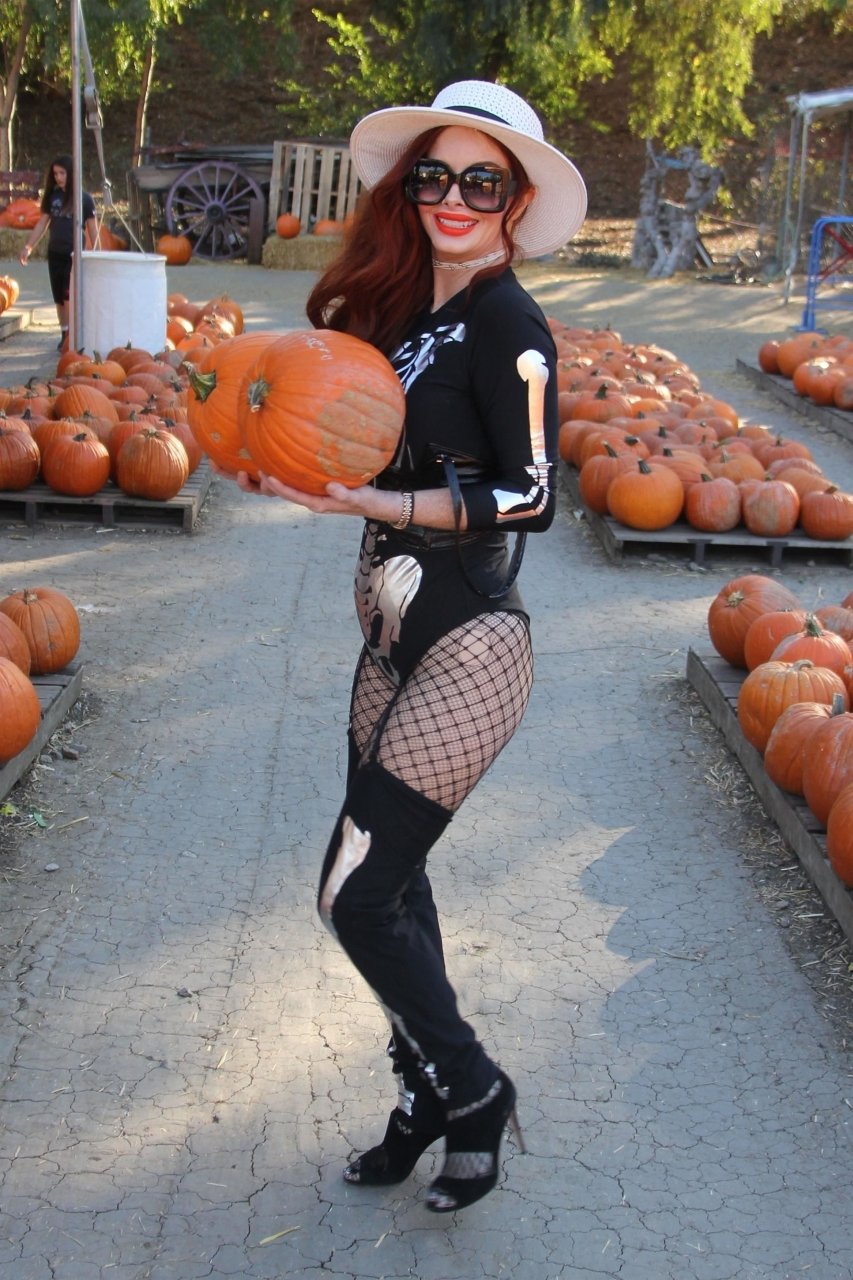 A atriz Phoebe Price foi vista posando como um esqueleto na plantação de abóboras em Los Angeles, 17/10/2018.