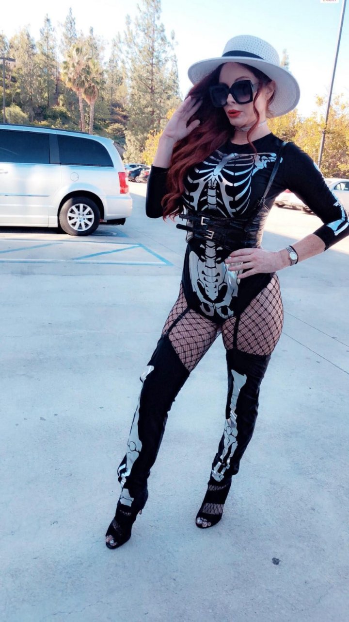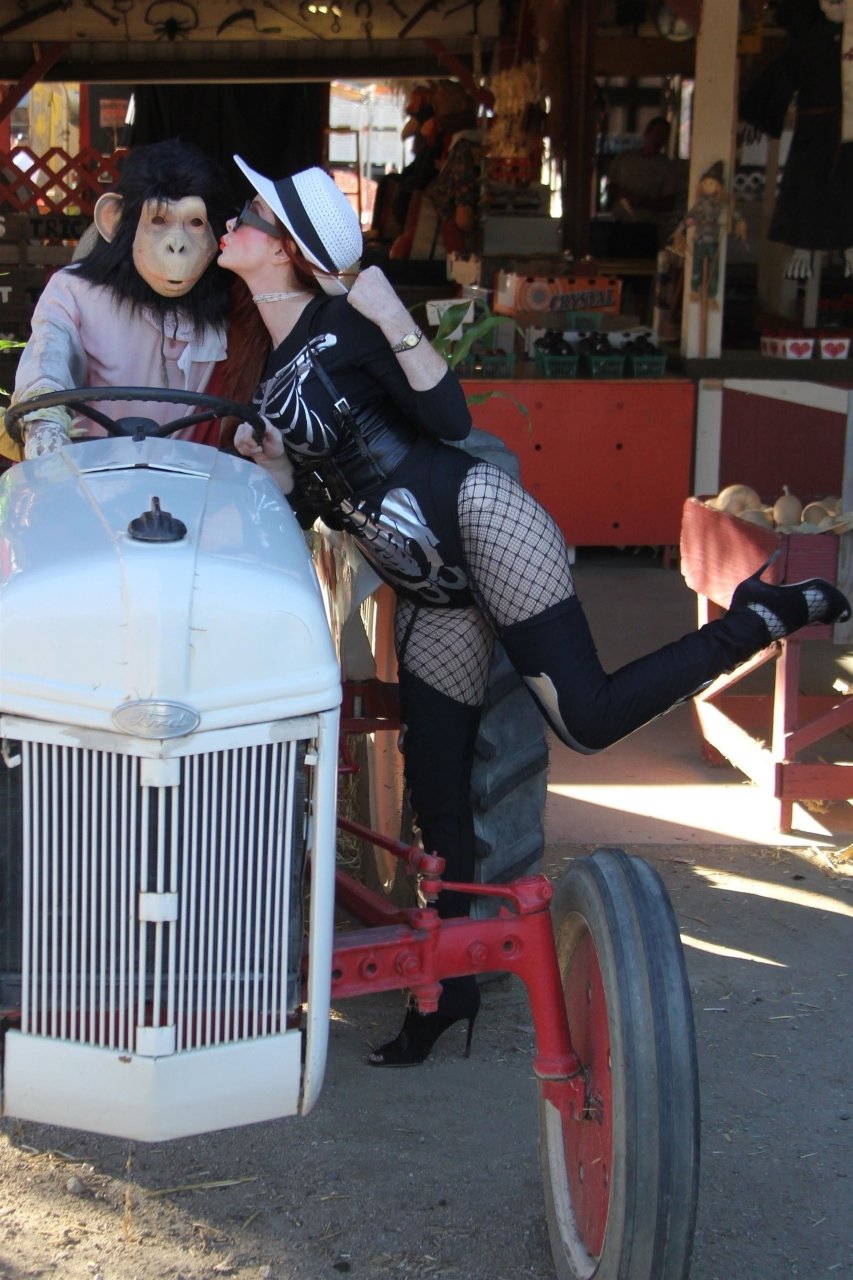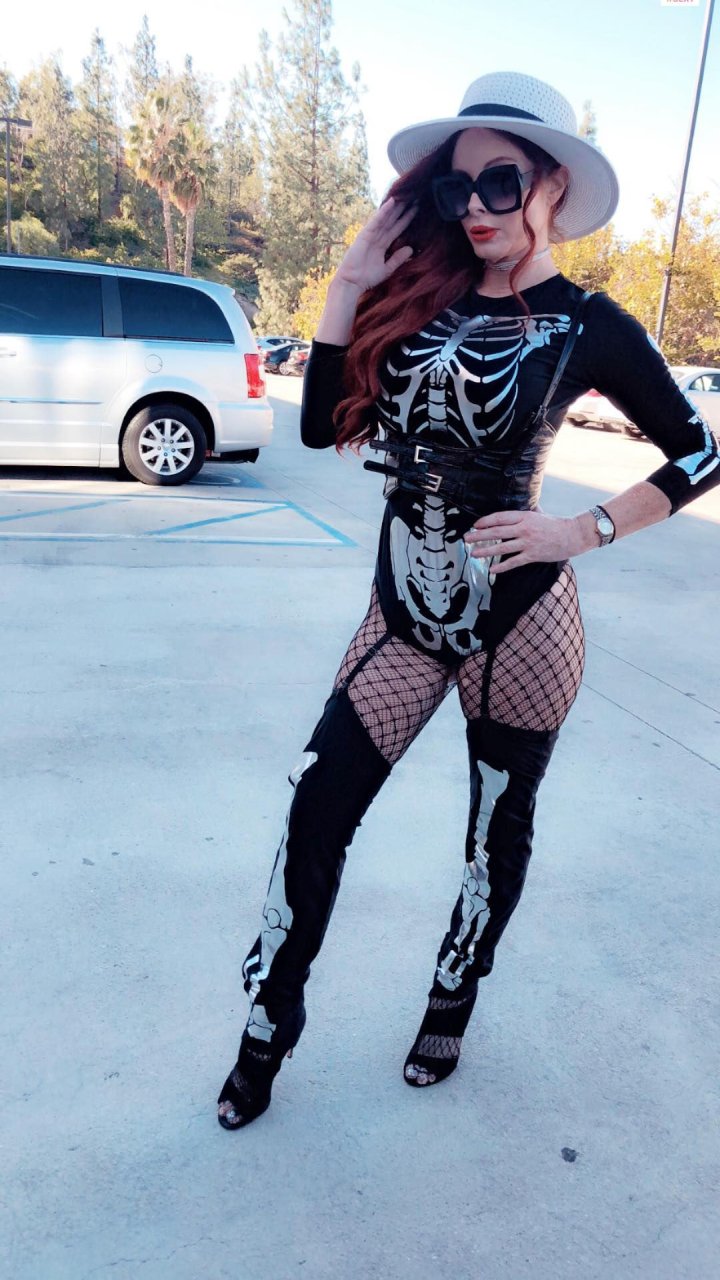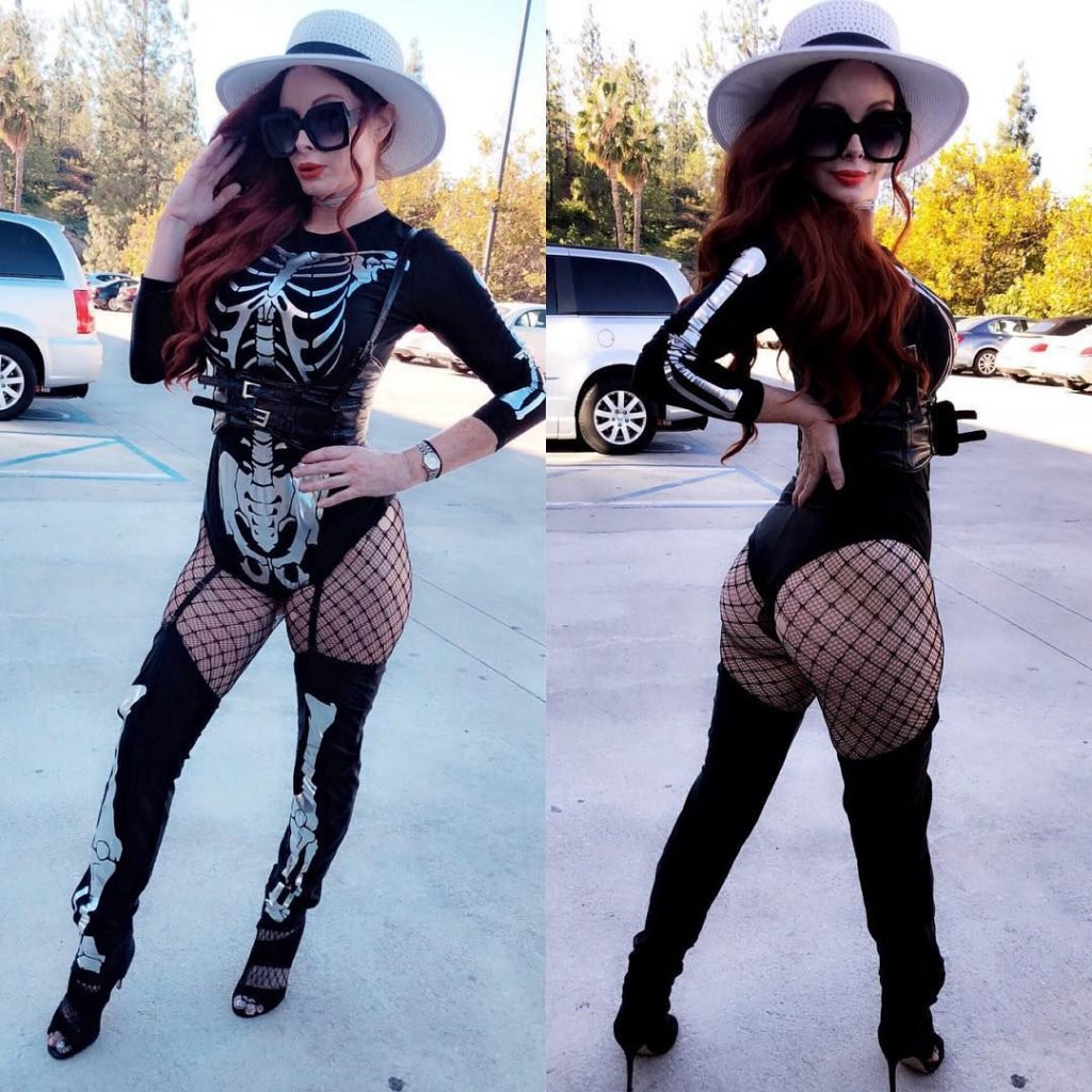A atriz Phoebe Price foi vista posando como um esqueleto na plantação de abóboras em Los Angeles, 17/10/2018.
