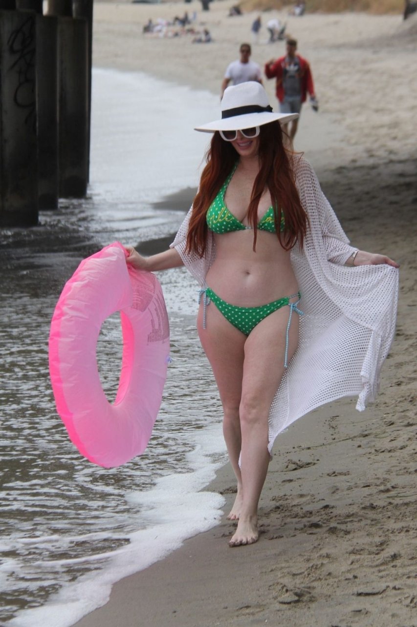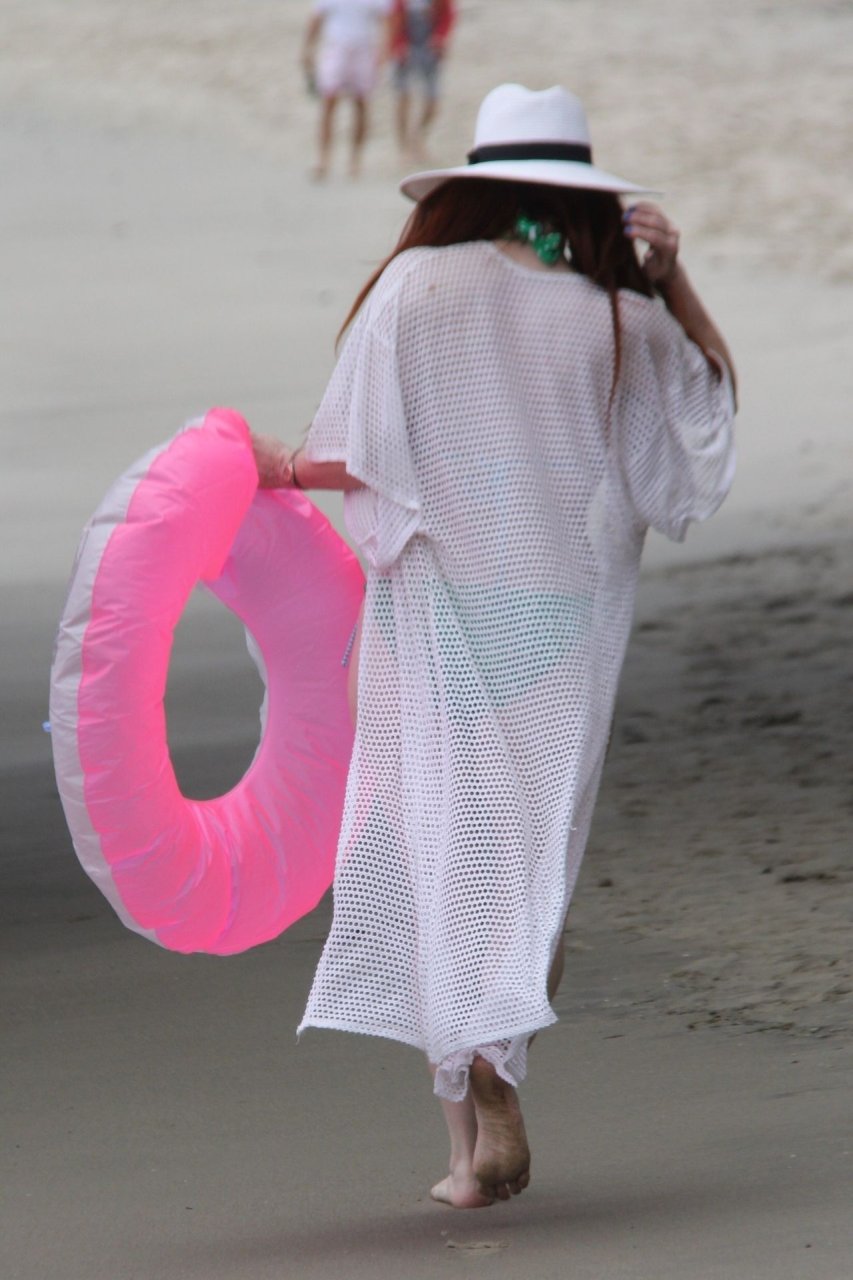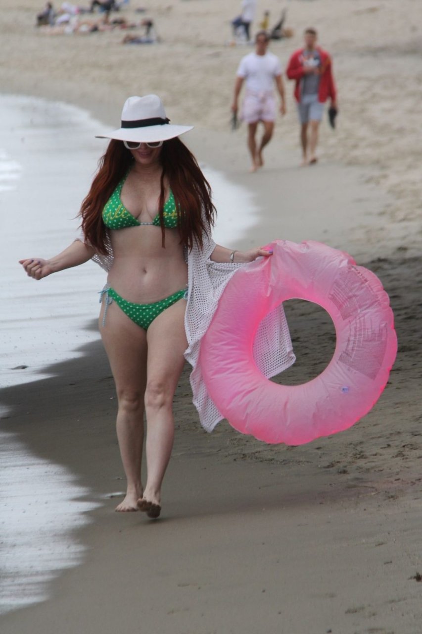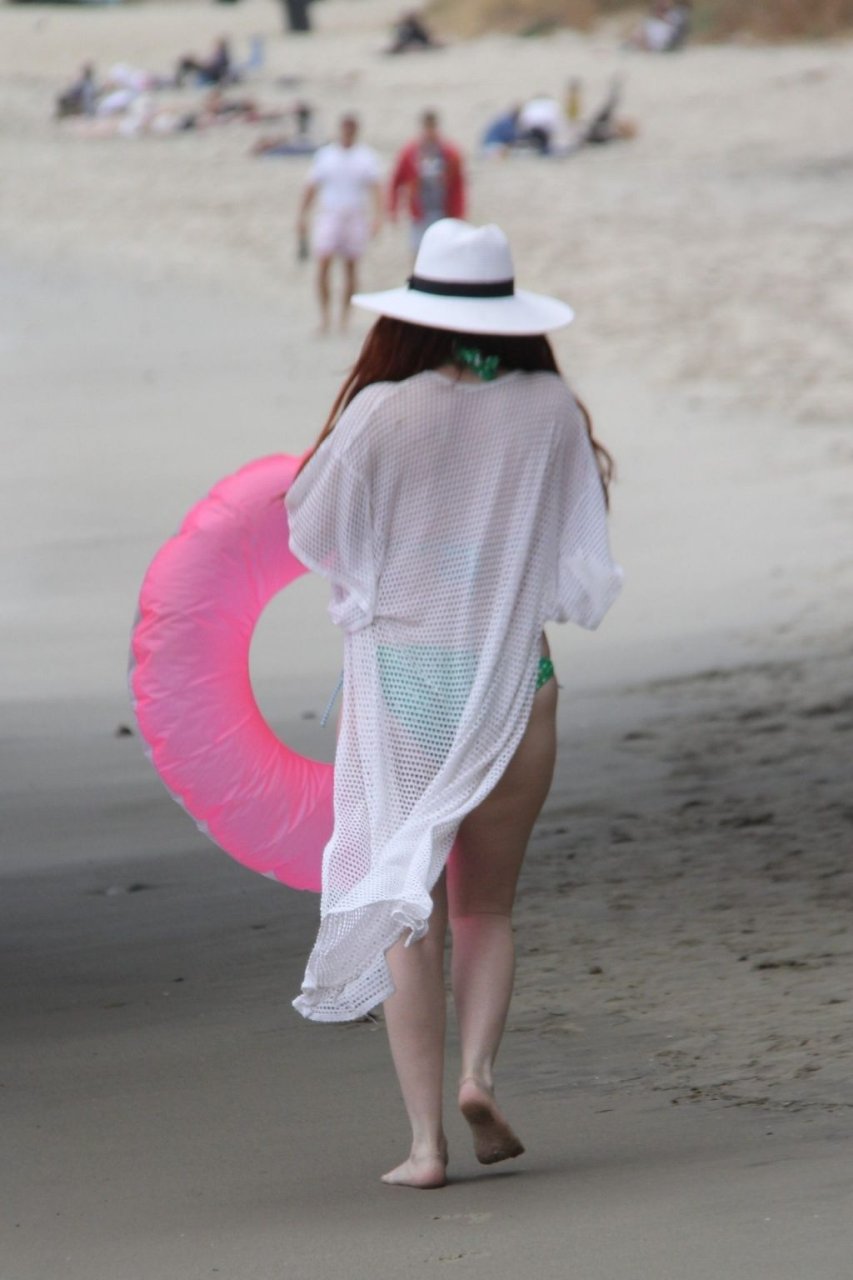 Phoebe Price aproveita ao máximo um dia nublado na praia em Malibu, 29/04/2019. A atriz posa de biquíni verde com uma boia rosa e chapéu branco de aba larga.