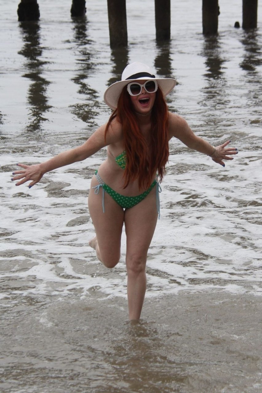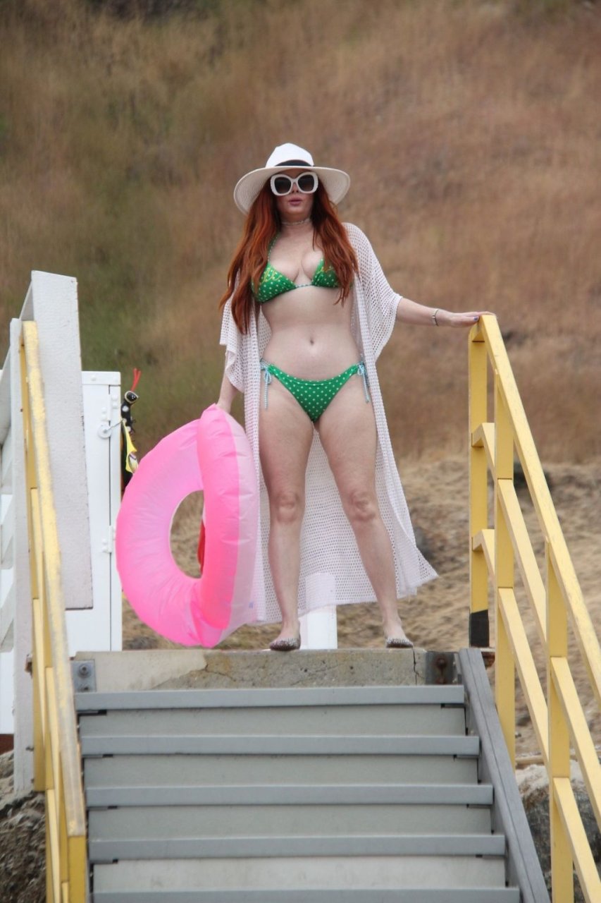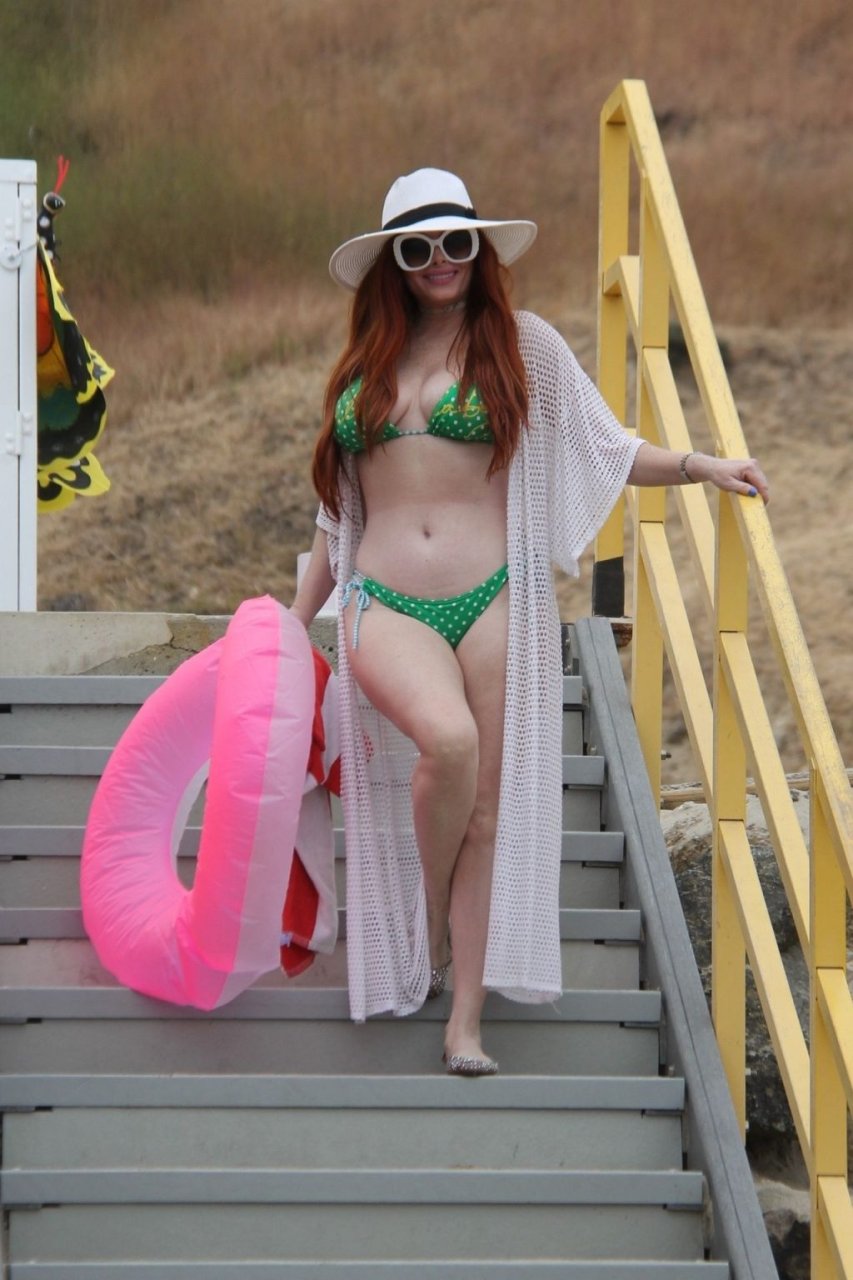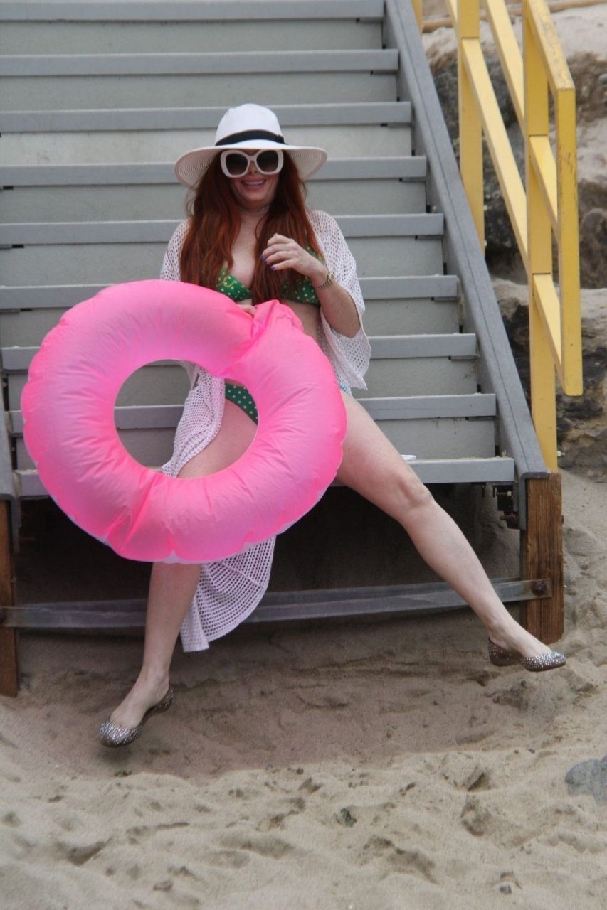 Phoebe Price aproveita ao máximo um dia nublado na praia em Malibu, 29/04/2019. A atriz posa de biquíni verde com uma boia rosa e chapéu branco de aba larga.