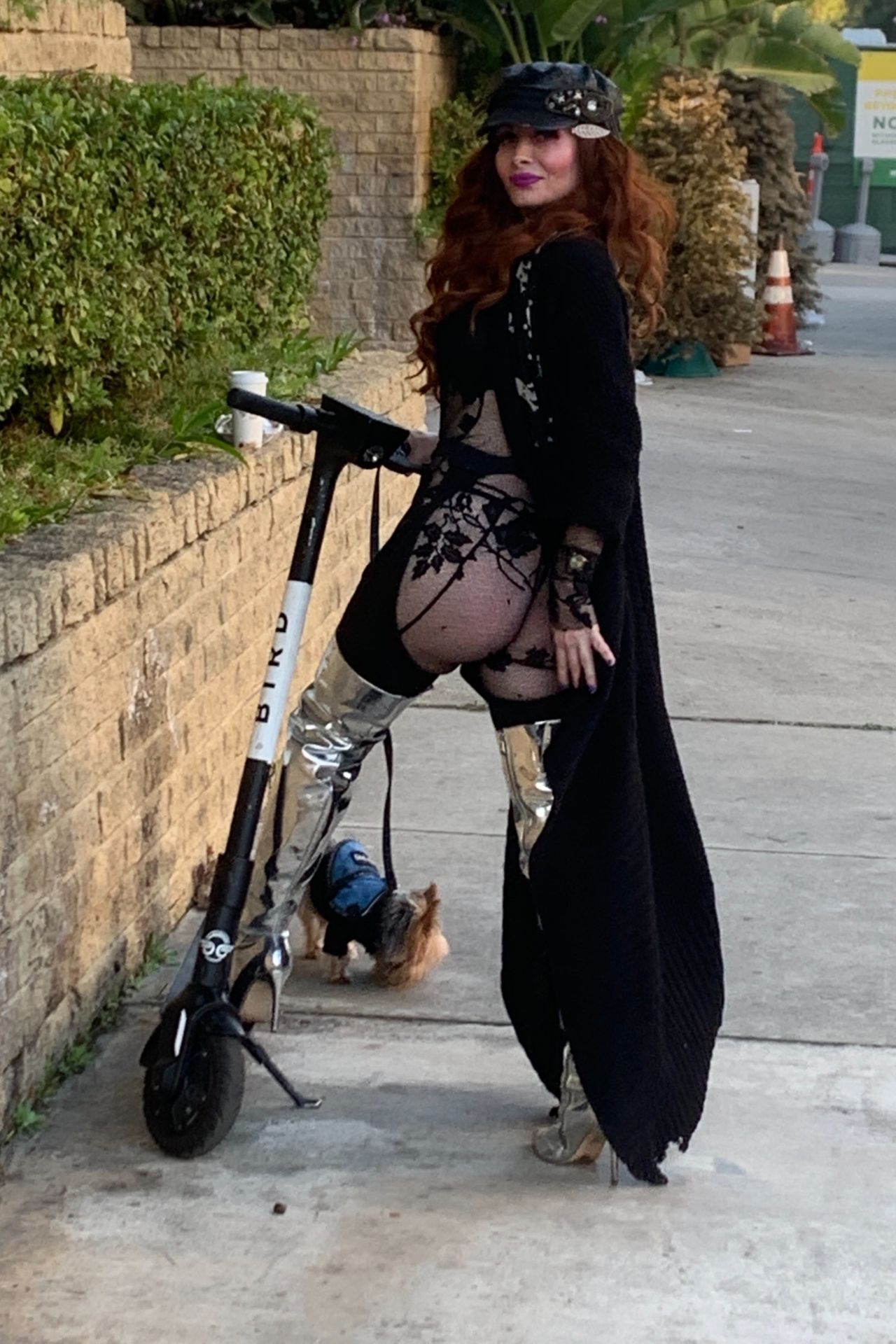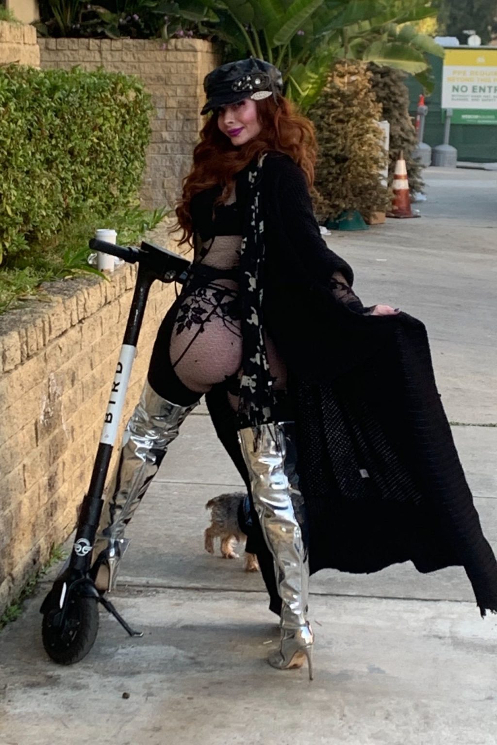 Atriz Phoebe Price não deixa nada para a imaginação, usando uma calcinha fio dental, enquanto passeia com seu cachorro em uma scooter pela cidade em Los Angeles, 22/01/2020.