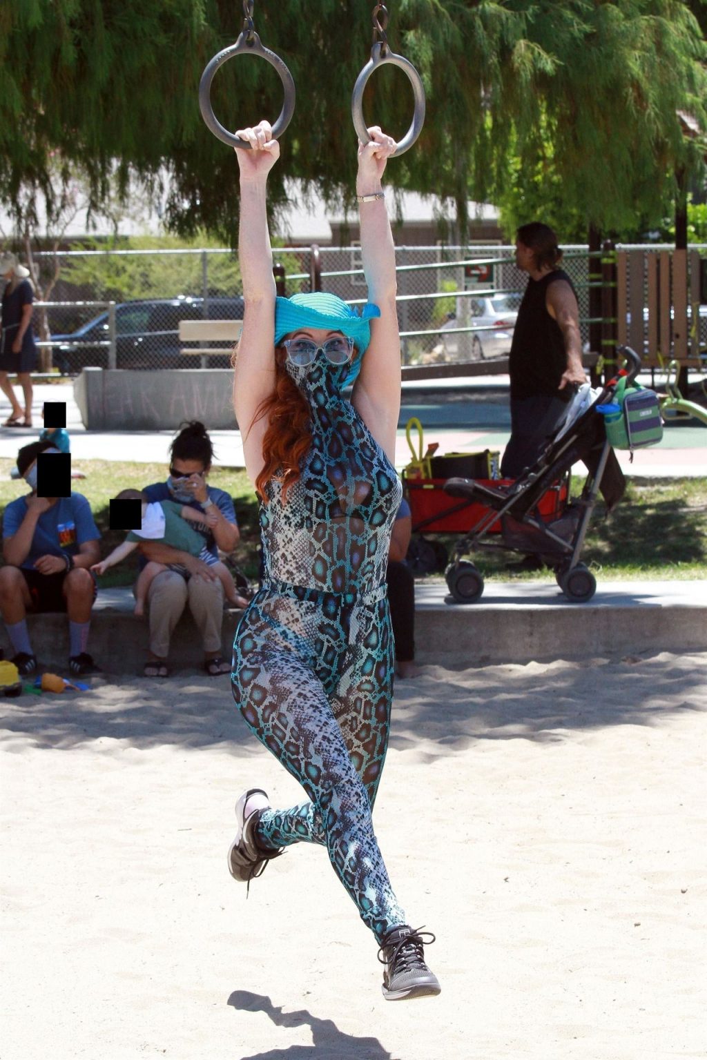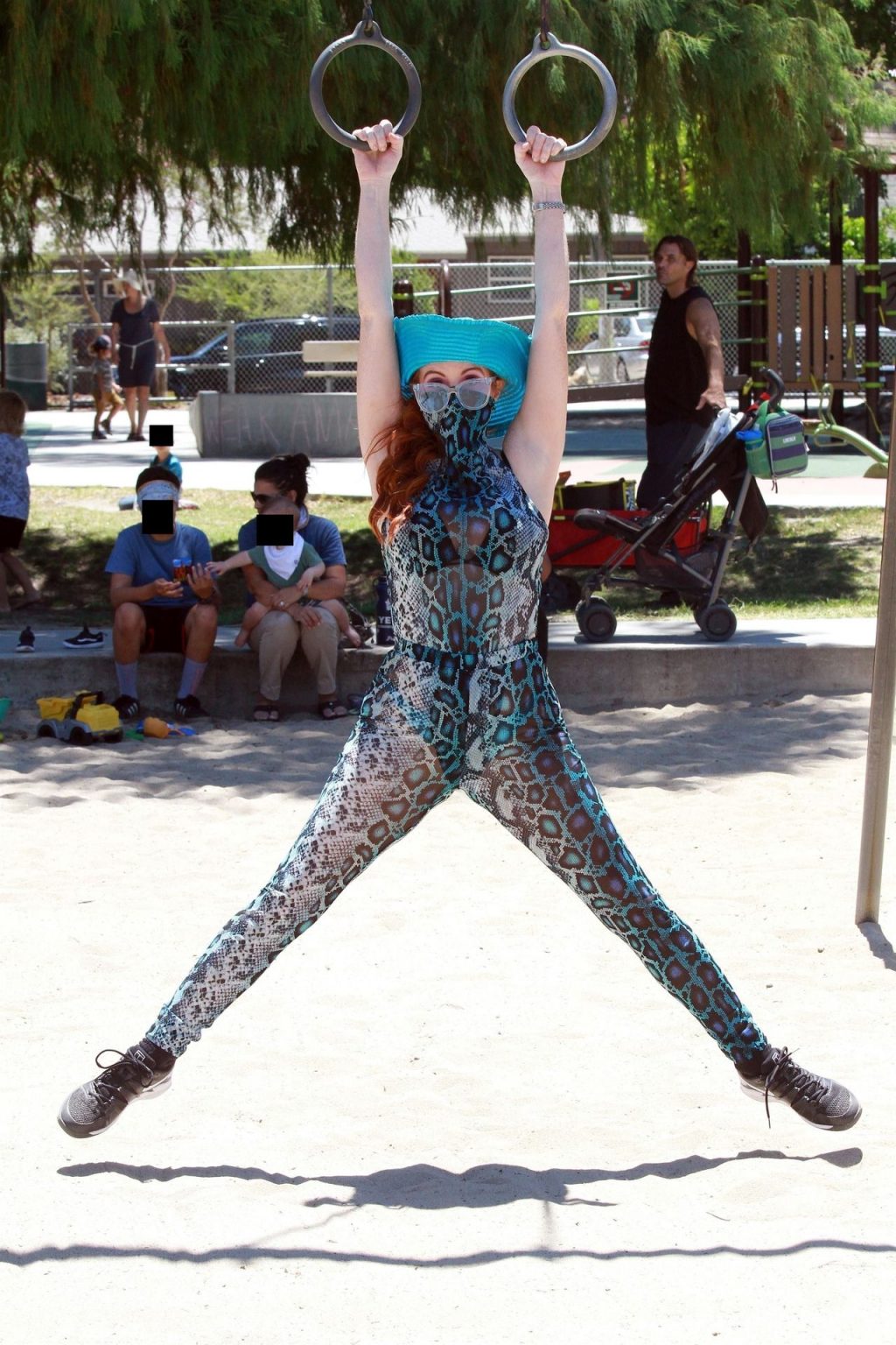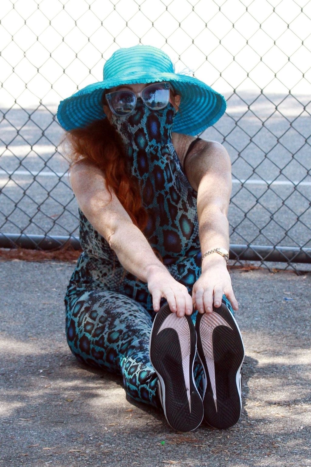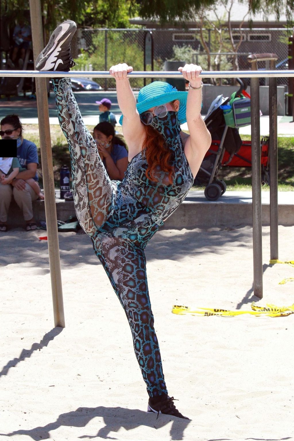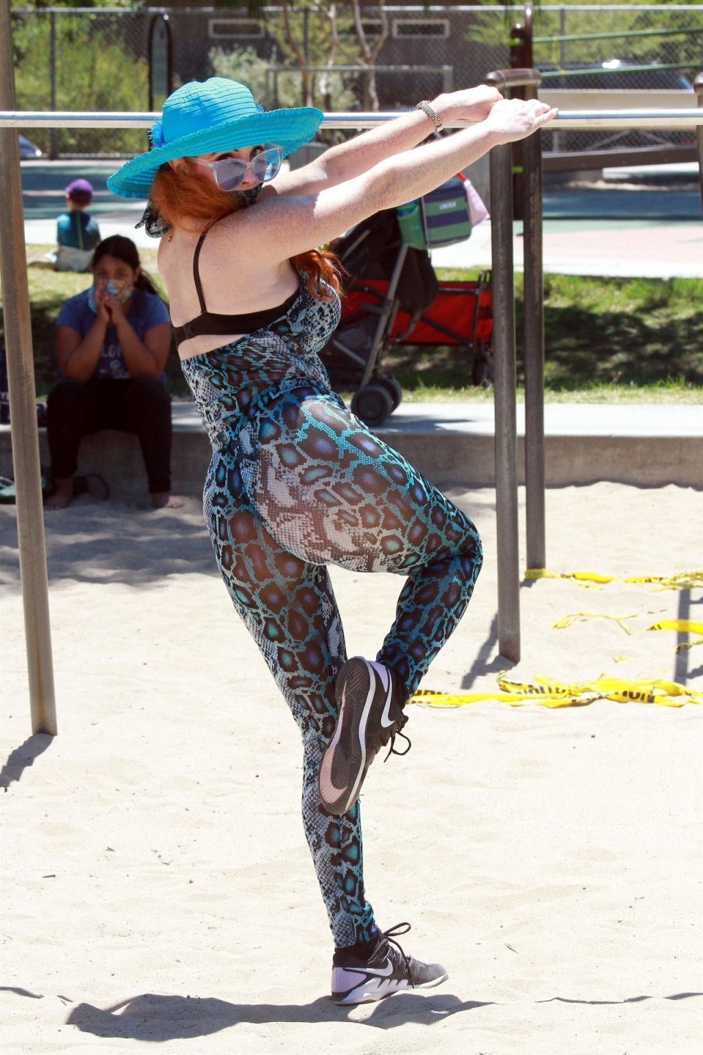 Atriz Phoebe Price é vista posando com um conjunto turquesa com estampa animal no parque para seu treino – Studio City, 17/07/2020.