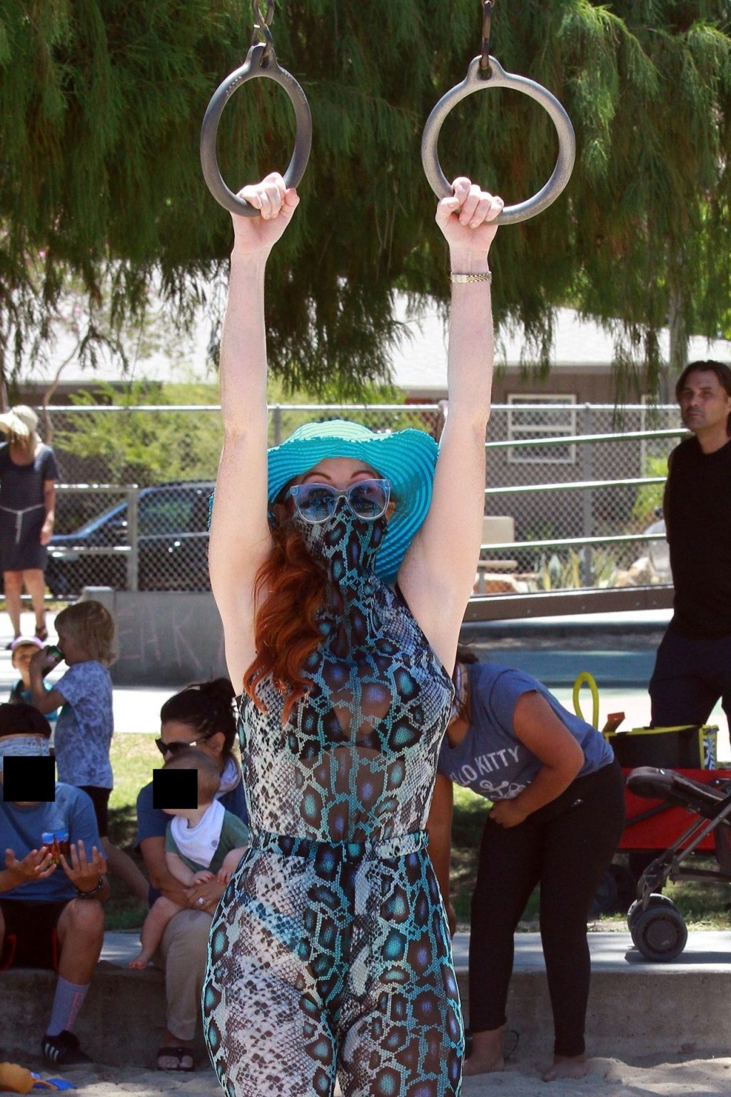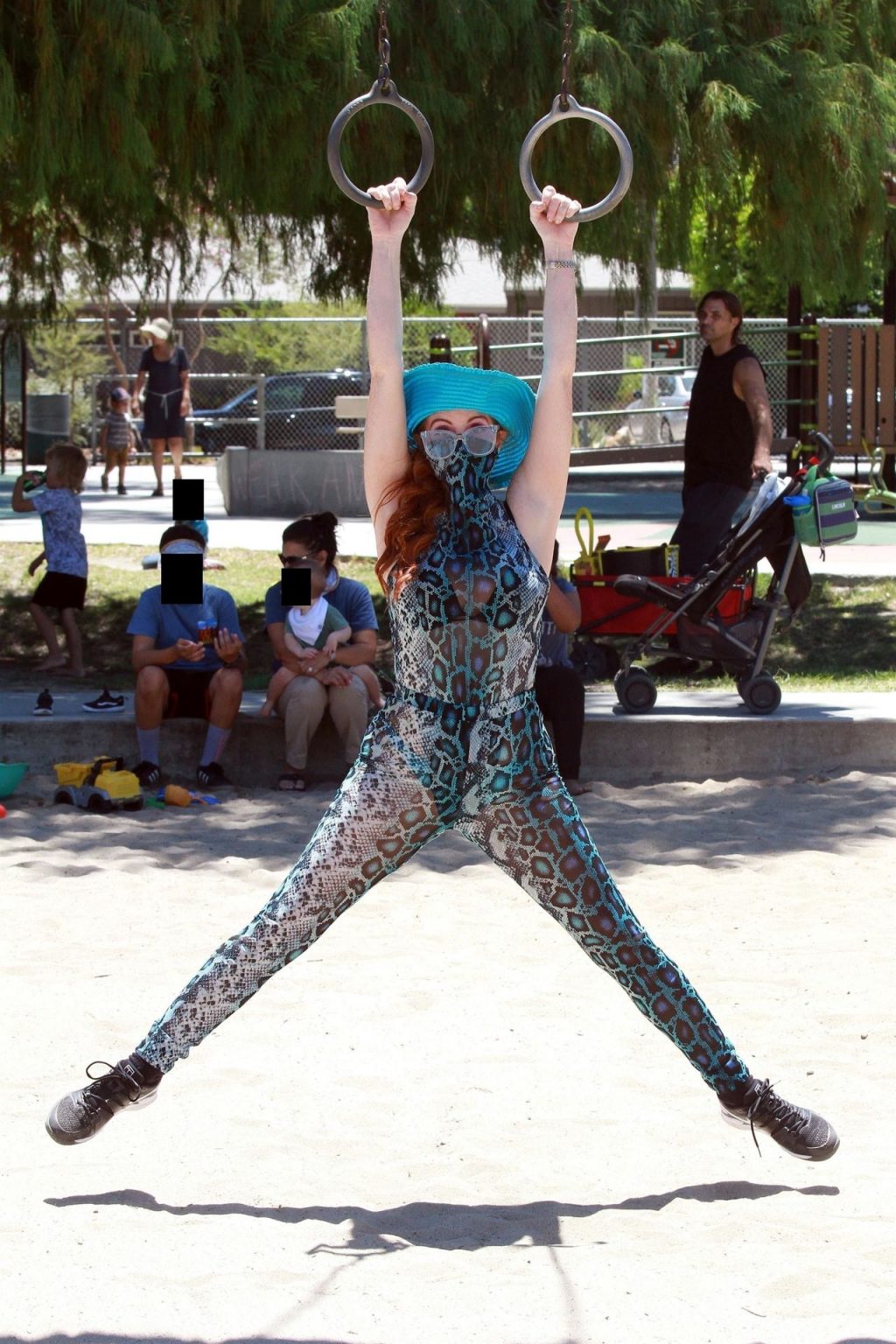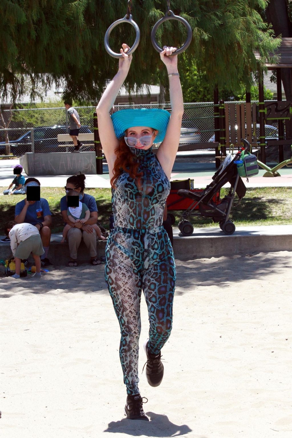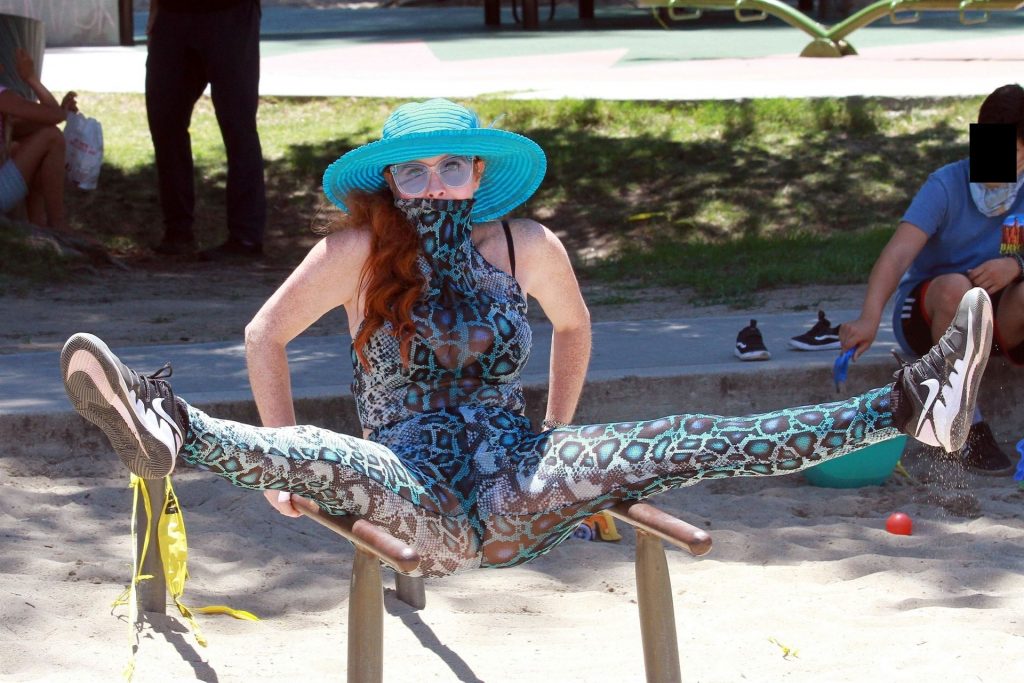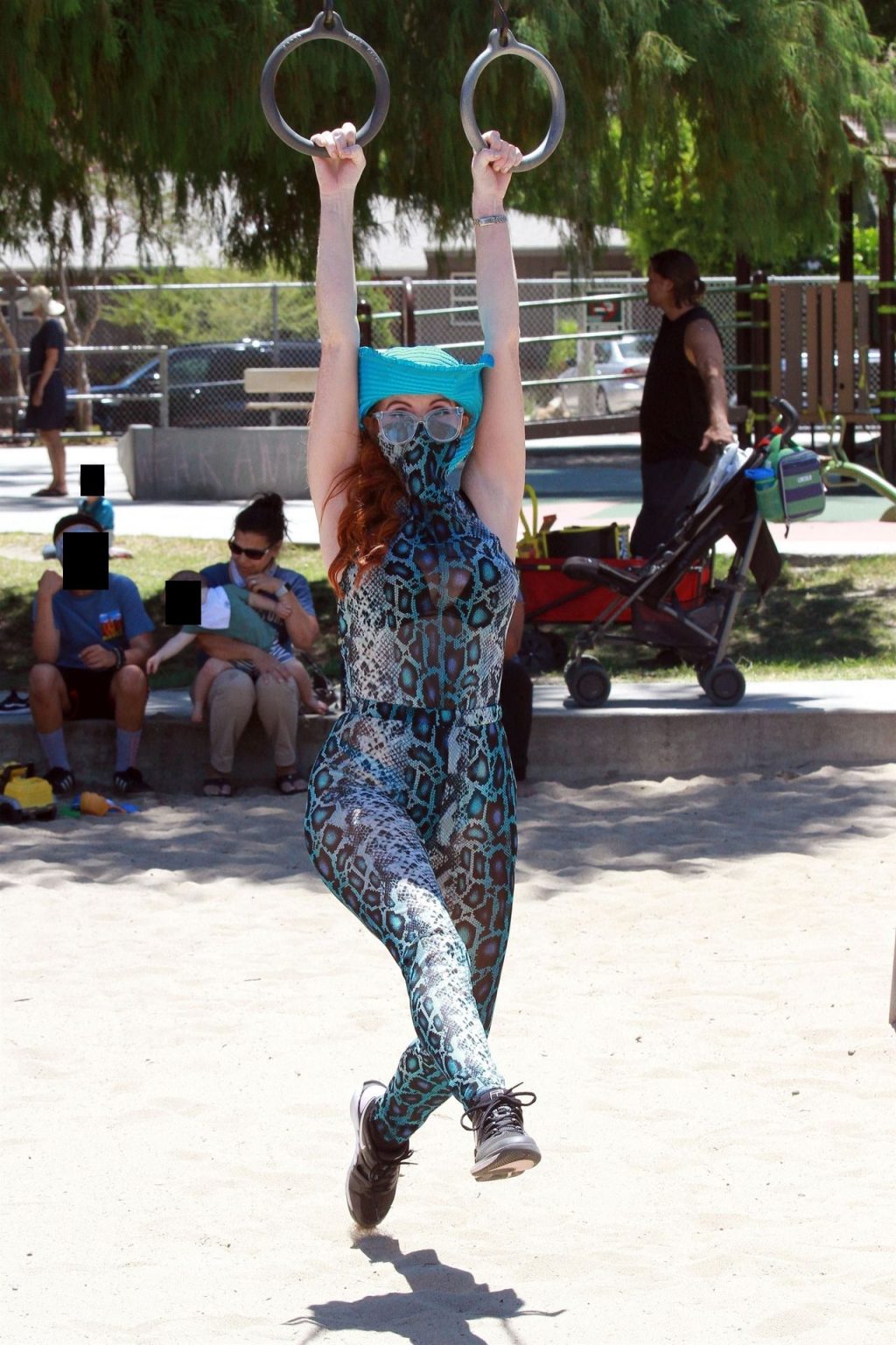 Atriz Phoebe Price é vista posando com um conjunto turquesa com estampa animal no parque para seu treino – Studio City, 17/07/2020.